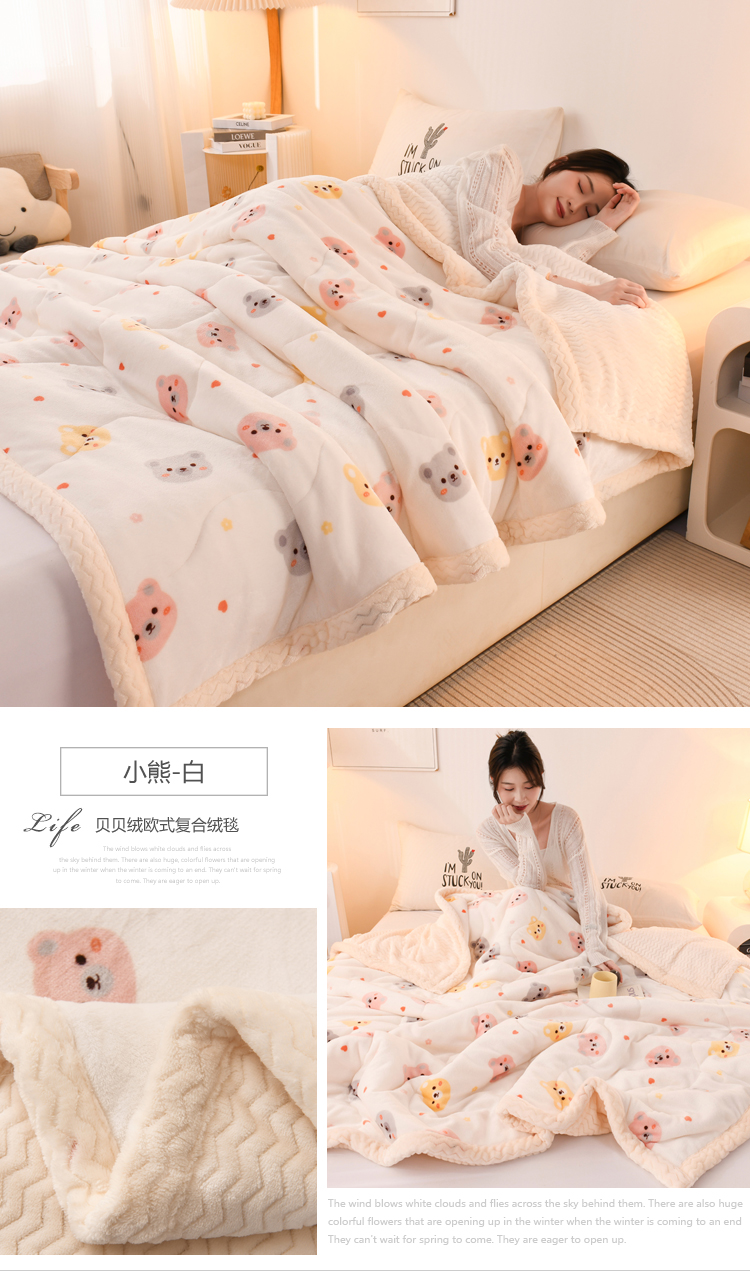 电商爆款·三层夹棉牛奶绒印花毛毯卡通秋冬午睡毯多功能盖毯可机洗毯子,印花款-兔子熊-白,印花款-兔子熊-灰,印花款-快乐熊-白,印花款-快乐熊-灰,印花款-蓝格-白,印花款-蓝格-灰,印花款-爱心-白,印花款-甜橙-白,印花款-小熊-白,印花款-黑格-白