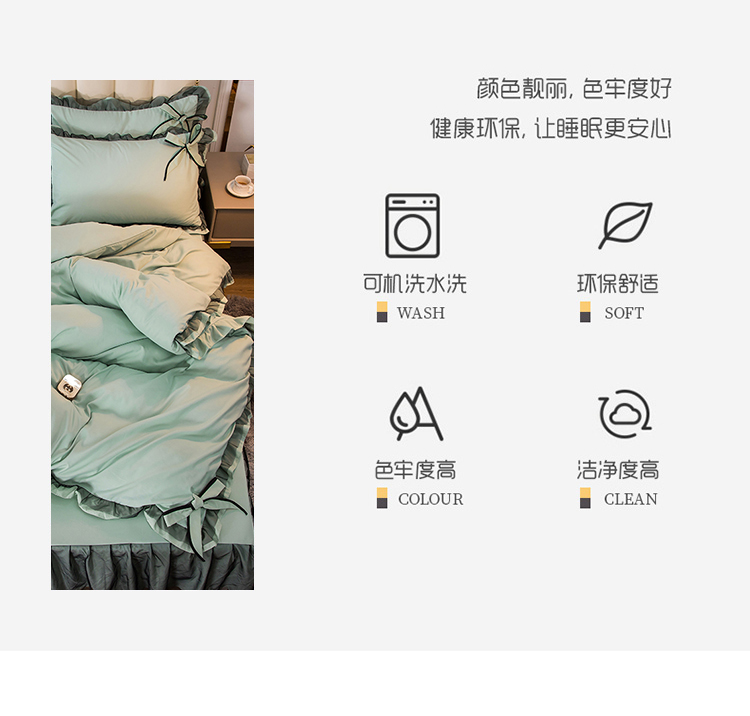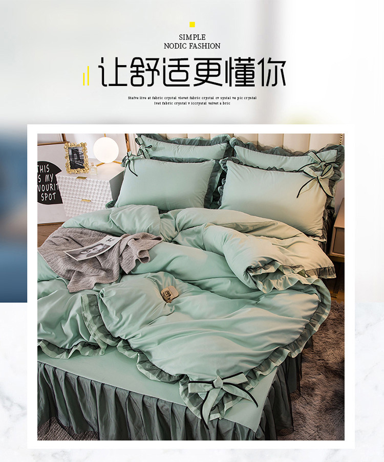 金米诺 新款韩版花边水洗棉泡泡纱四件套公主条四件套 褶皱-浅绿,褶皱-浅绿