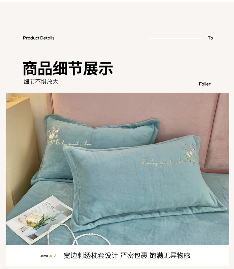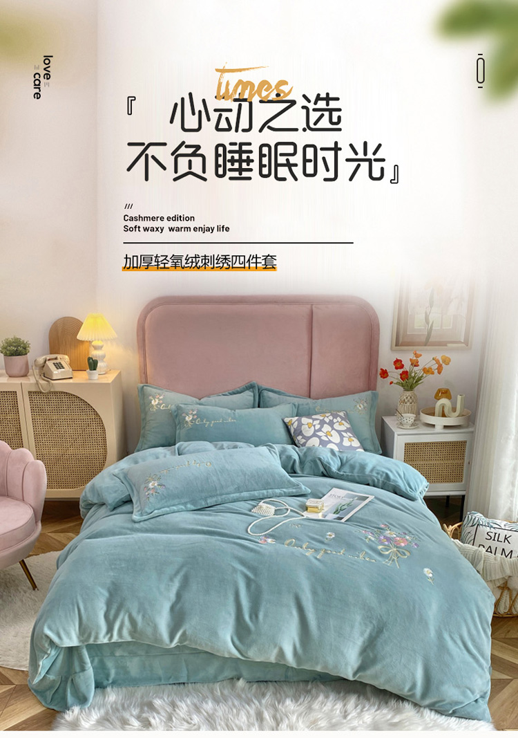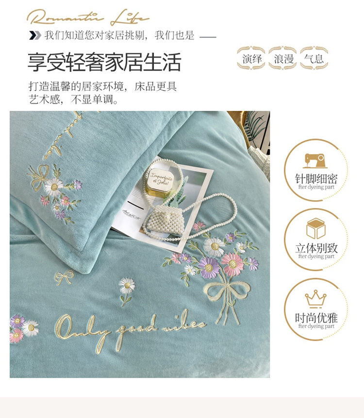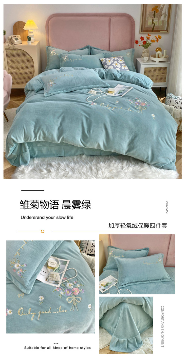星尚家纺 2021新款轻氧绒A类牛奶棉绒加厚绣花四件套 晨雾绿
