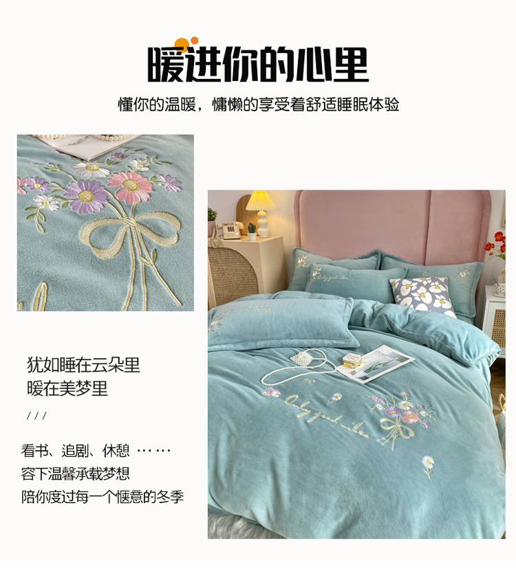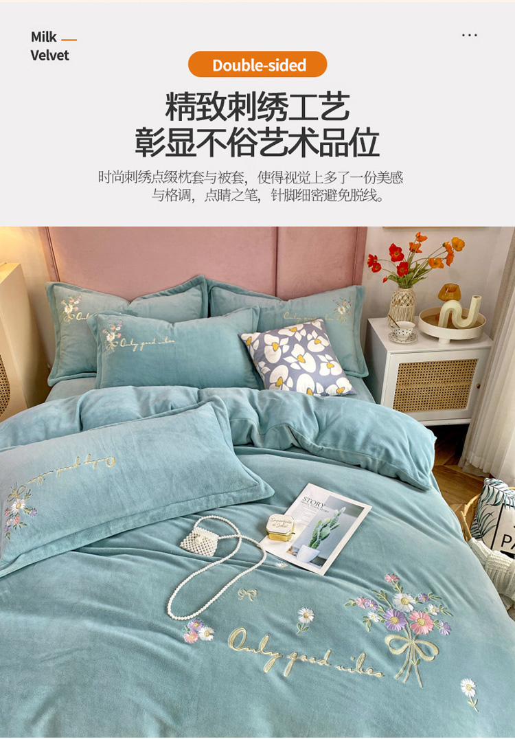 (总)星尚家纺 2024新款全消光A类230g牛奶绒韩版绣花绒四件套-绚丽花语,豆沙粉,浪漫紫,雾霾蓝,樱花粉,晨雾绿