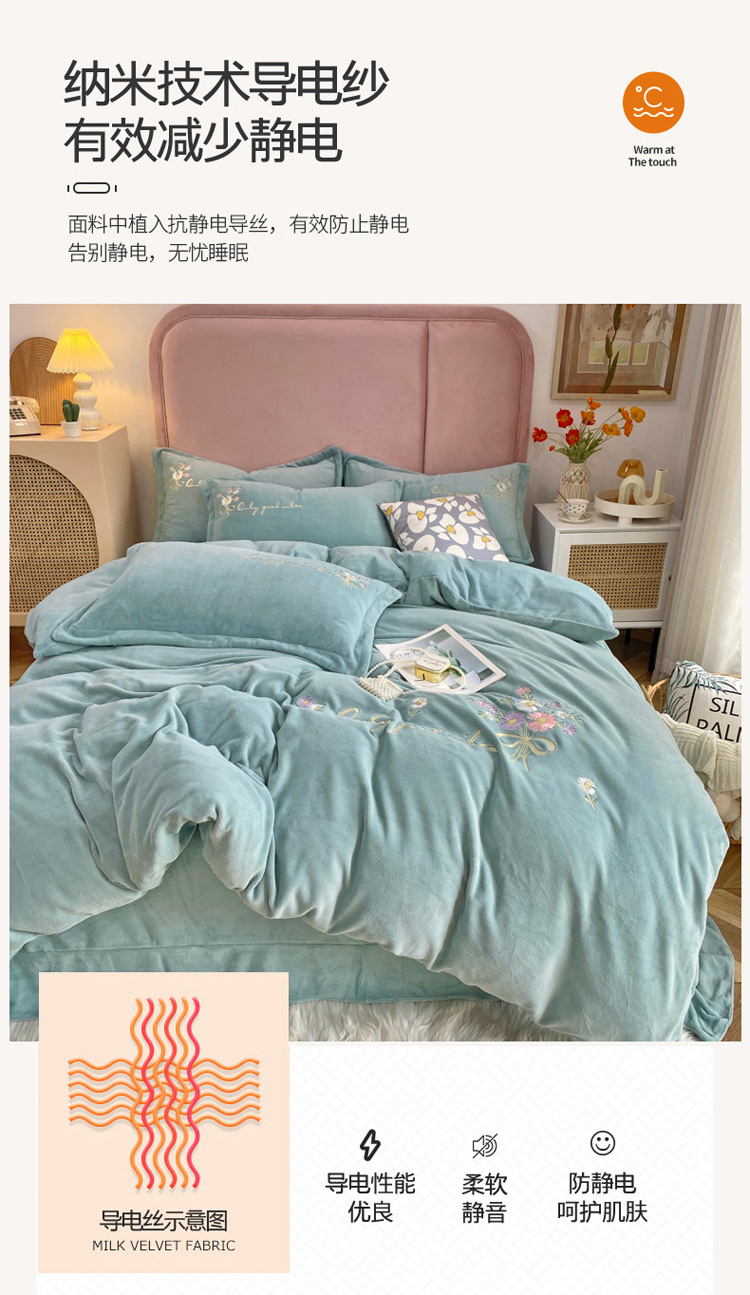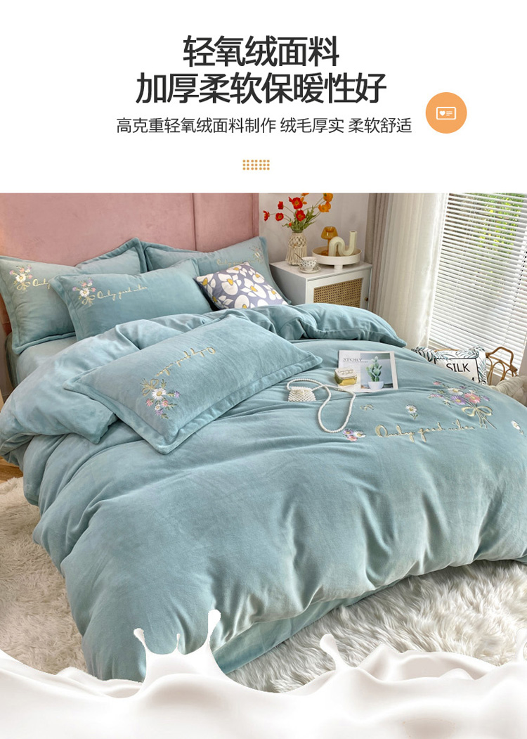 商品名称:星尚家纺 2021新款轻氧绒A类牛奶棉绒加厚绣花四件套 晨雾绿