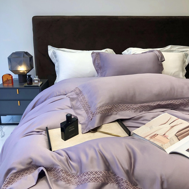 商品名称:太古汇家居 2022新款60天丝镂空蔚蓝系列四件套 蔚蓝-浅紫灰