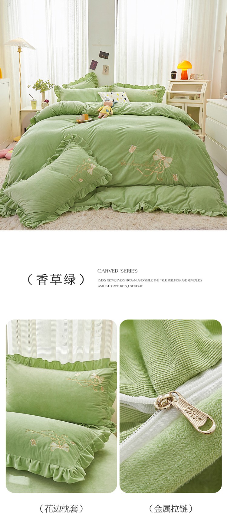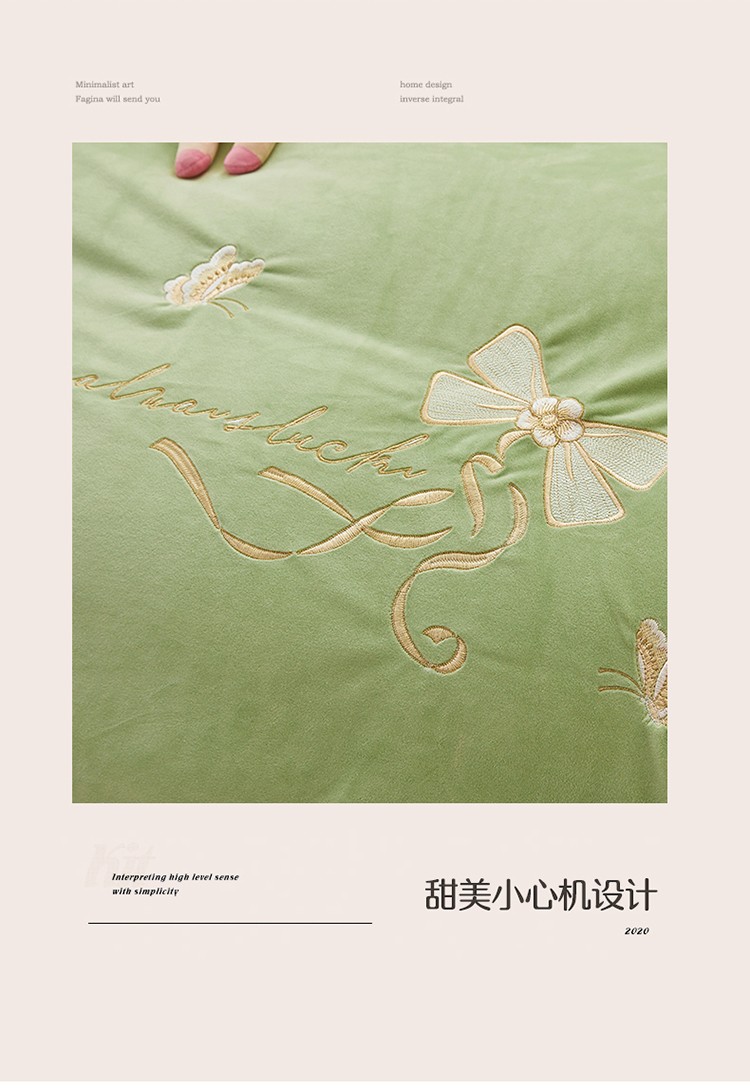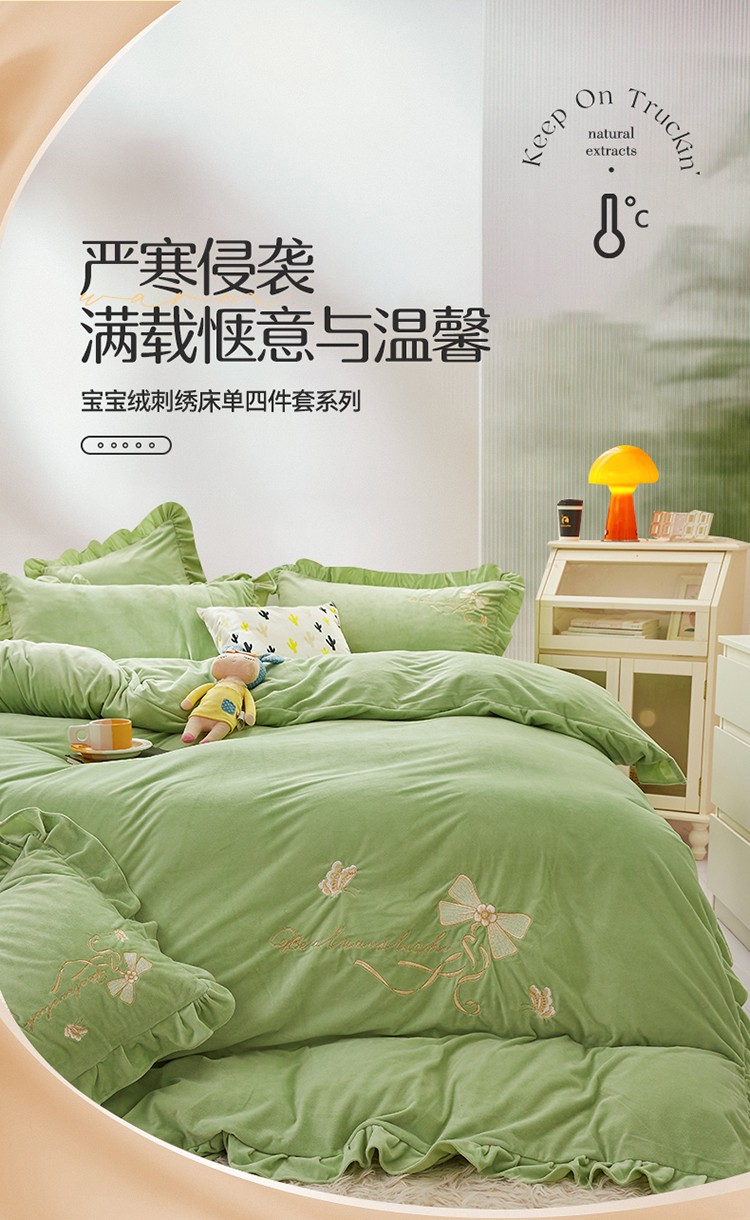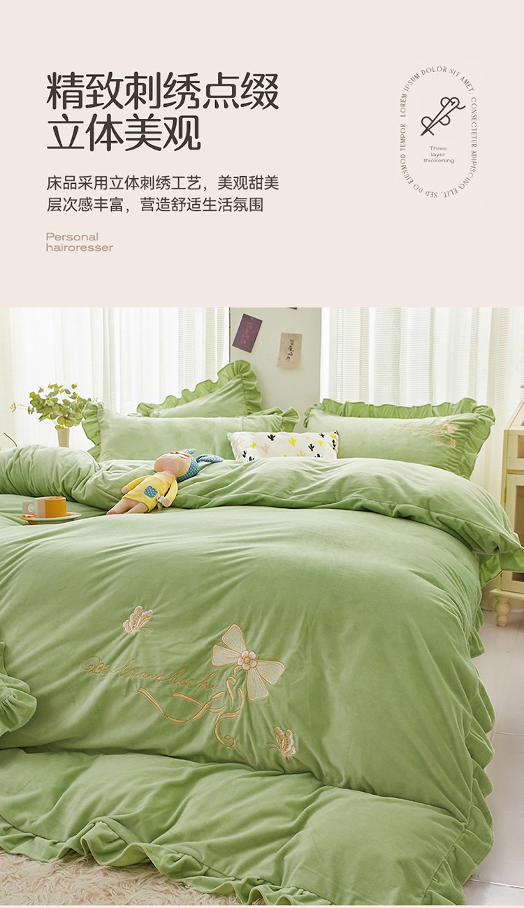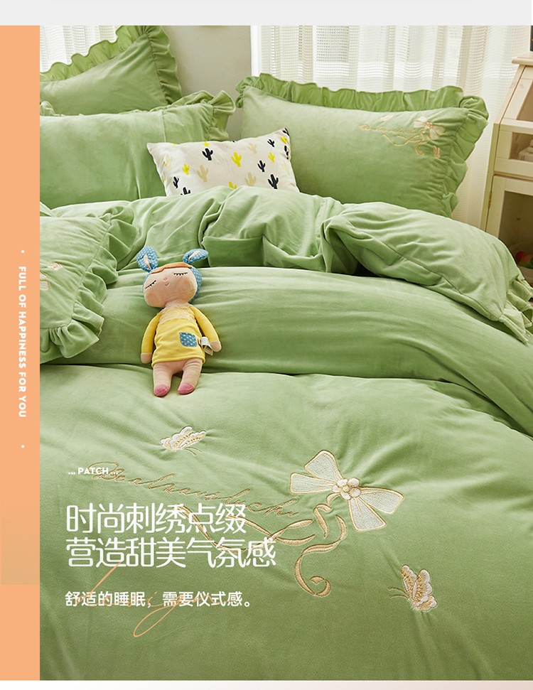 商品名称:恒爱 2022秋冬新款A类宝宝绒蝴蝶结刺绣床单款四件套 香草绿