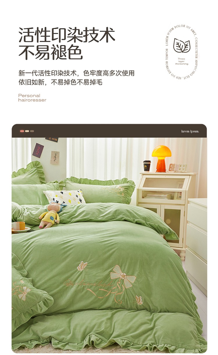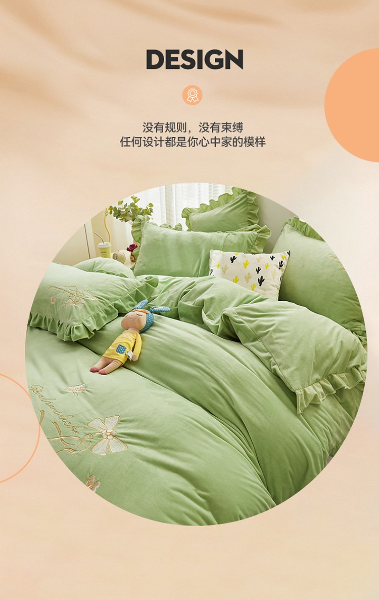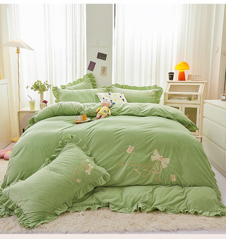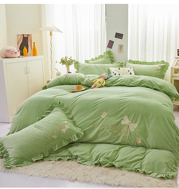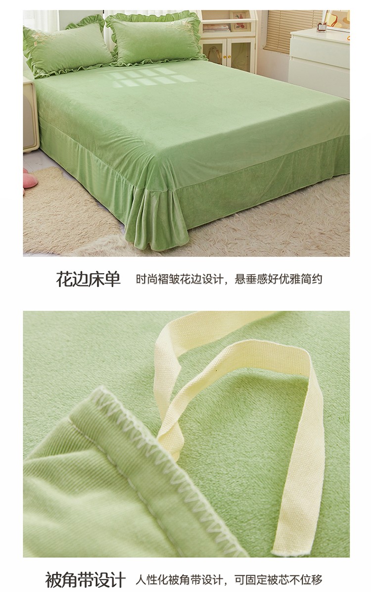商品名称:恒爱 2022秋冬新款A类宝宝绒蝴蝶结刺绣床单款四件套 香草绿