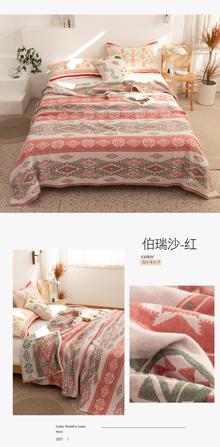 商品名称:朴尔 2023年波西米亚风全棉四层纱布毛巾被 伯瑞沙-红