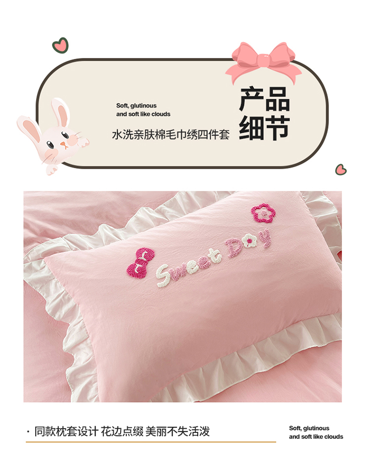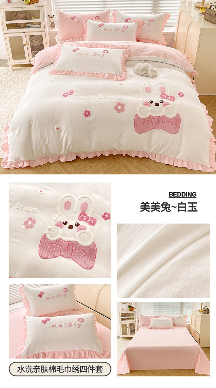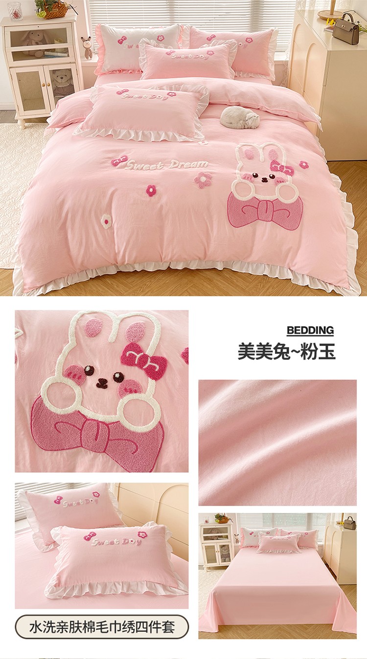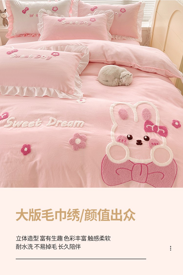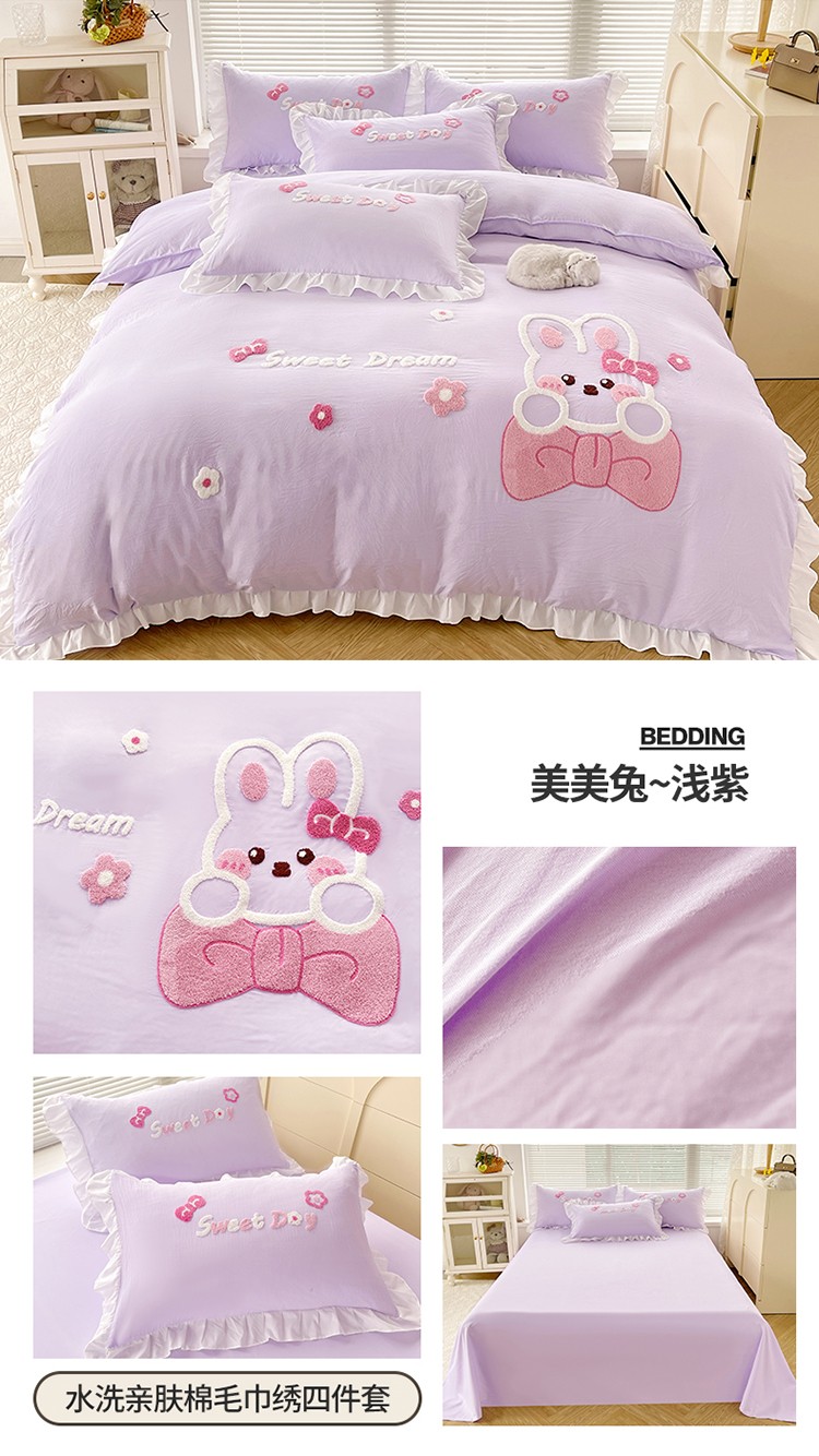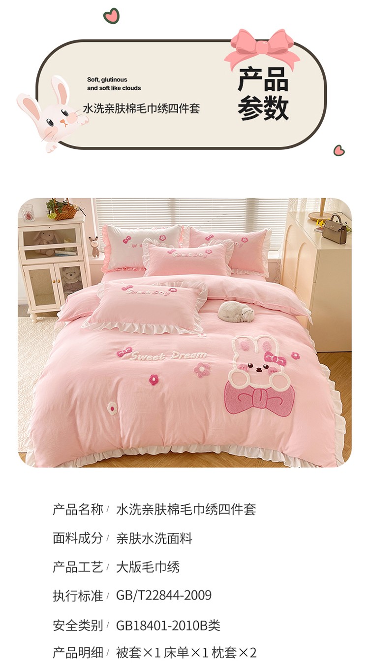 当前位置: 91家纺网 > 商品网购 > 床品套件 > 四件套 > 毛巾绣四件套 > (总)泉欣家纺 2024新款美美兔毛巾绣四件套(专版花型)