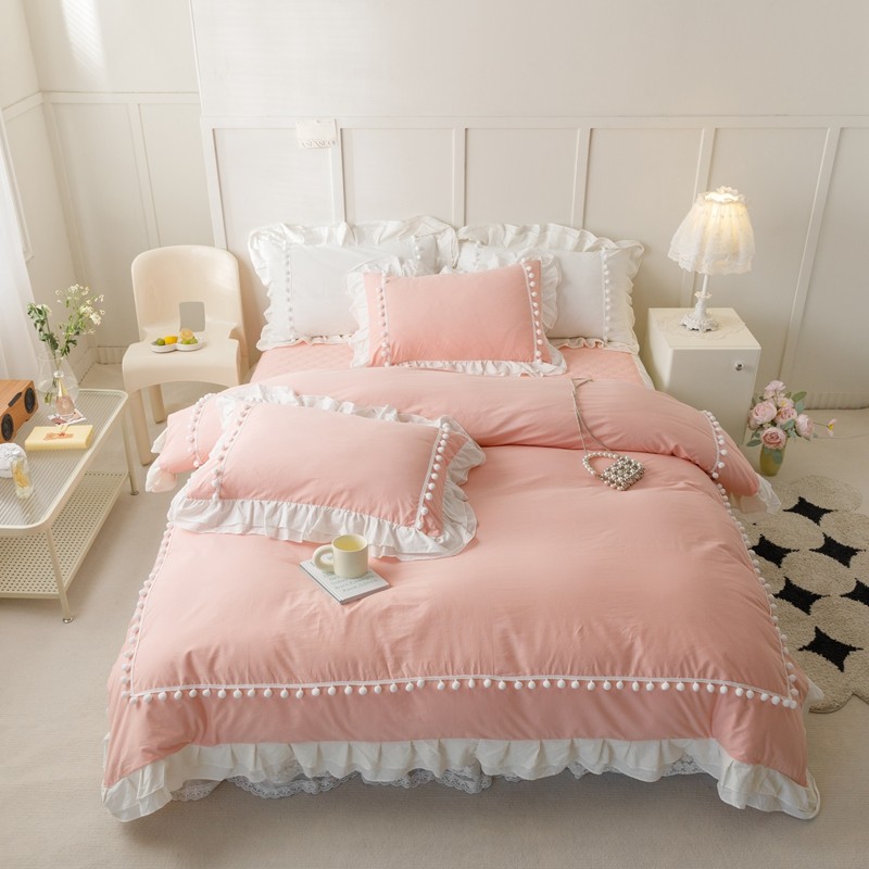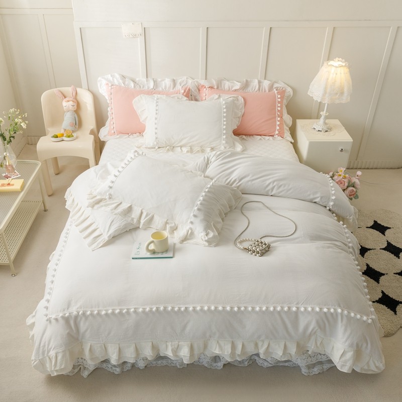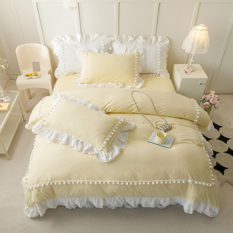 总北纬27度 2022法式双层花边全棉夹棉床裙四件套直播爆款,高级白,公主粉,海洋蓝,可爱黄