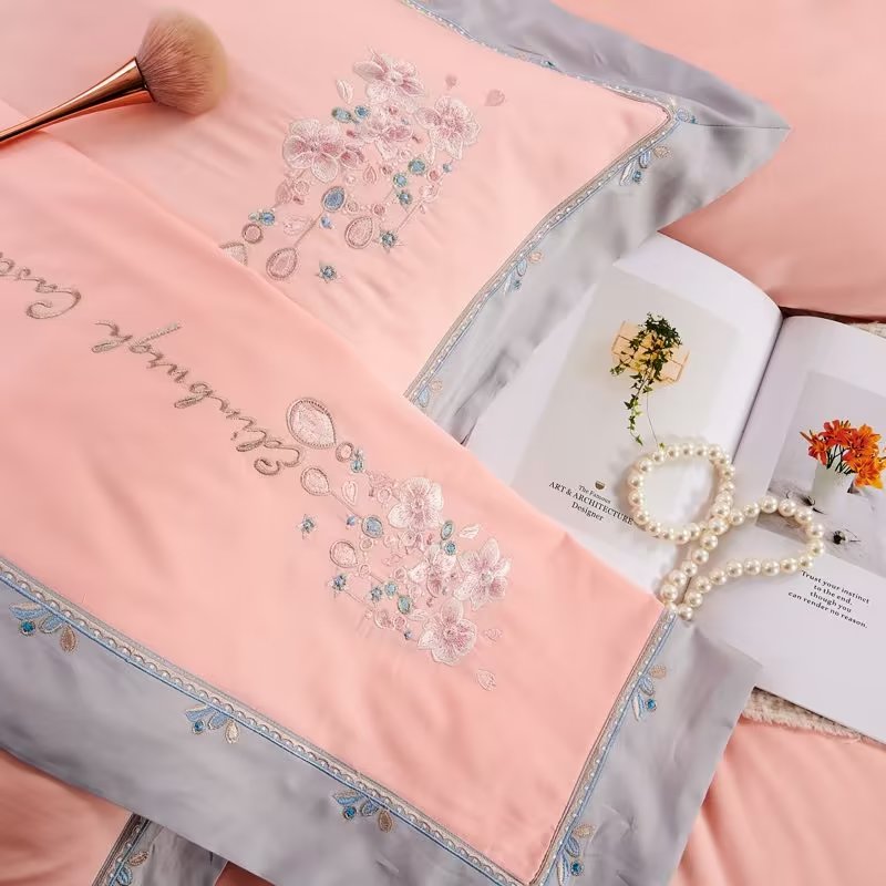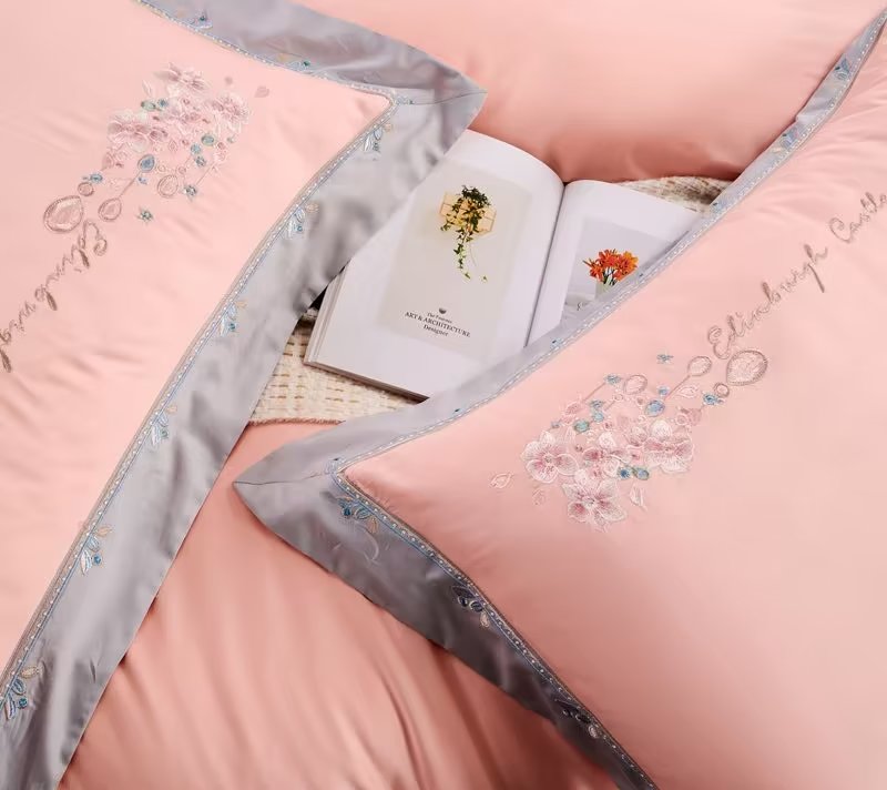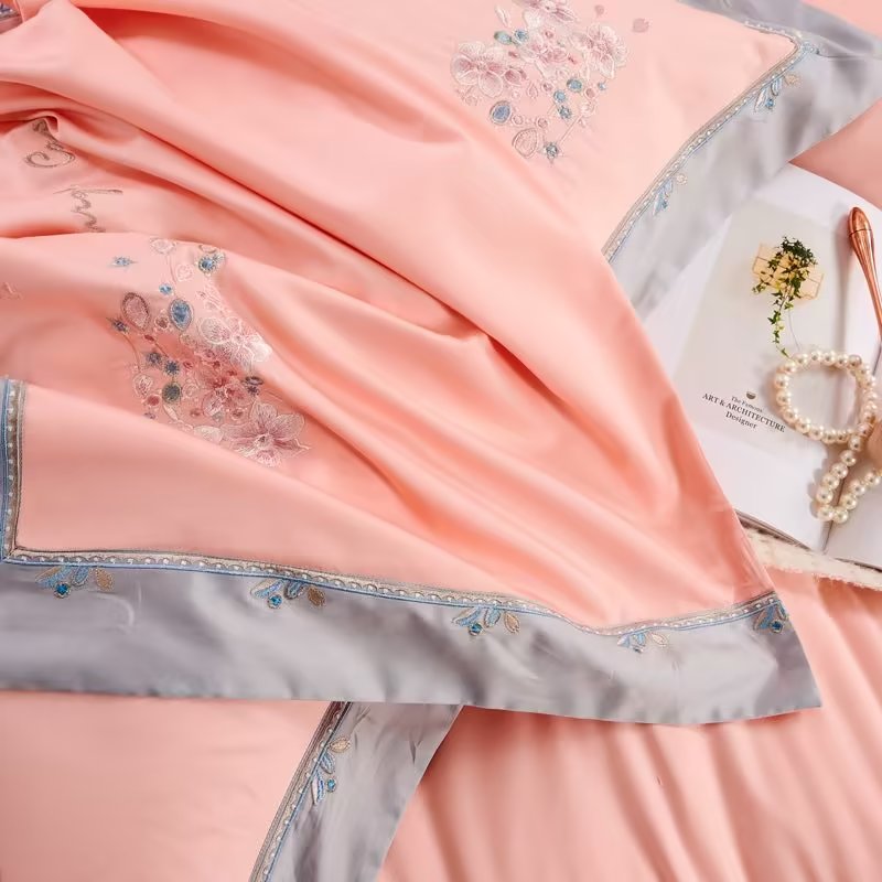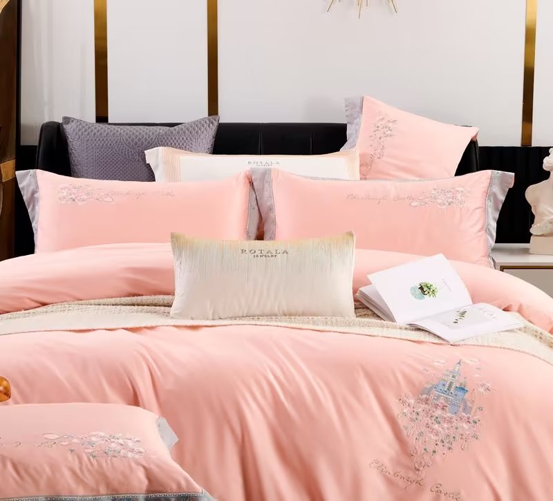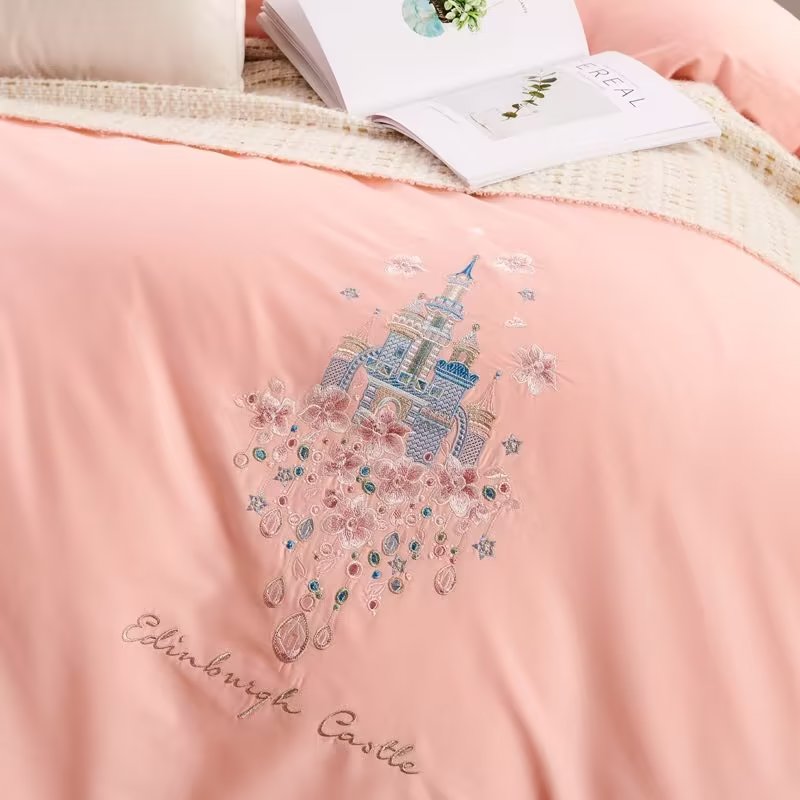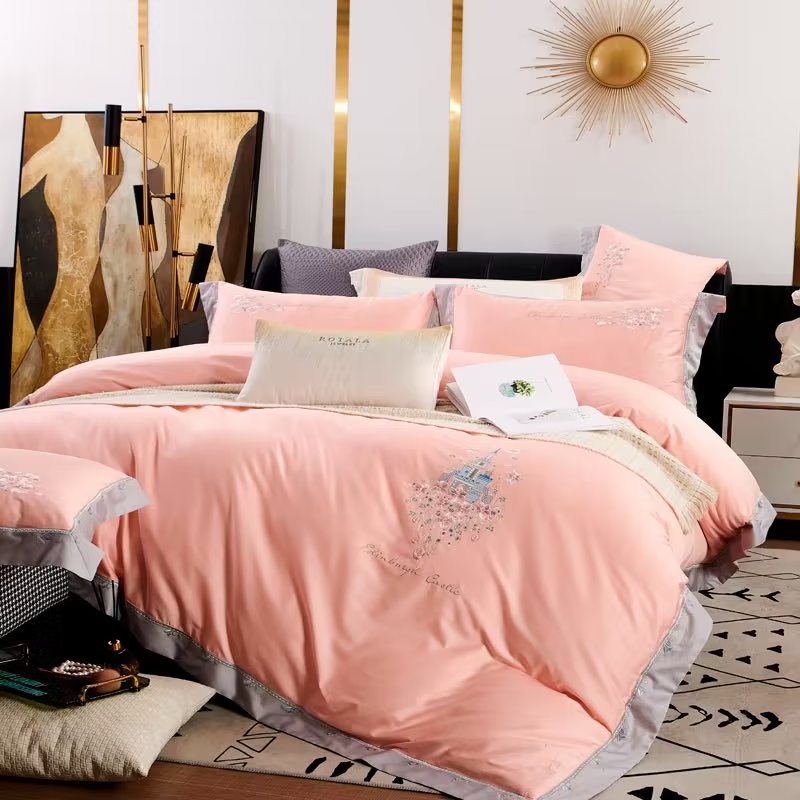 U品汇 2023新品120支60S长绒棉宽边刺绣花贡缎纯棉全棉四件套 爱的城堡-雅黛粉