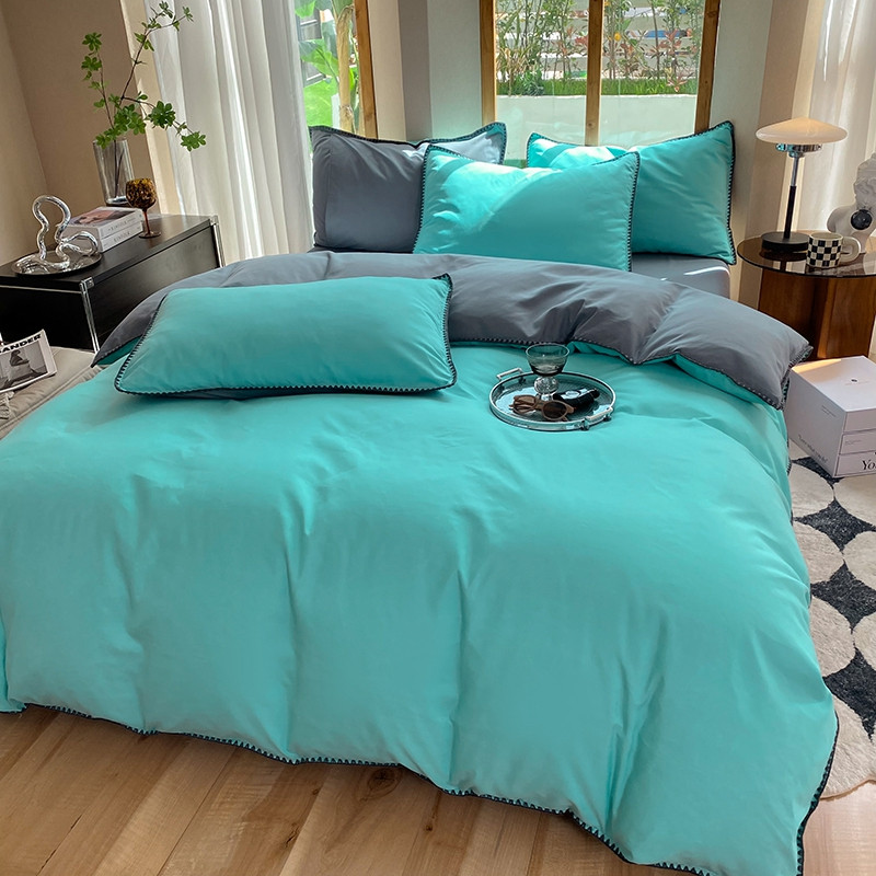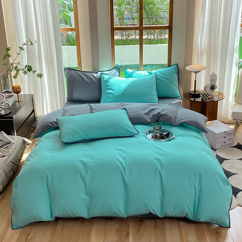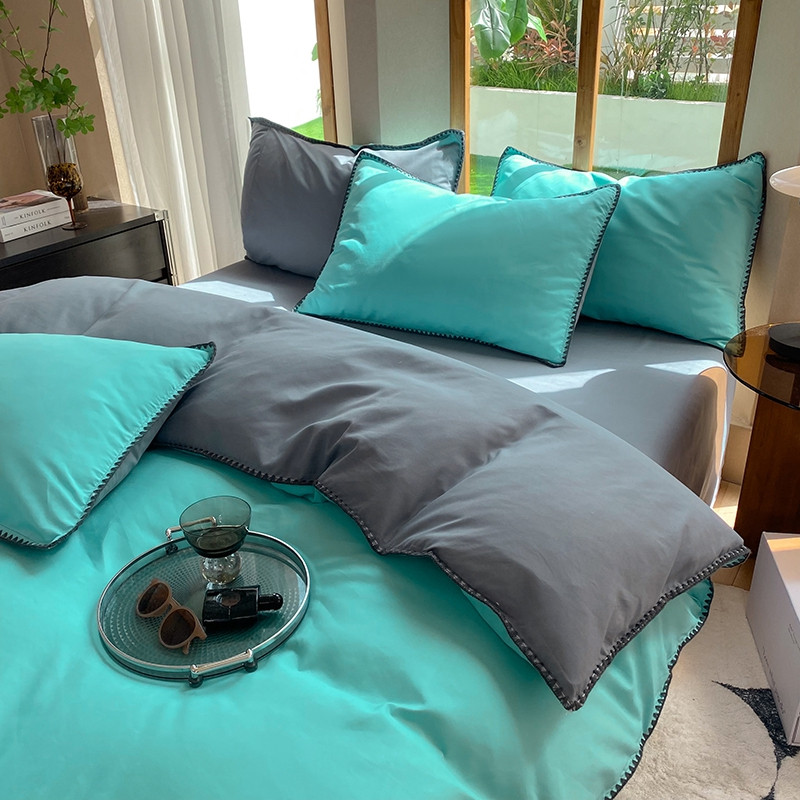 商品名称:妖妖家纺 2023新款水洗棉贝壳边纯色三角针四件套 湖蓝+灰