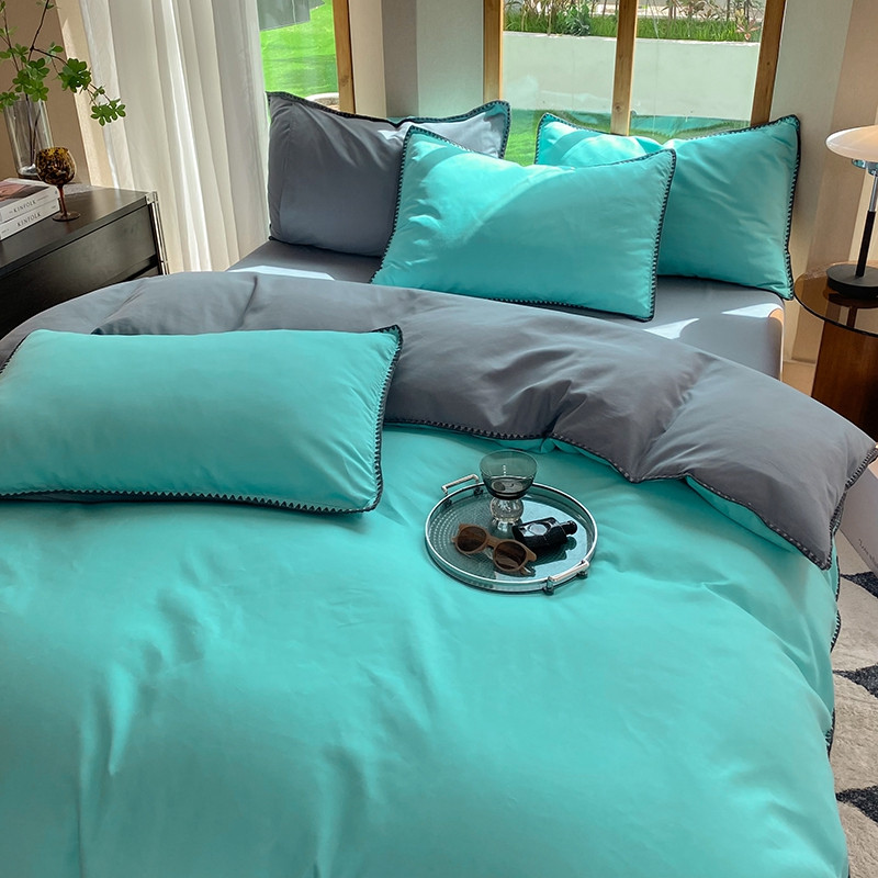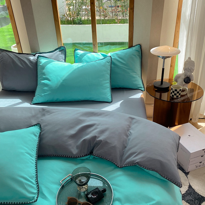 妖妖家纺 2023新款水洗棉贝壳边纯色三角针四件套 湖蓝+灰