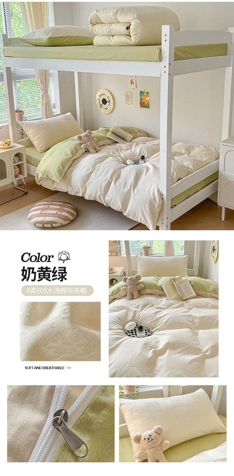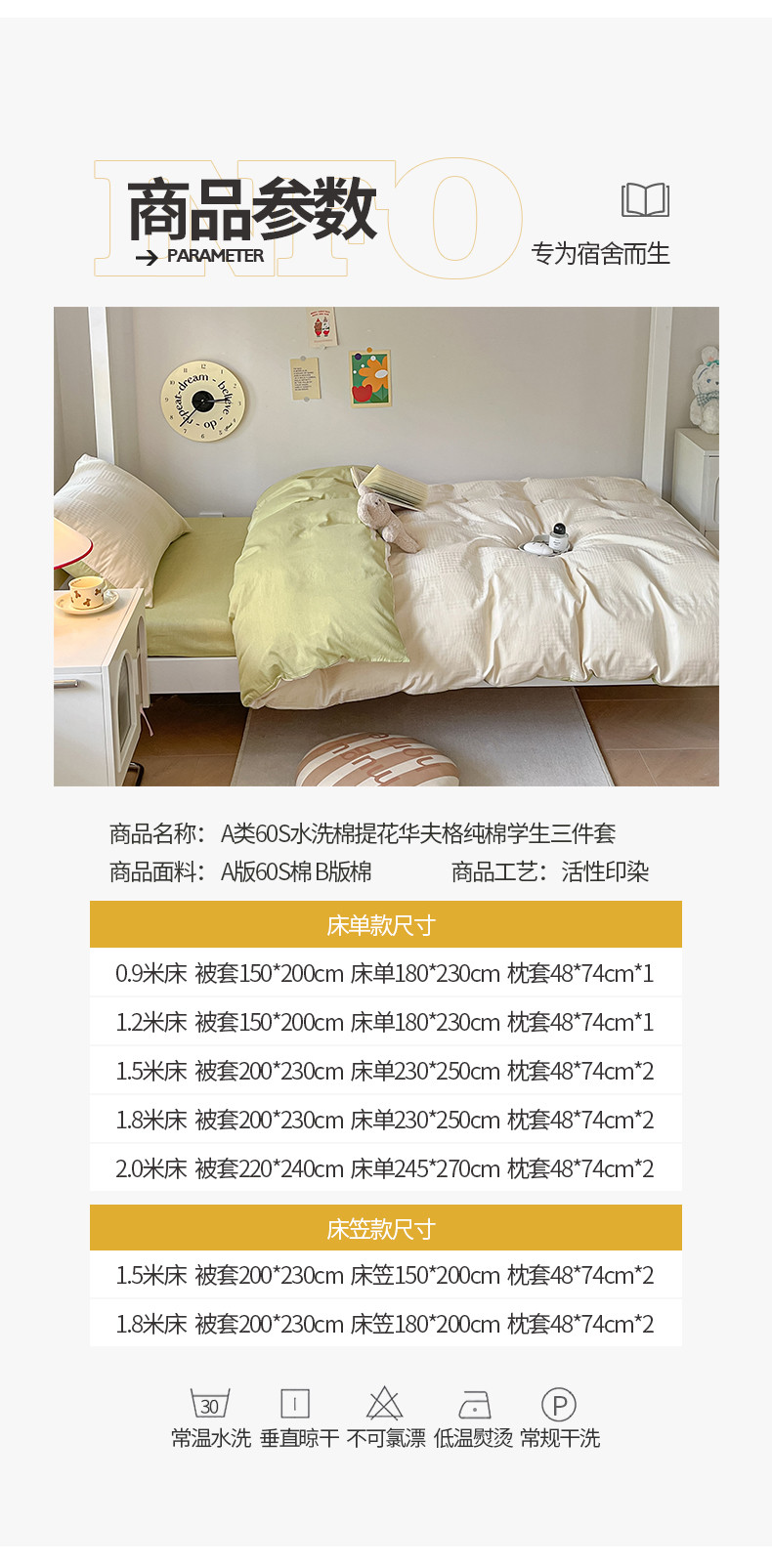 商品名称:桃子家居 2023新款A类60S水洗棉提花华夫格纯棉学生三件套 奶黄绿