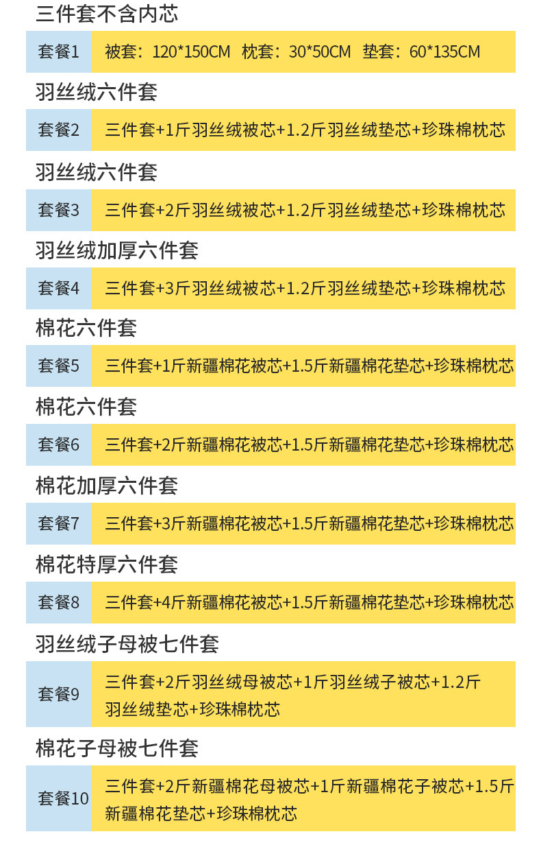 被套+床垫套+枕套(不含芯三件套) | ¥65.00 |