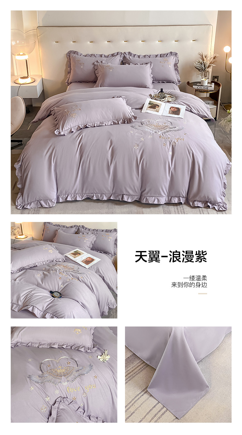 当前位置: 91家纺网 > 商品网购 > 床品套件 > 四件套 > 普通磨毛四件套 > 艺玲 2023新款韩版亲肤磨毛刺绣蕾丝床裙床单如意系列四件套 天翼-浪漫紫