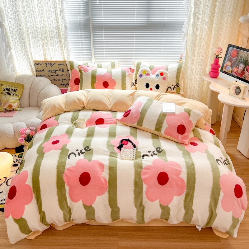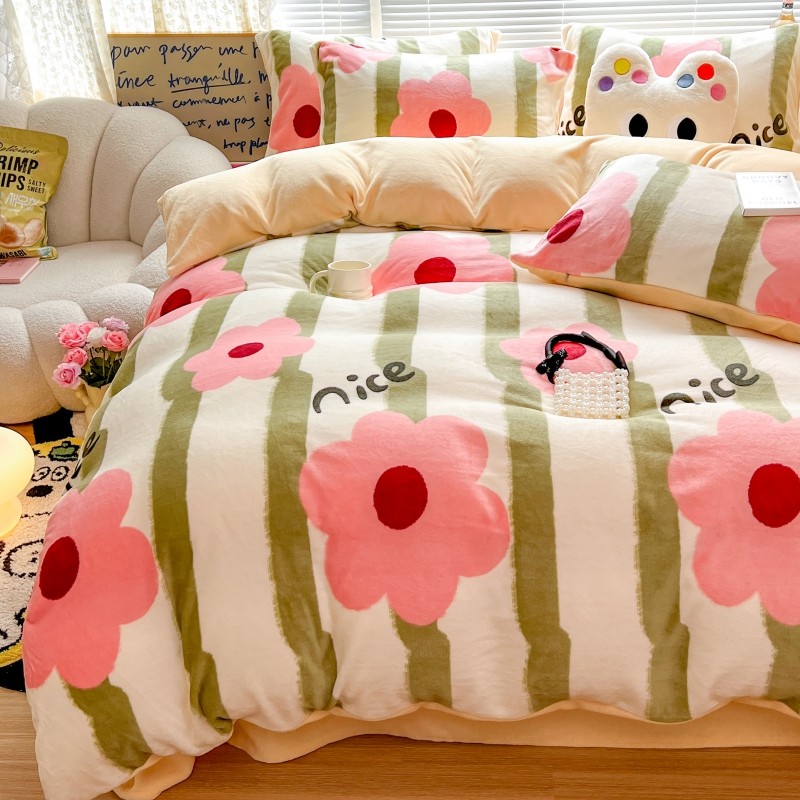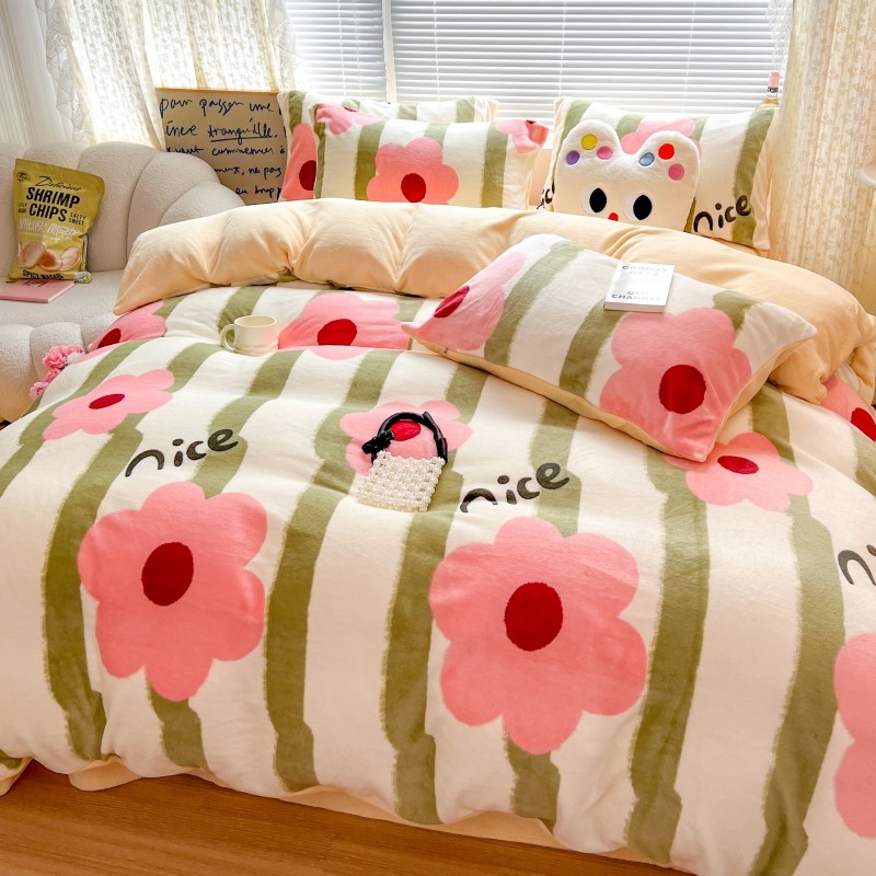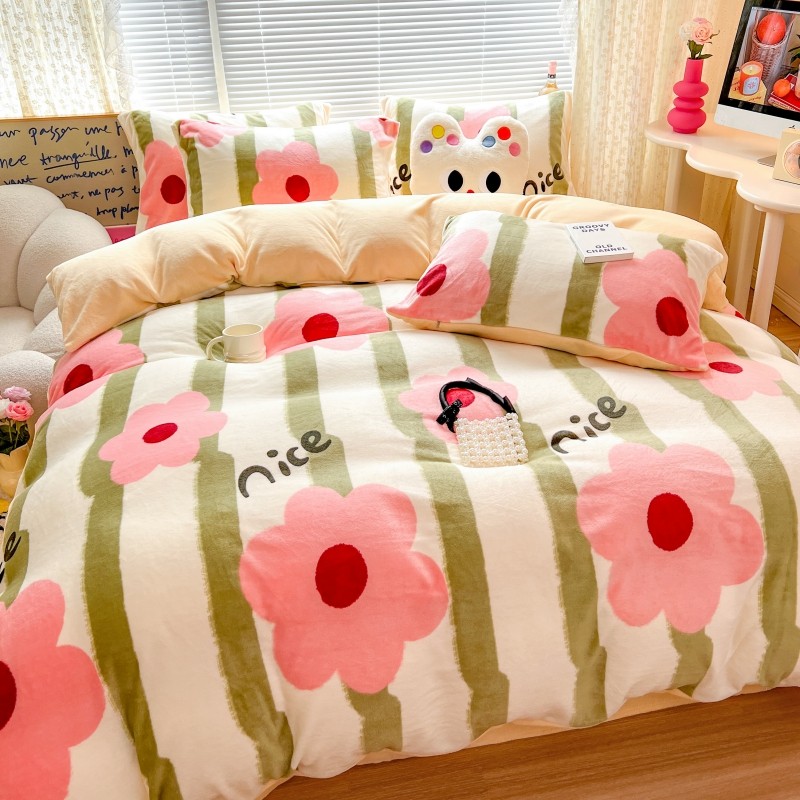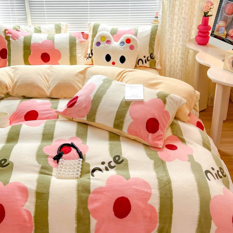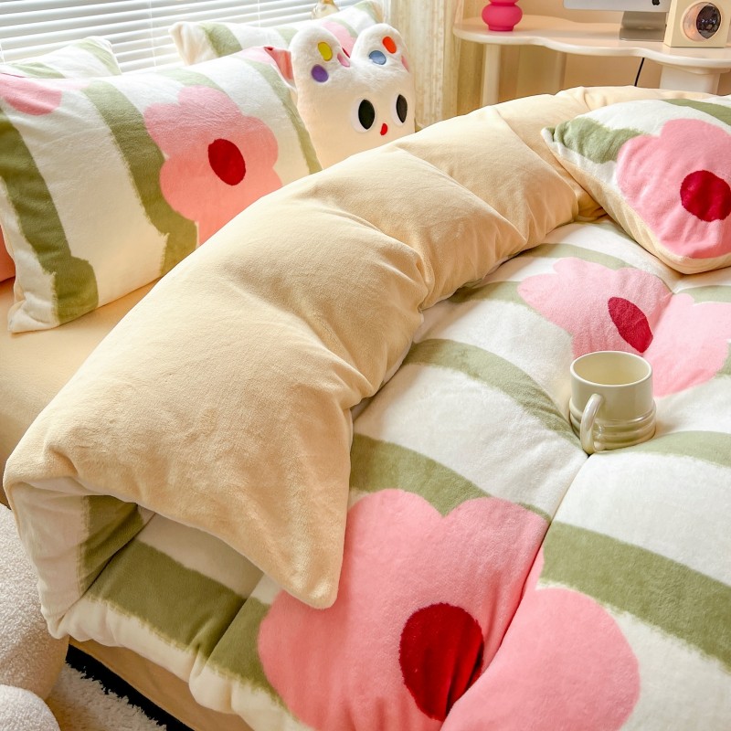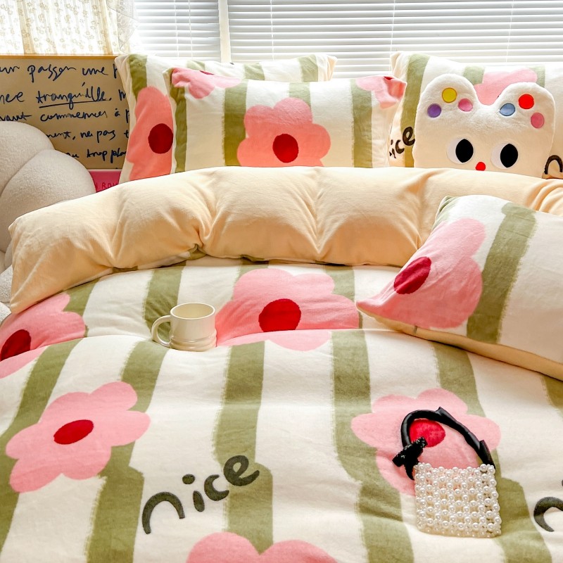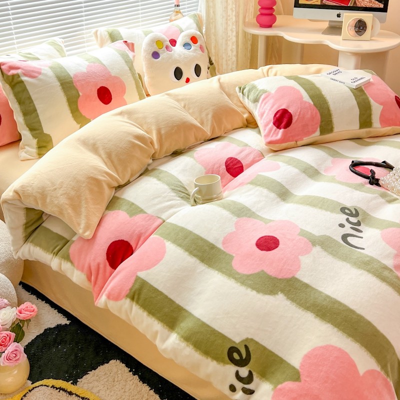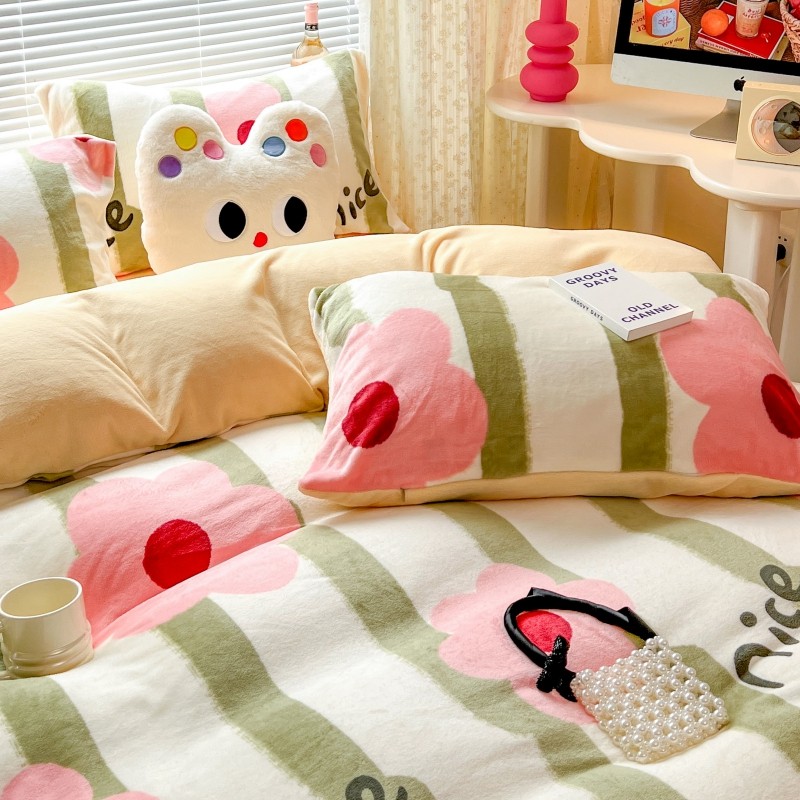 顾里 2023新款ins少女保暖牛奶绒奶油治 愈系四件套第 一批 绿条粉花