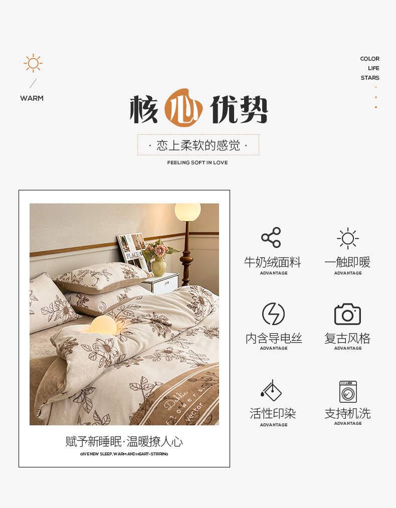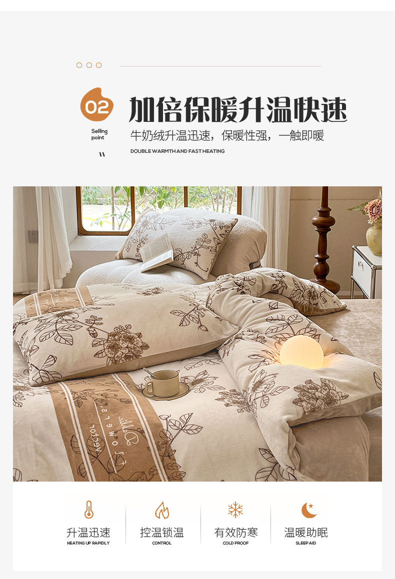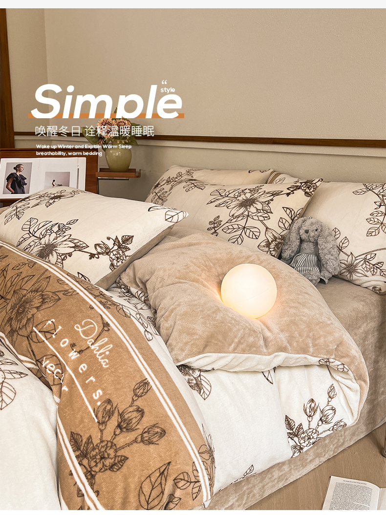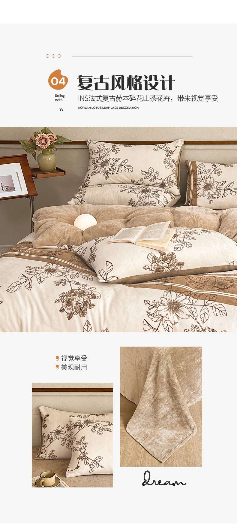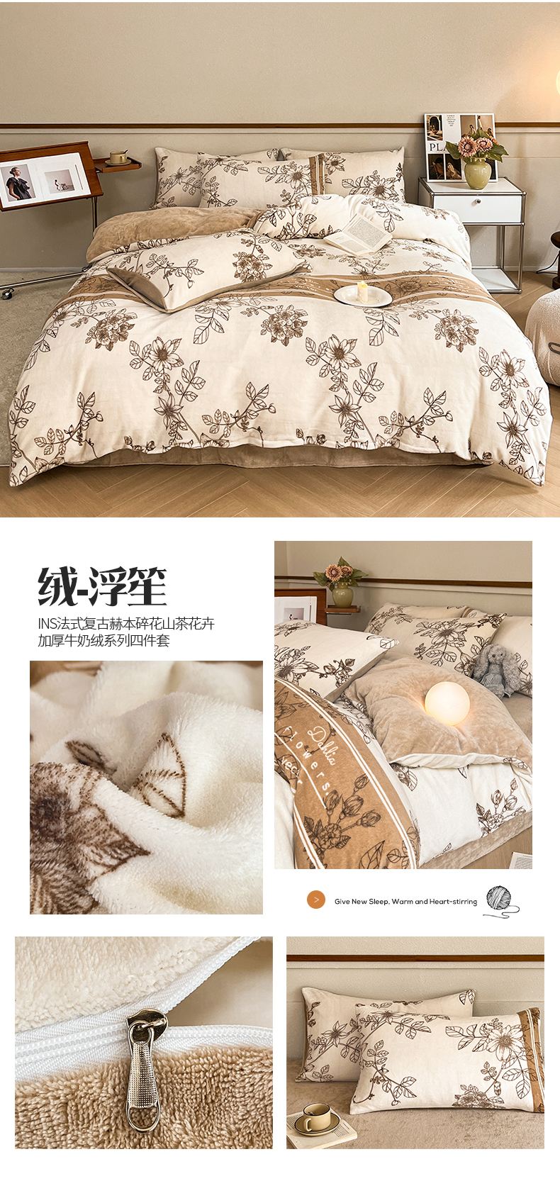 商品名称:桃子家居 2023新款ins法式复古赫本碎花山茶花卉加厚牛奶绒系列四件套 绒-浮笙