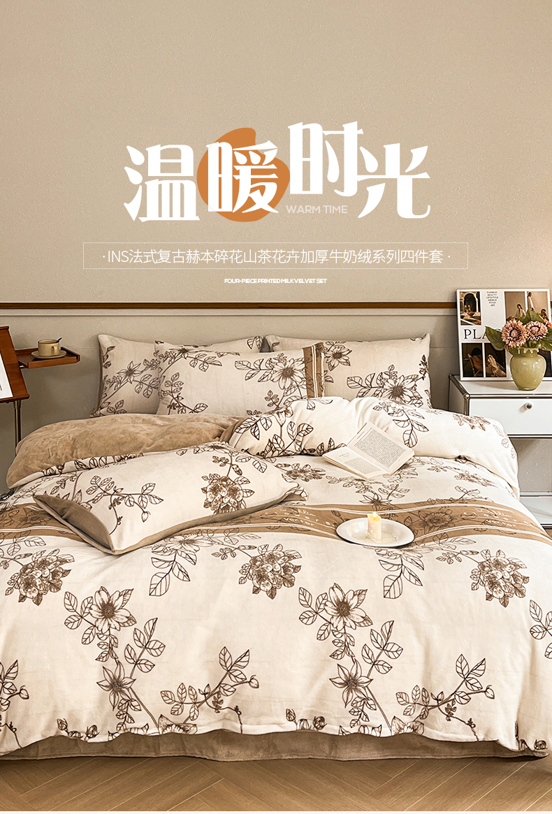 桃子家居 2023新款ins法式复古赫本碎花山茶花卉加厚牛奶绒系列四件套 绒-浮笙
