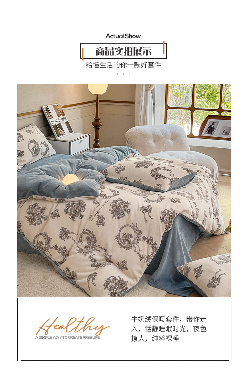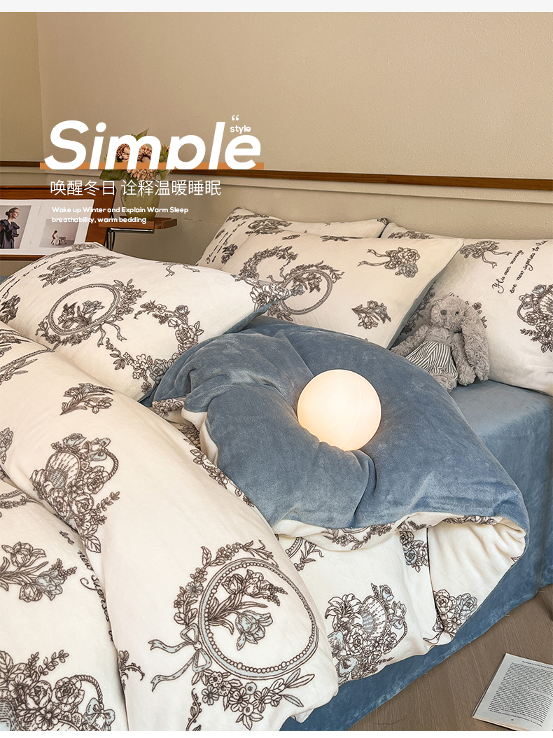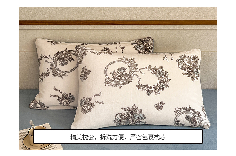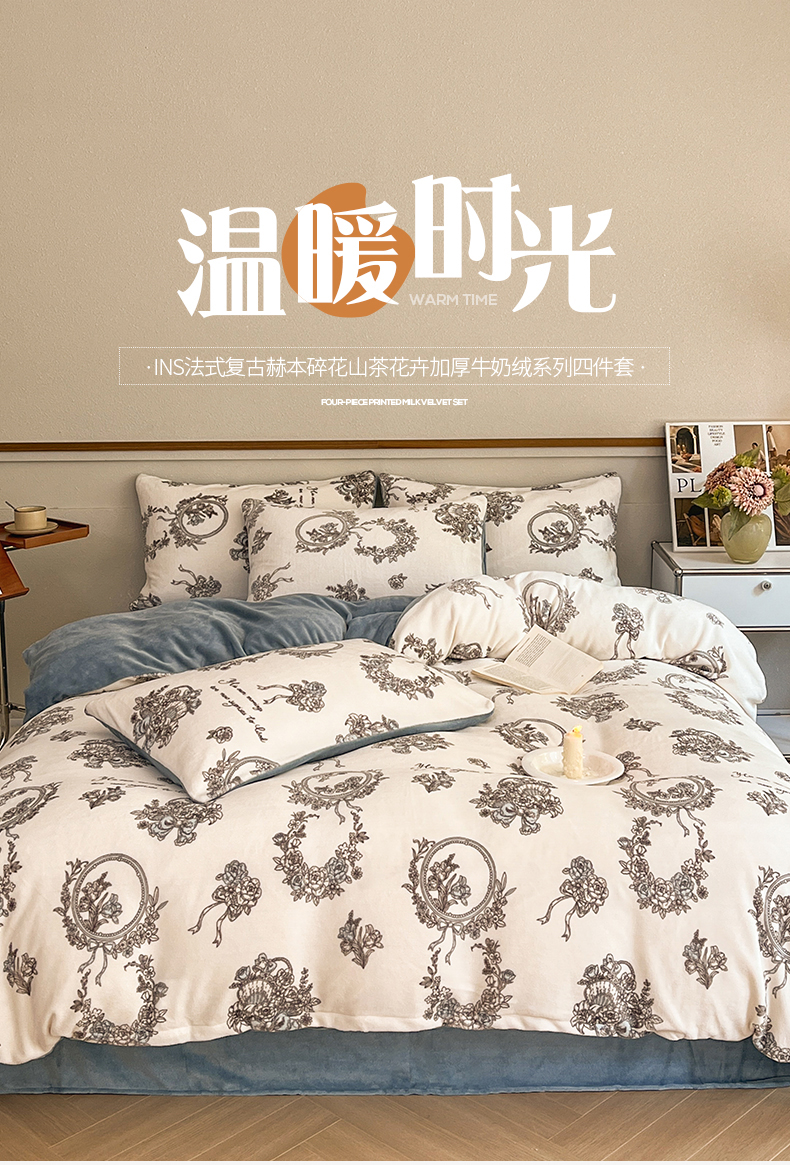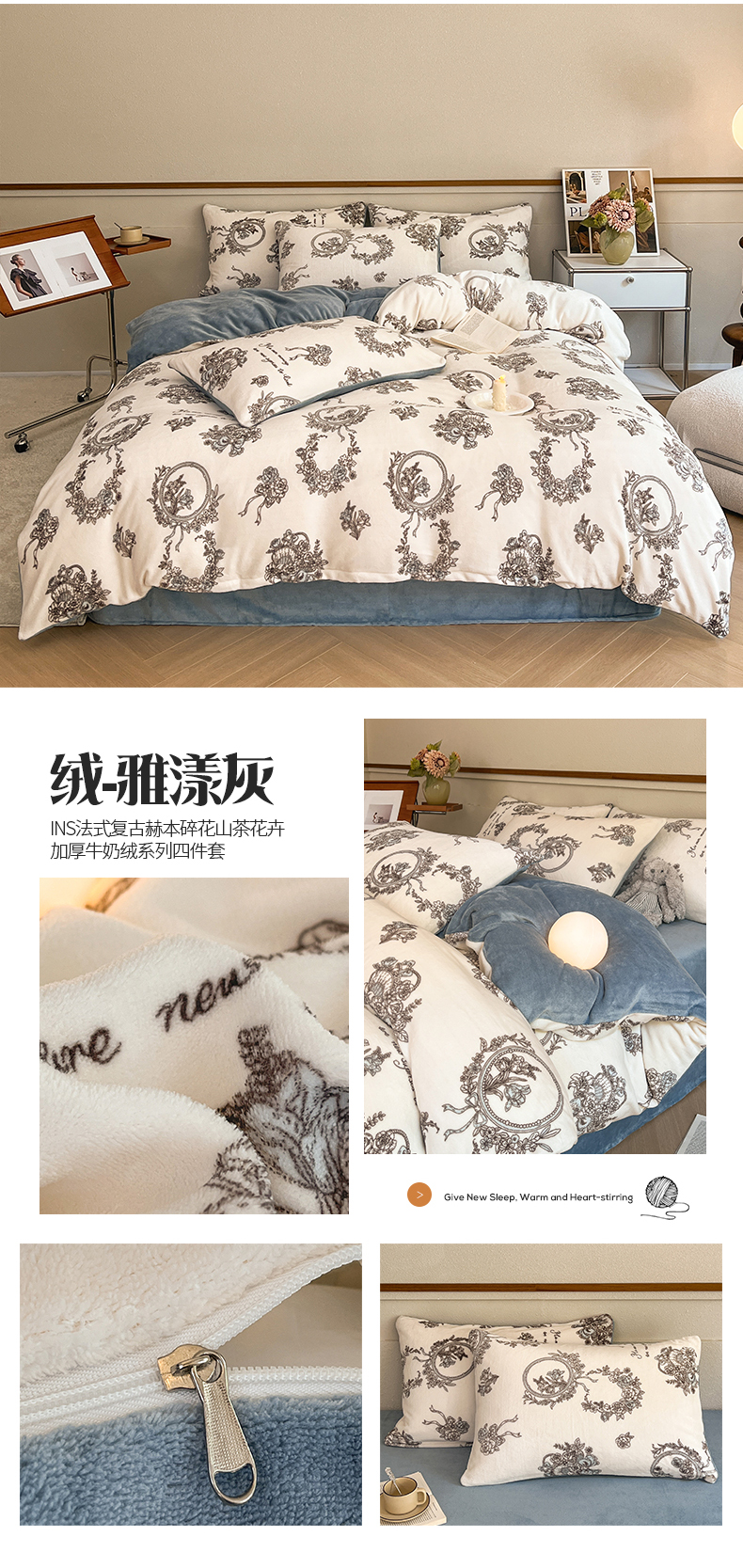 桃子家居 2023新款ins法式复古赫本碎花山茶花卉加厚牛奶绒系列四件套 绒-雅漾灰