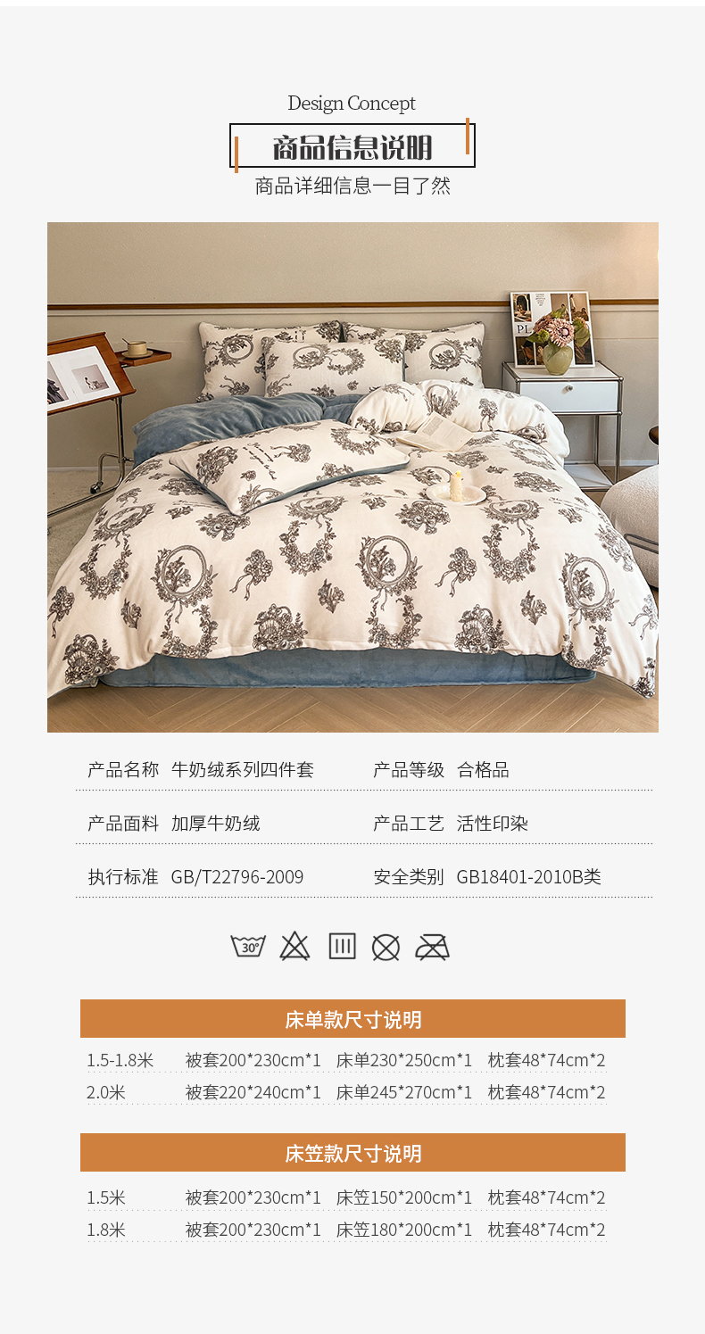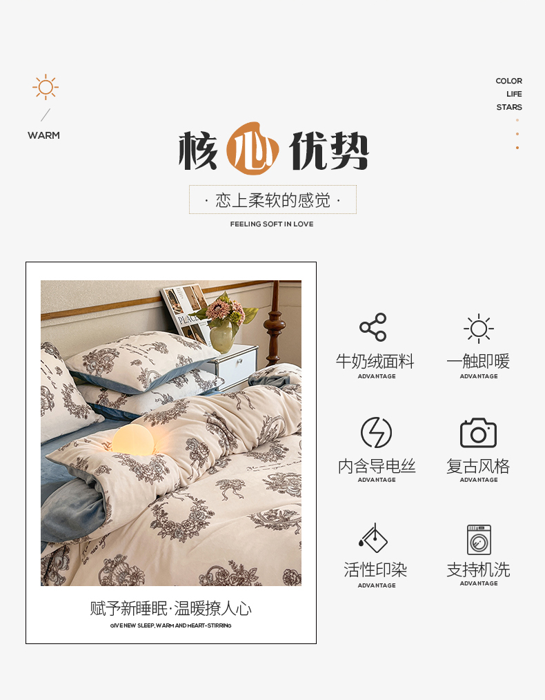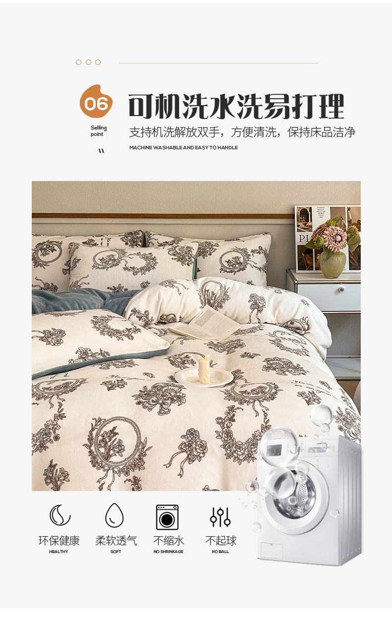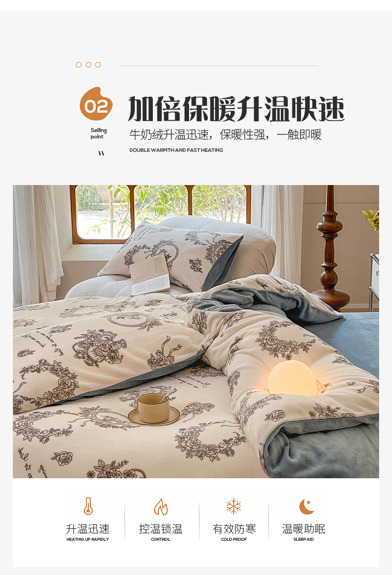 桃子家居 2023新款ins法式复古赫本碎花山茶花卉加厚牛奶绒系列四件套 绒-雅漾灰