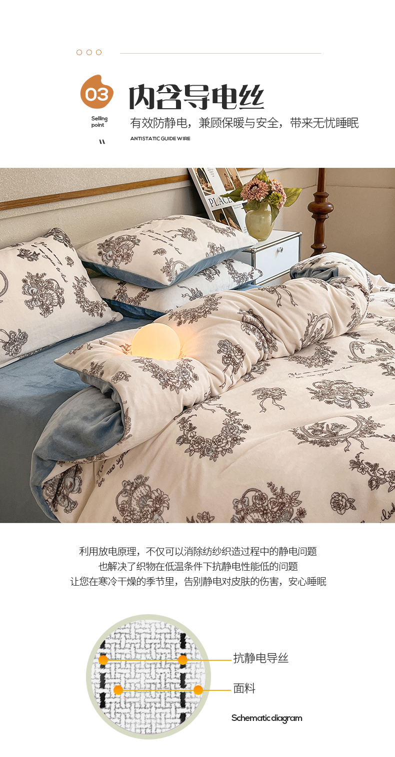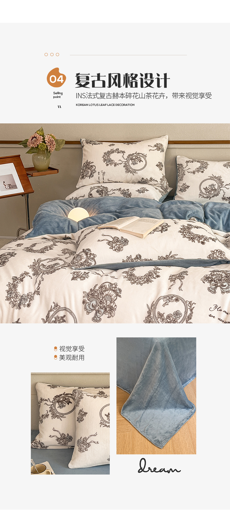 商品名称:桃子家居 2023新款ins法式复古赫本碎花山茶花卉加厚牛奶绒系列四件套 绒-雅漾灰