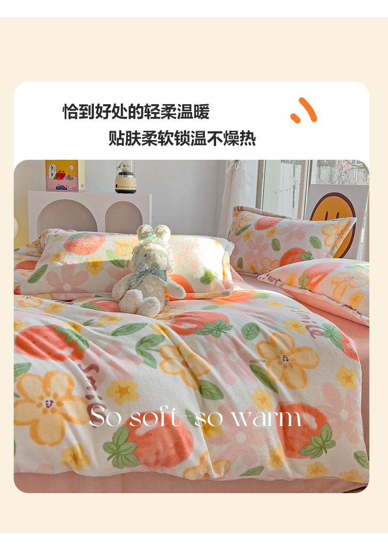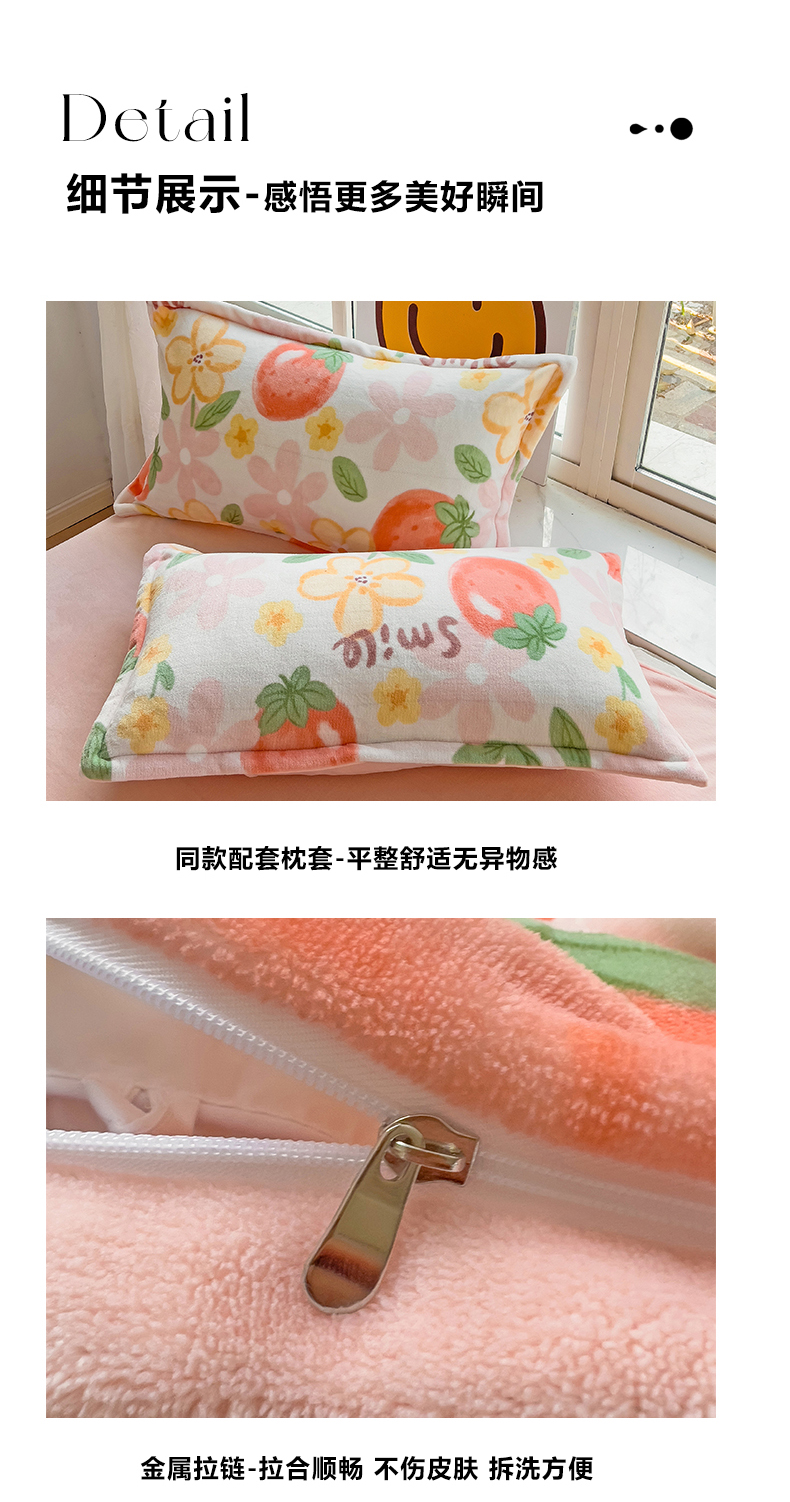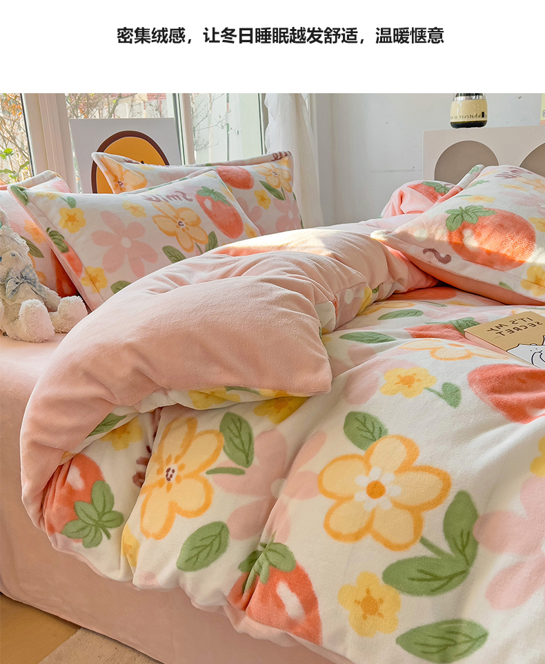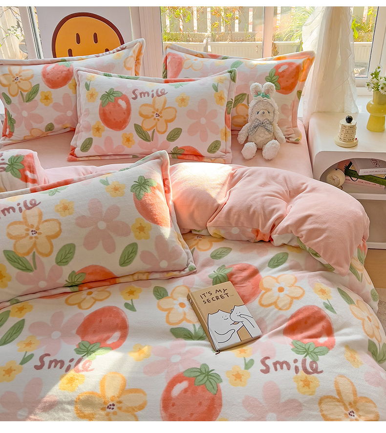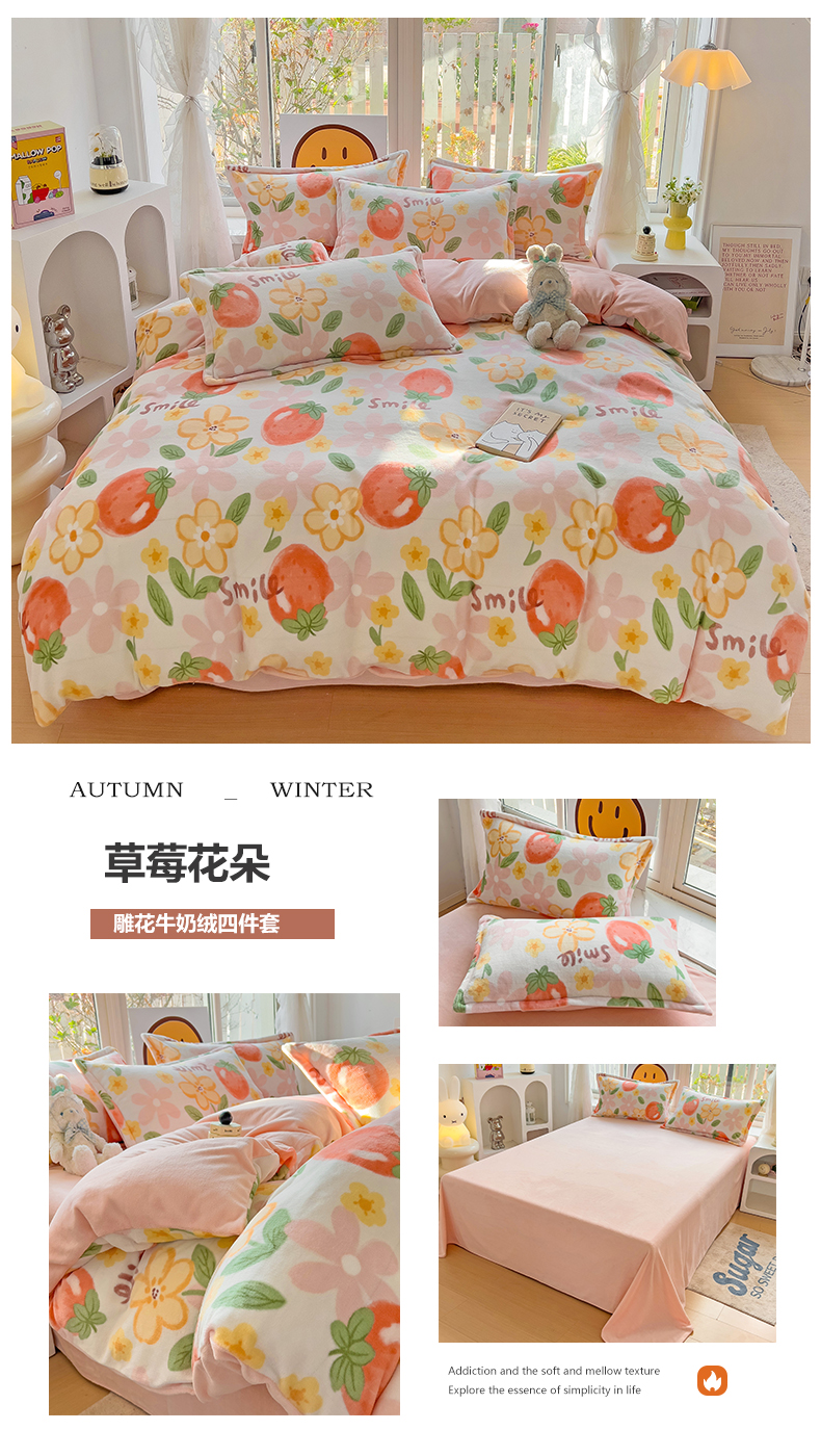 当前位置: 91家纺网 > 商品网购 > 床品套件 > 四件套 > 牛奶绒四件套 > 包小包 2023直播爆款220g高克重印花小清新牛奶绒四件套 草莓花朵