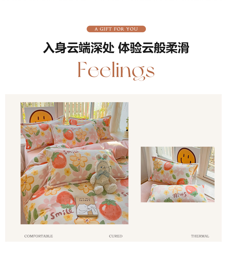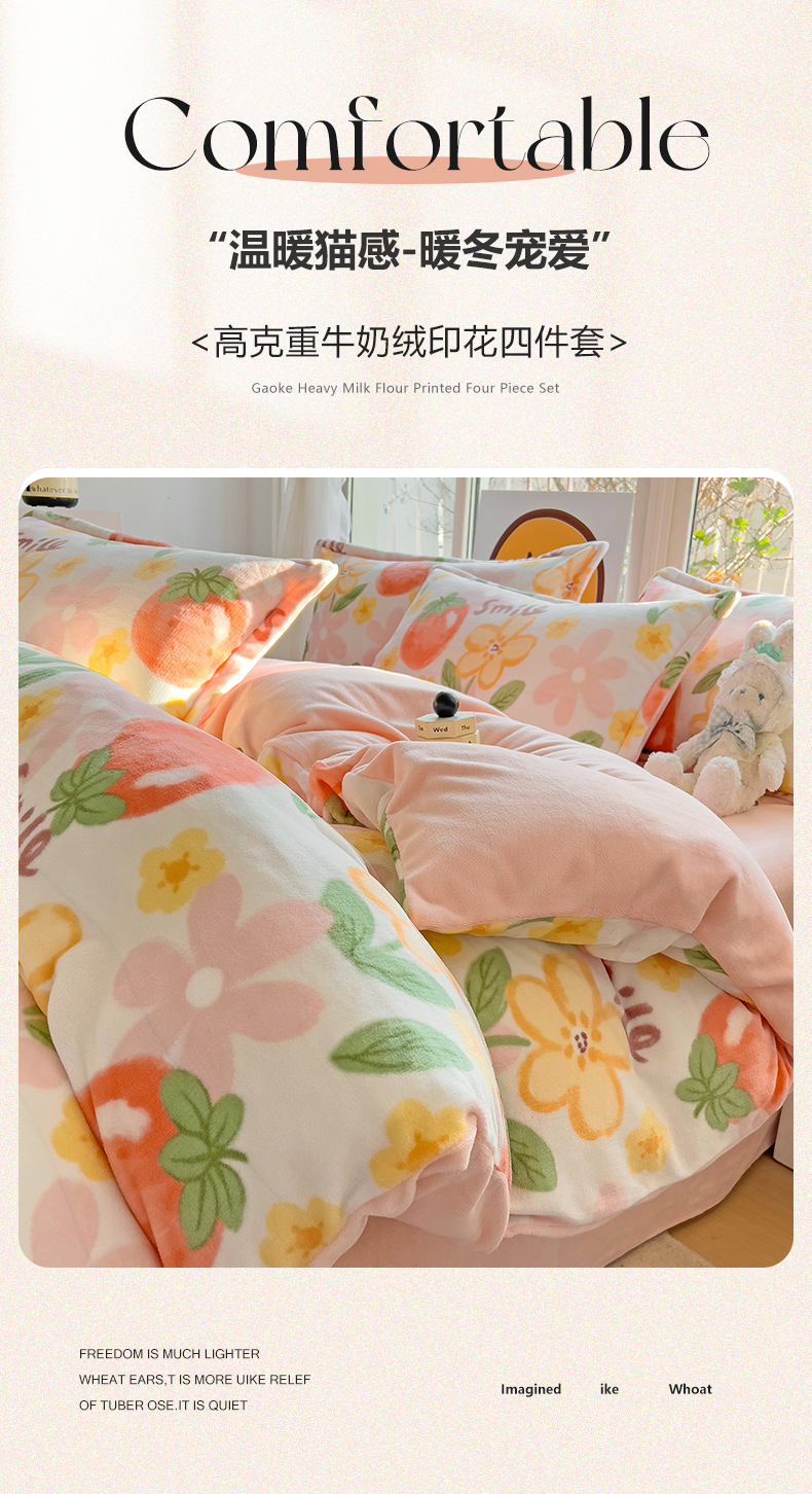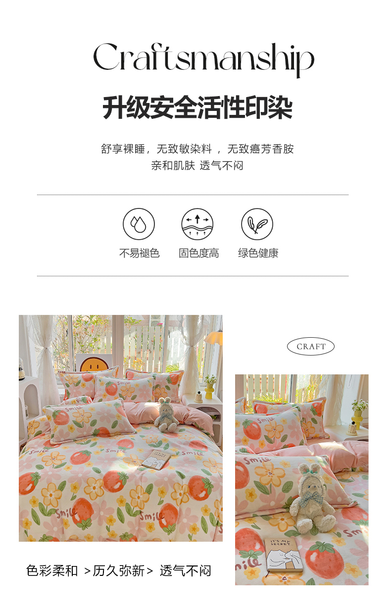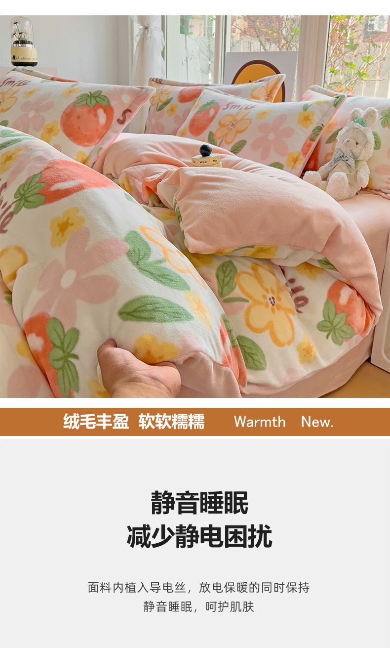 当前位置: 91家纺网 > 商品网购 > 床品套件 > 四件套 > 牛奶绒四件套 > 包小包 2023直播爆款220g高克重印花小清新牛奶绒四件套 草莓花朵