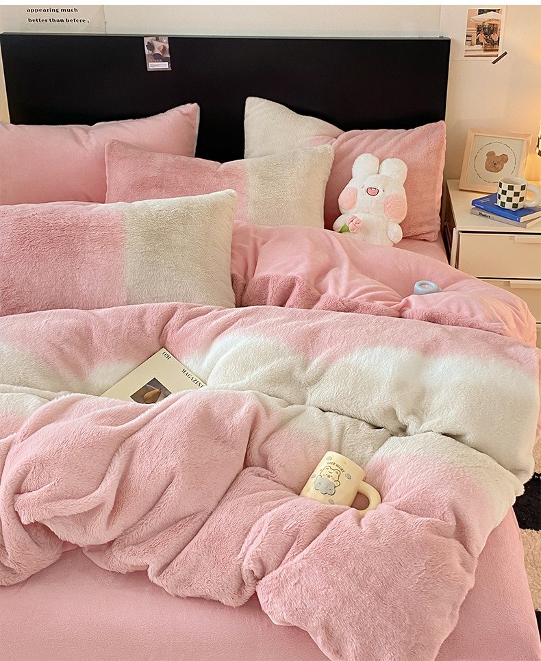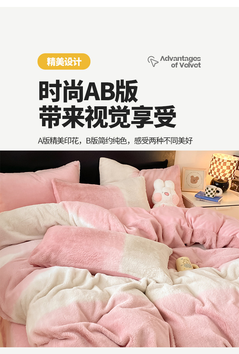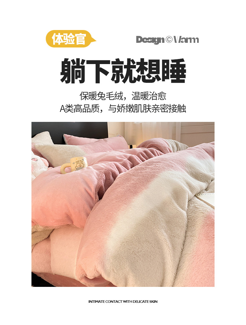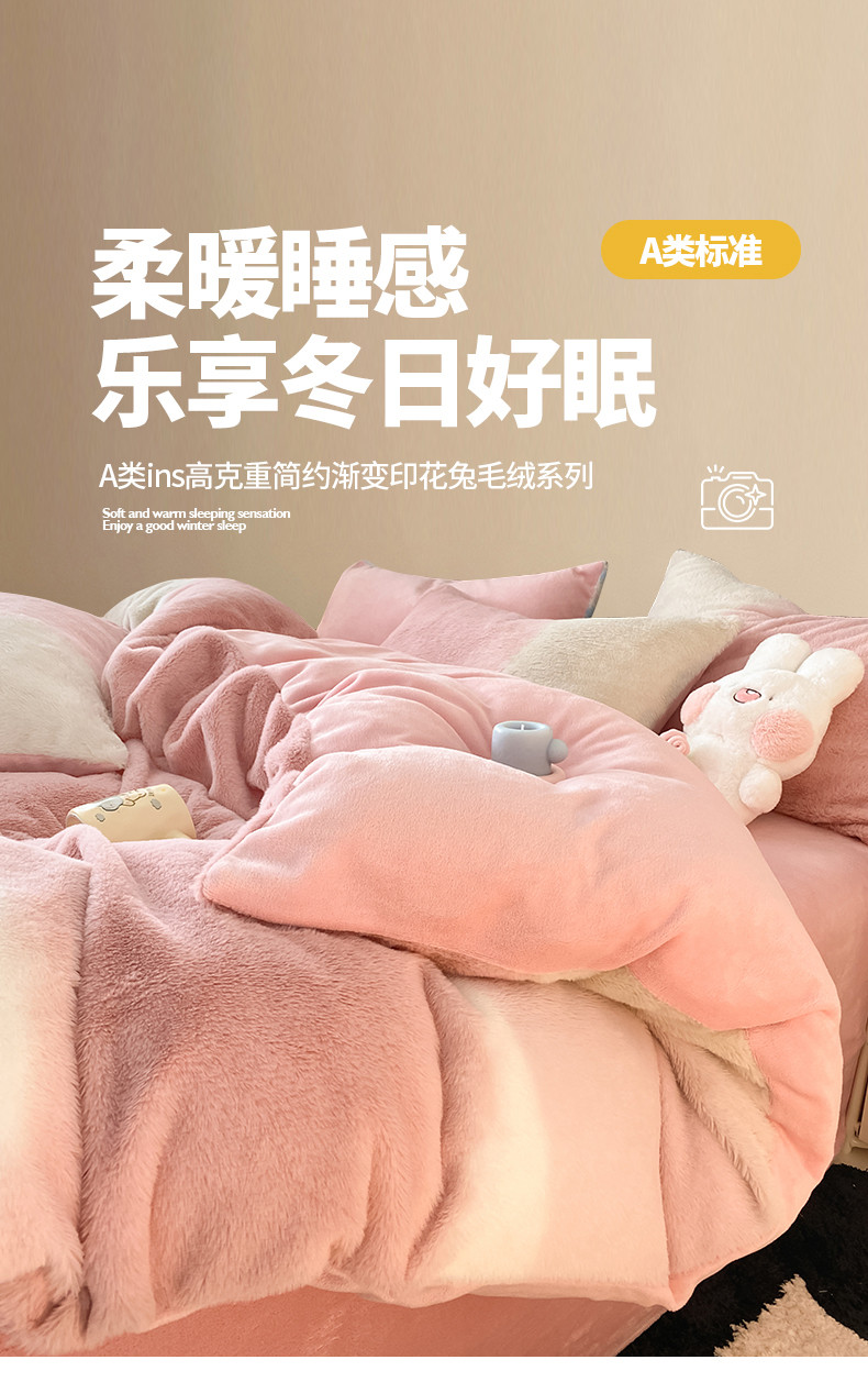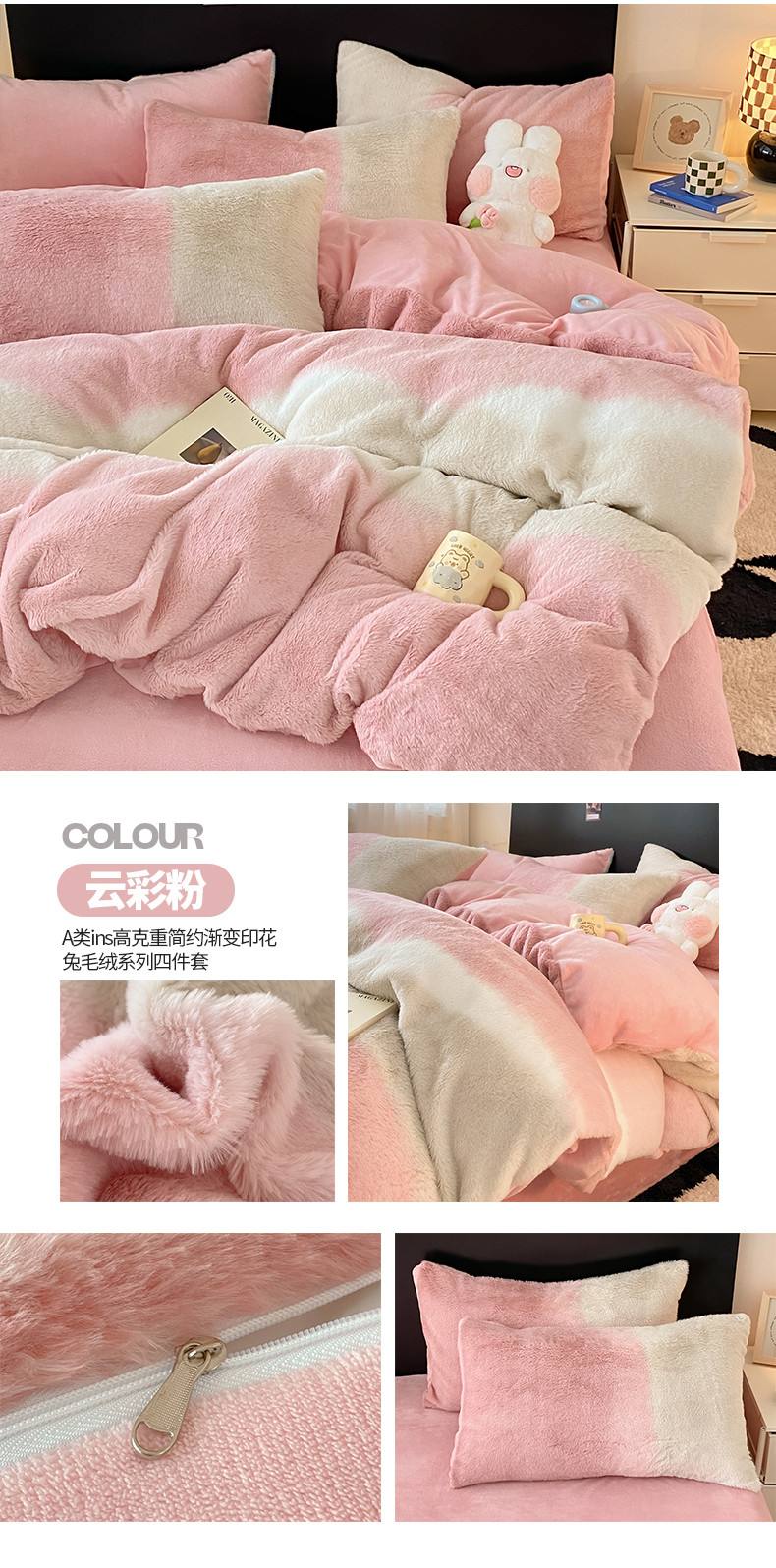A类ins高克重320克简约渐变印花兔毛绒暖绒加厚牛奶绒系列四件套 绒兔毛-云彩粉