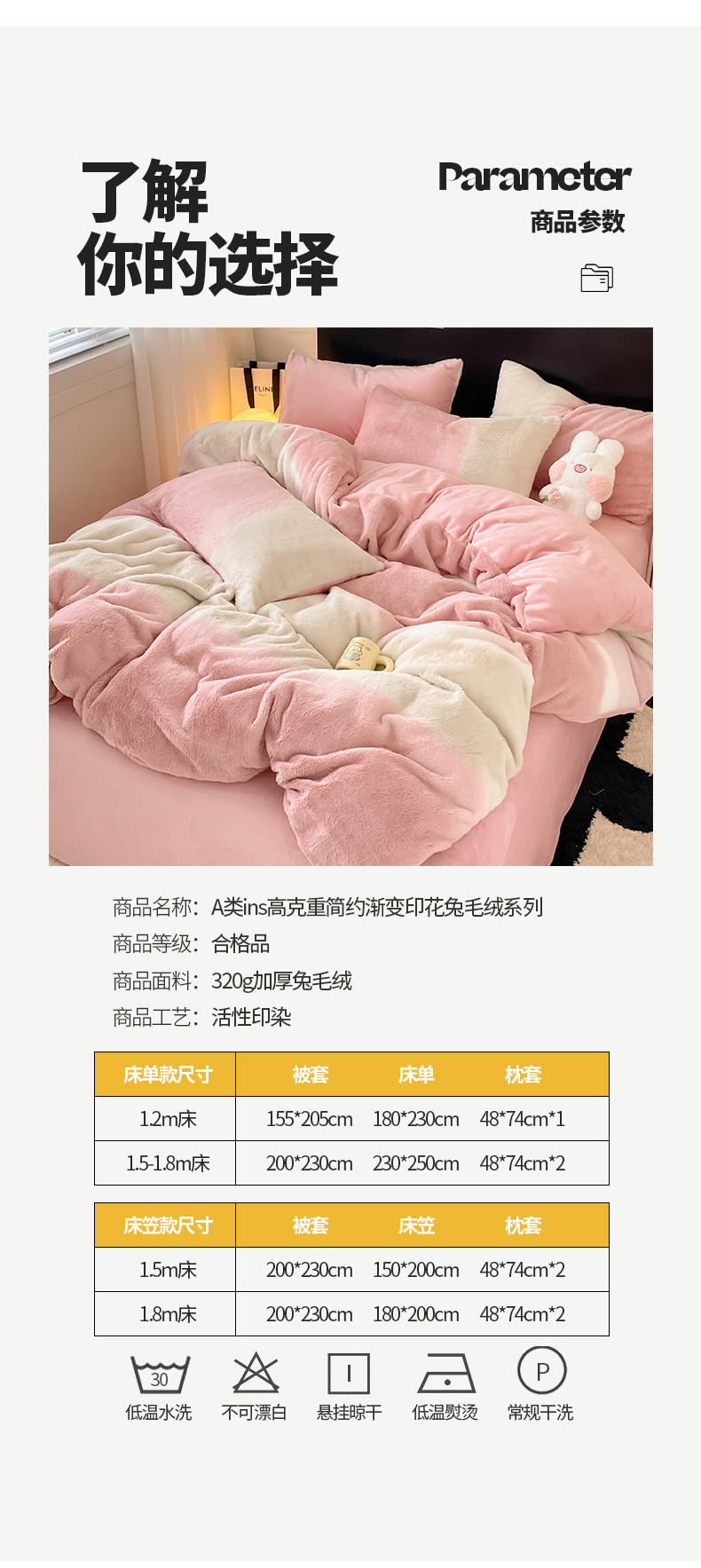 商品名称:A类ins高克重320克简约渐变印花兔毛绒暖绒加厚牛奶绒系列四件套 绒兔毛-云彩粉