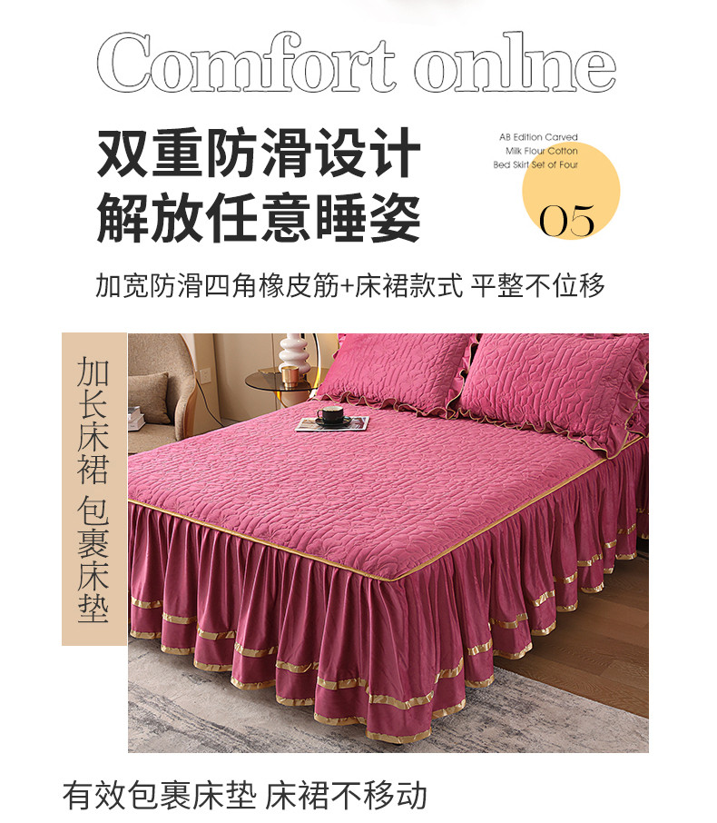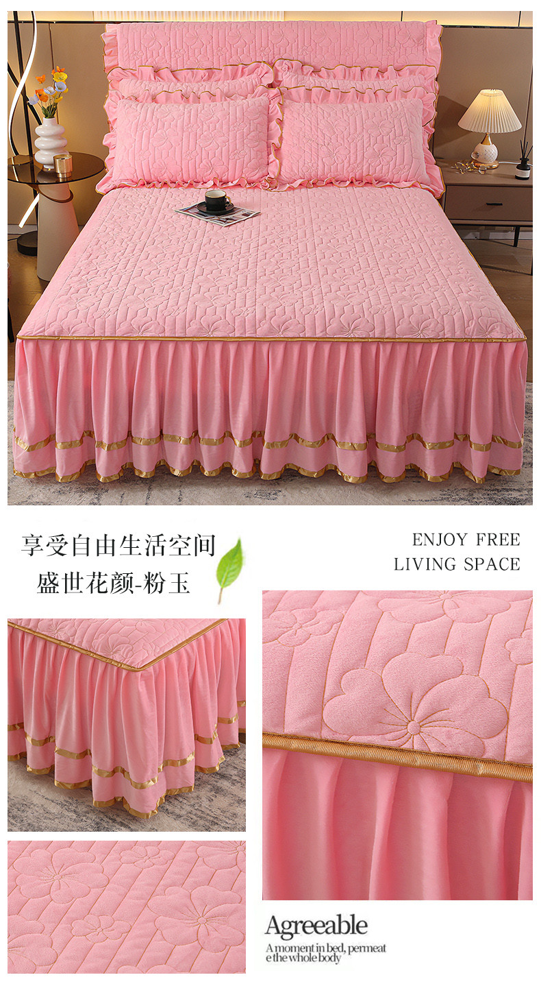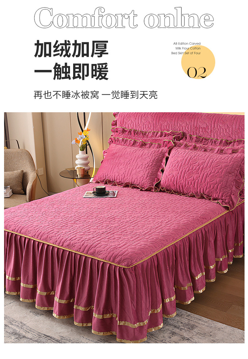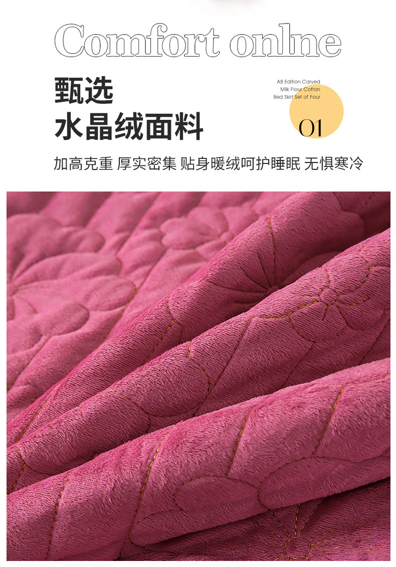 (总)屹成家纺2025新款水晶绒夹棉绗缝床裙四件套(塞纳河畔)四件套起售价不低于230元,大红,豆沙,翡翠绿,粉玉,橄榄绿,蔚蓝,银灰