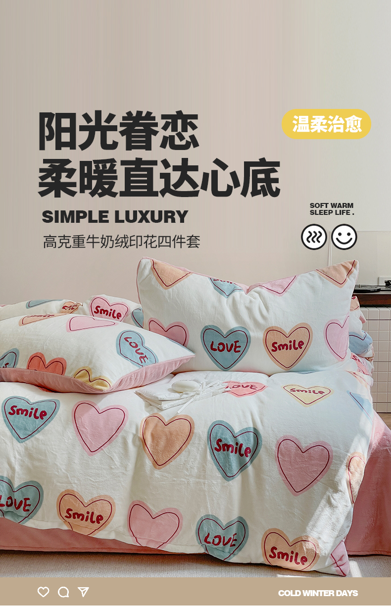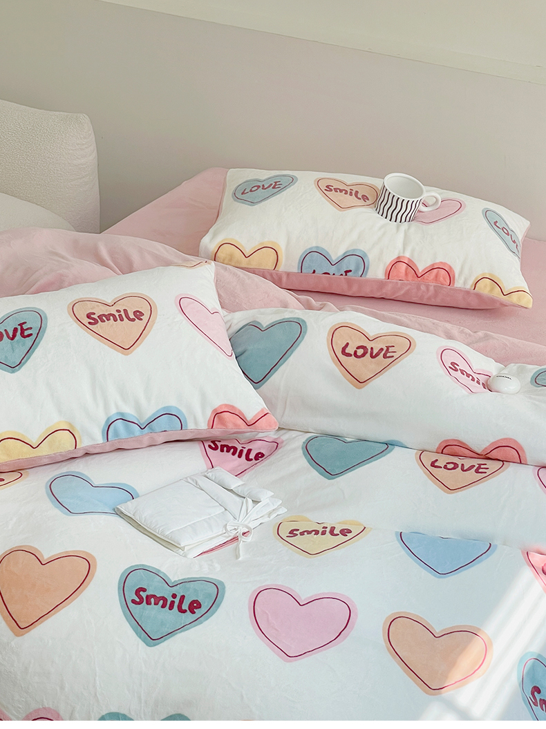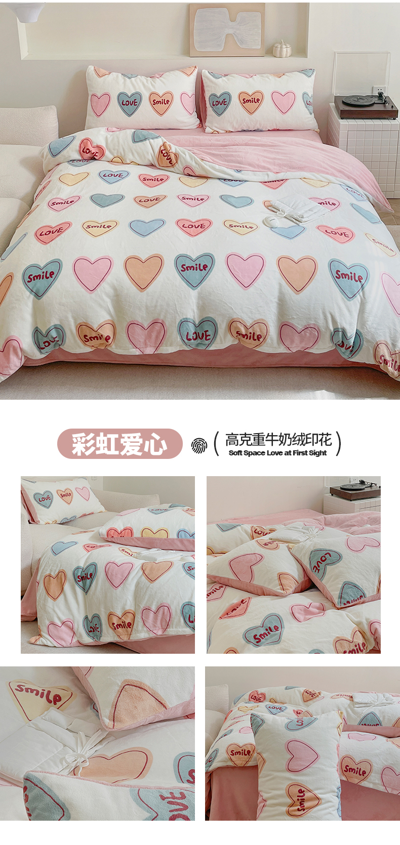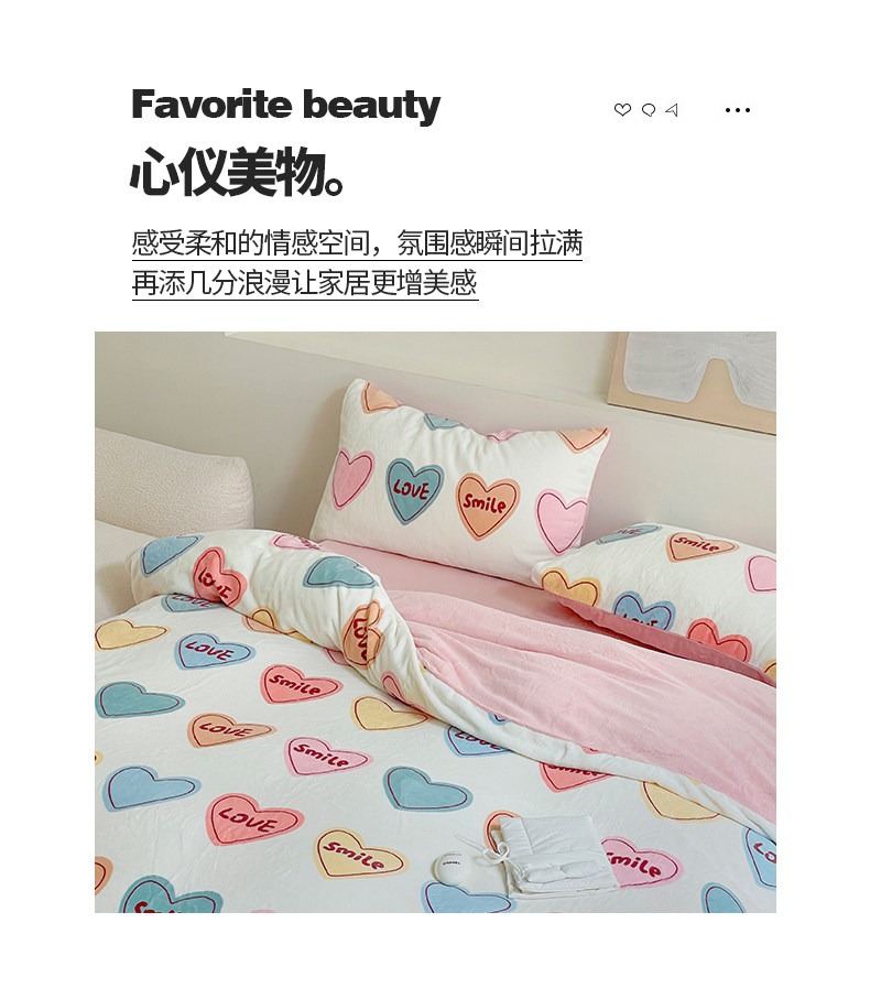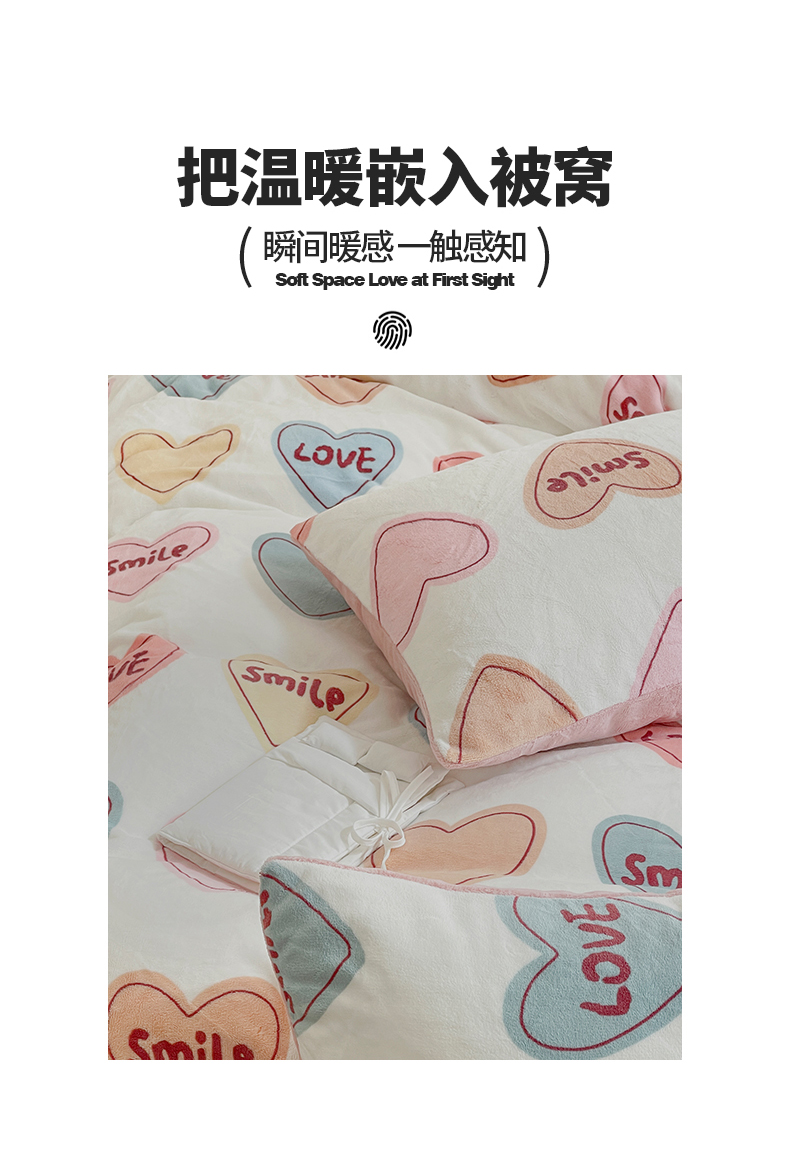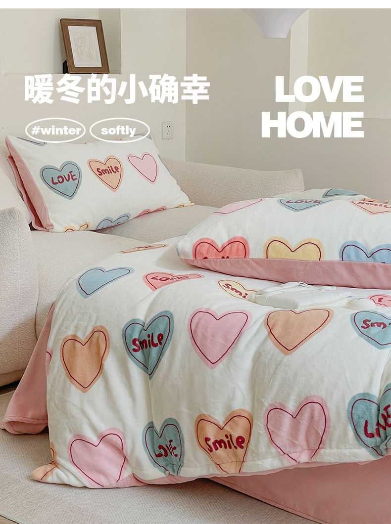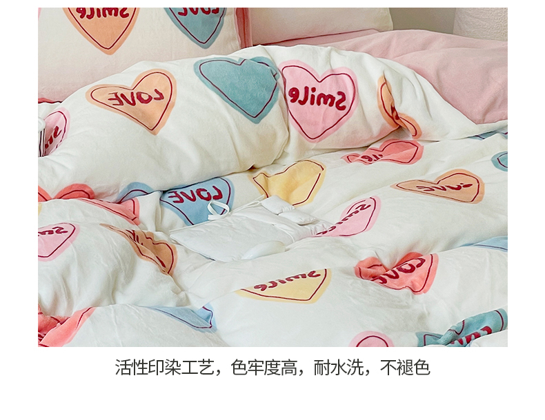 商品名称:窝米 2023冬季新品高克重牛奶绒四件套系列 彩虹爱心