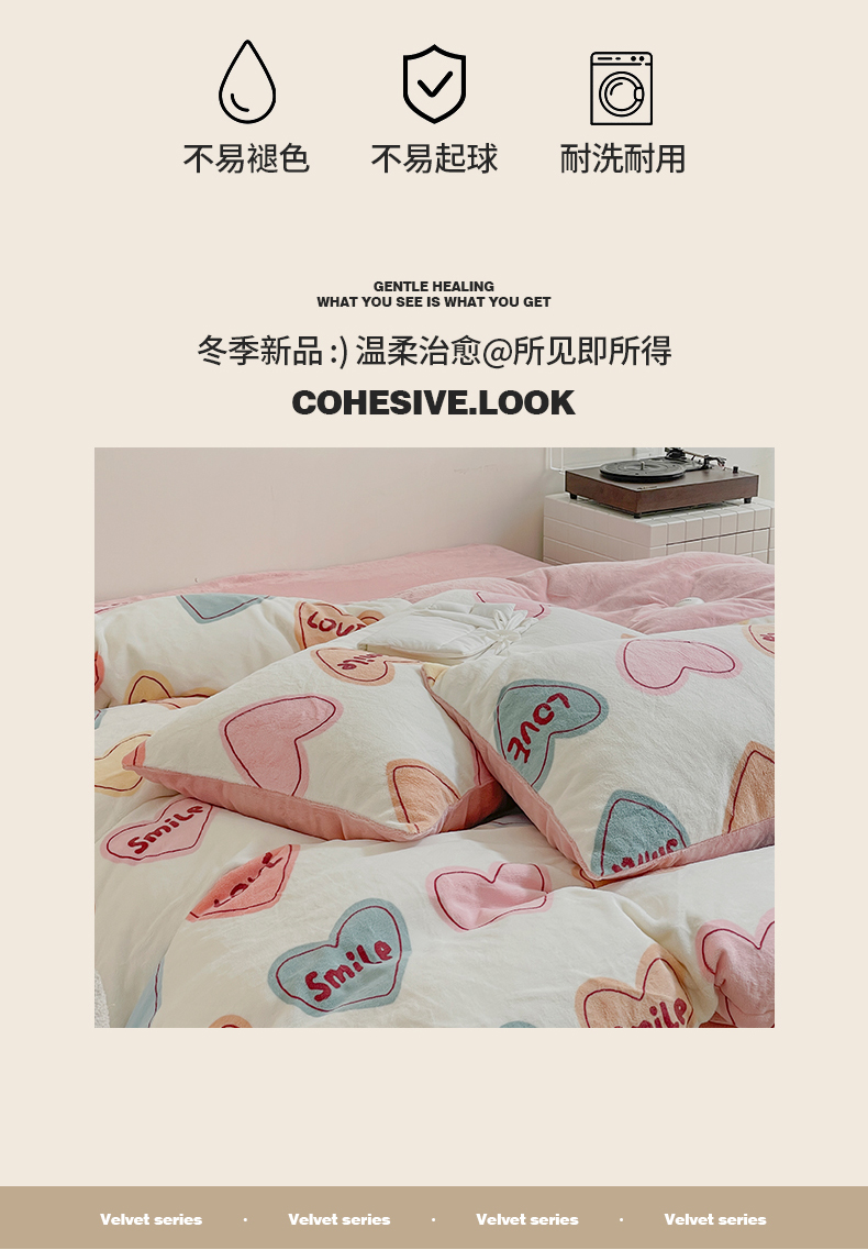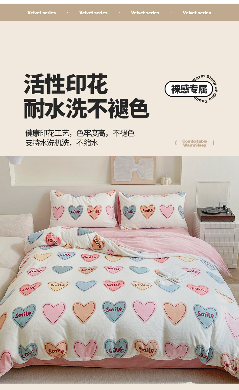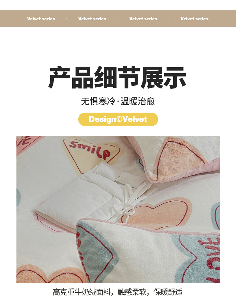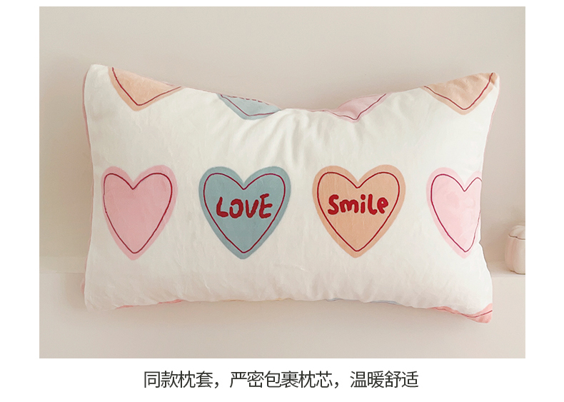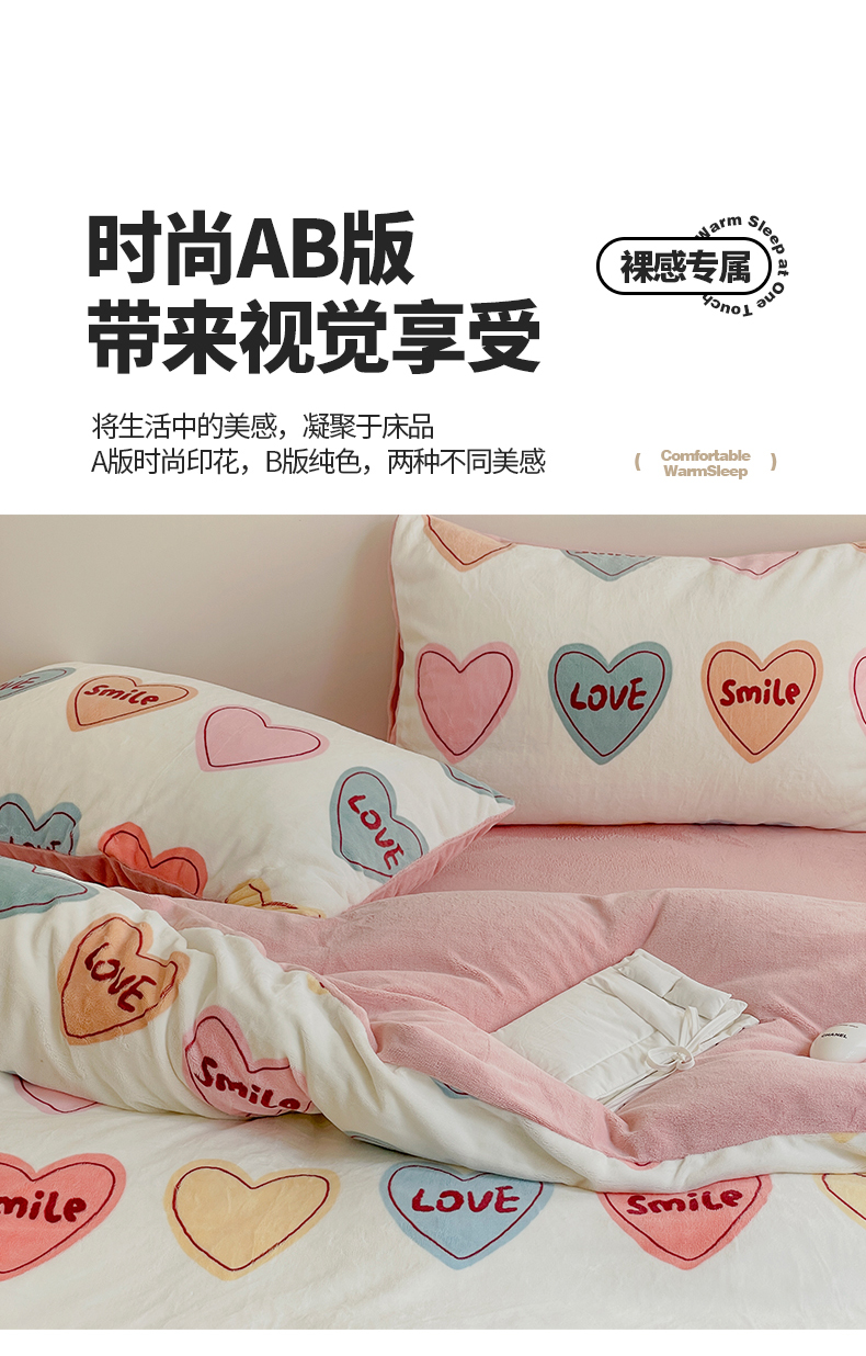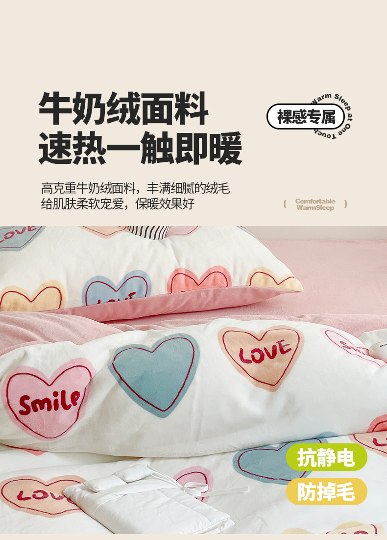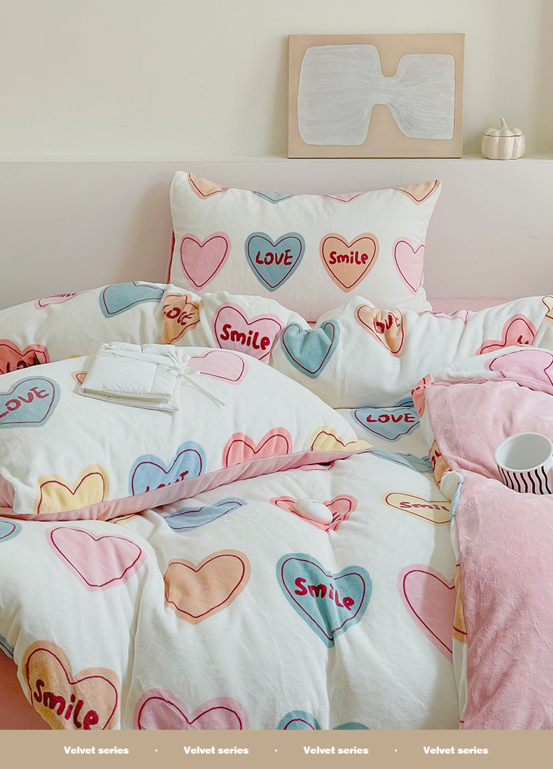 商品名称:窝米 2023冬季新品高克重牛奶绒四件套系列 彩虹爱心