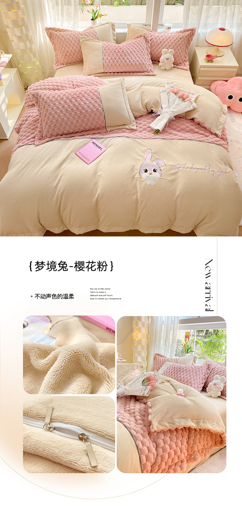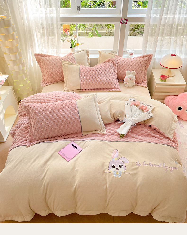 商品名称:爱上家居 2023新款牛奶绒兔毛绒四件套 梦境兔 梦境兔-樱花粉