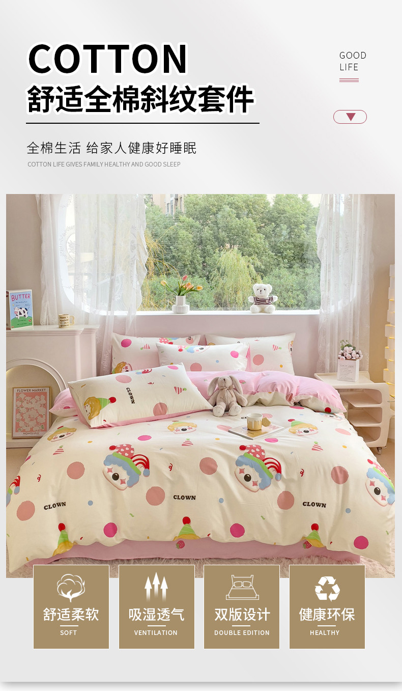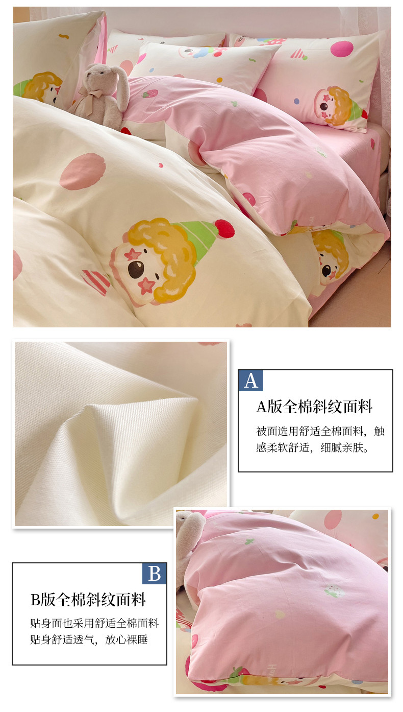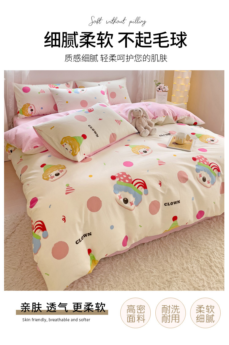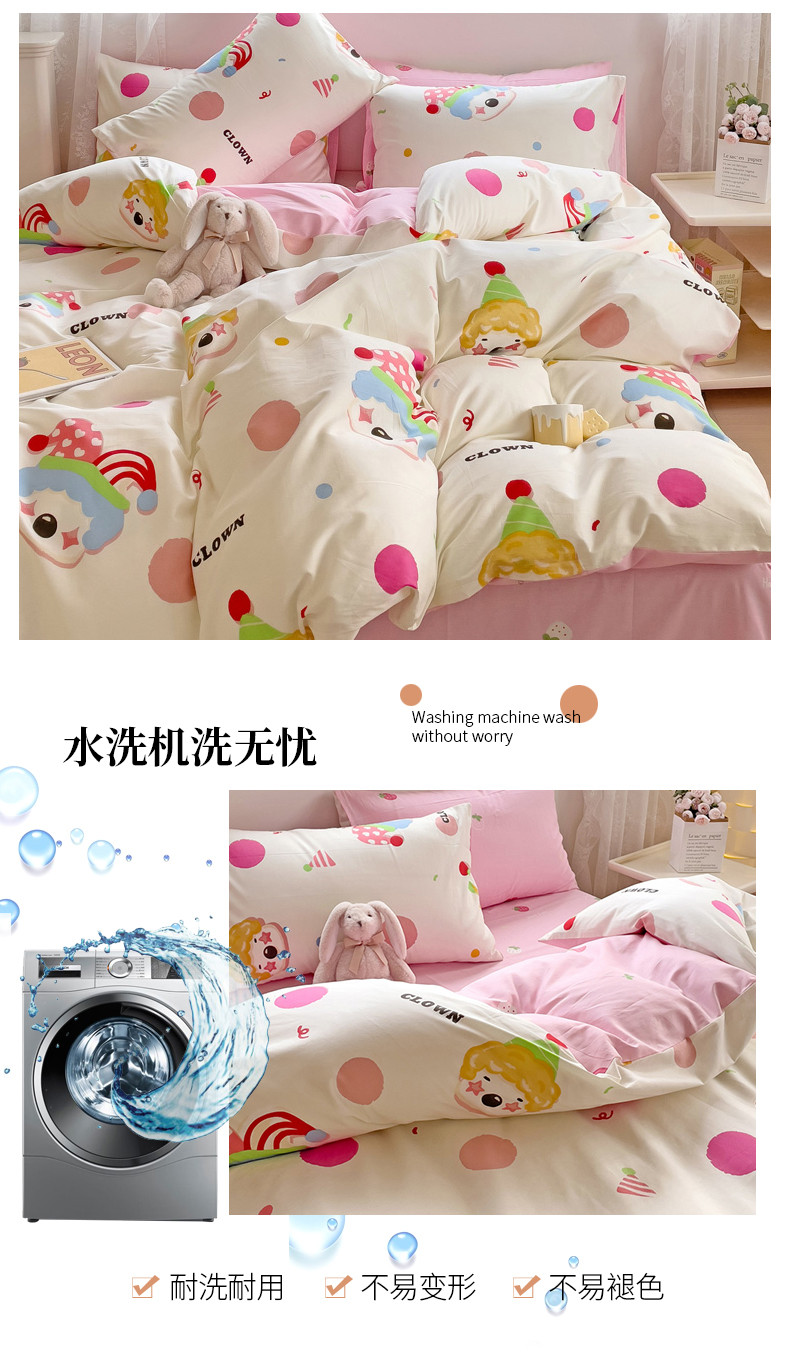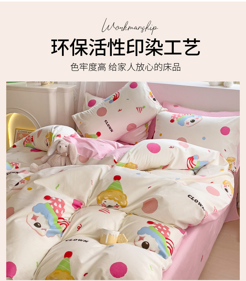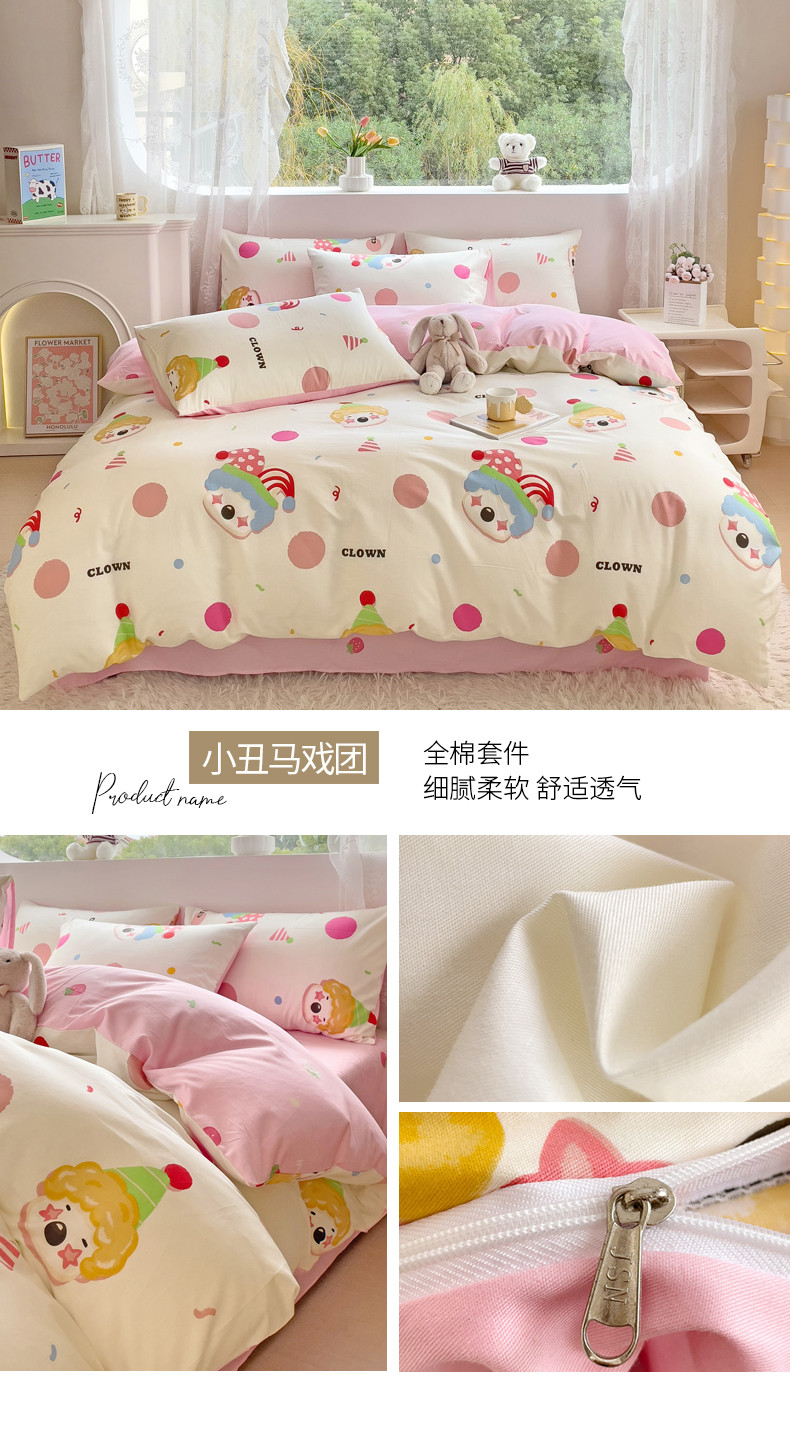 当前位置: 91家纺网 > 商品网购 > 床品套件 > 四件套 > 全棉普通四件套 > 金丝鸟 2023新款全棉可爱卡通印花小清新四件套-第二批 小丑马戏团
