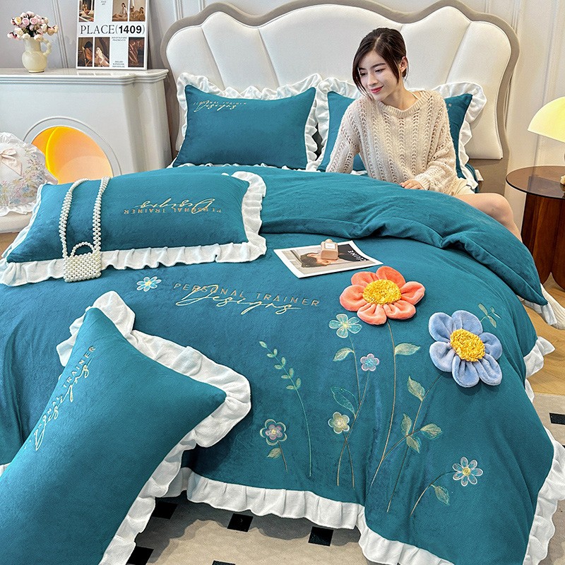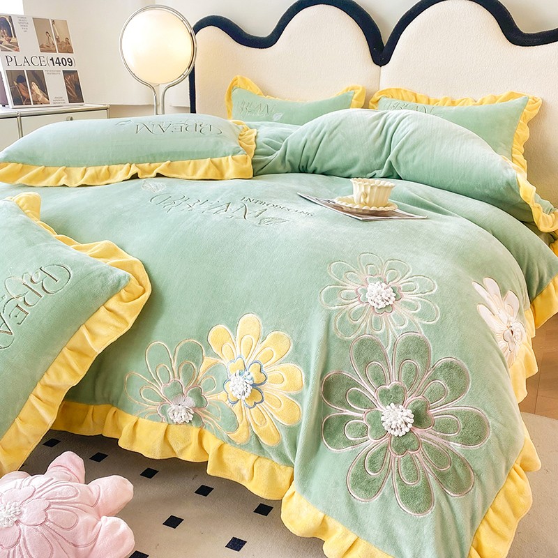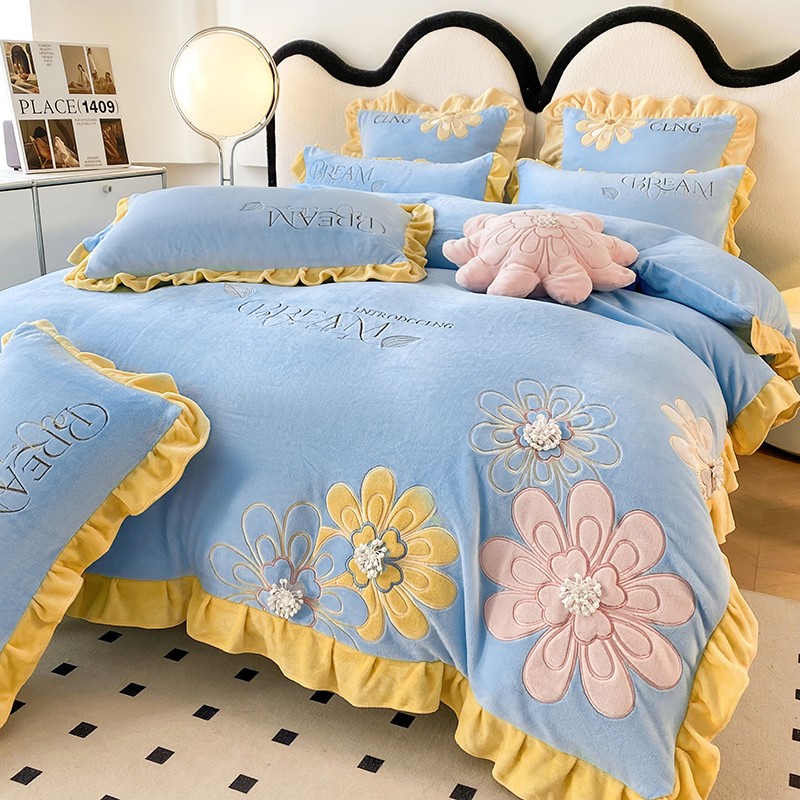 (总)漫布云 2025新款230g高克重韩版立体盘花牛奶蚕丝绒绣花四件套床裙款被套-洛丽塔系列,洛丽塔-嫩黄 ,洛丽塔-香芋紫 , 洛丽塔-珍珠粉,洛丽塔-婴儿蓝