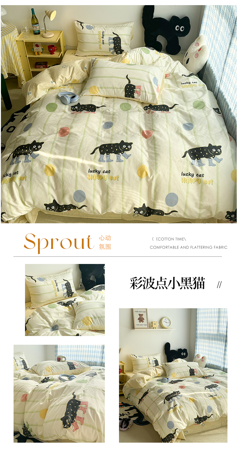 商品名称:昔可家纺 2024新款全棉萌趣卡通印花系列四件套 彩波点小黑猫