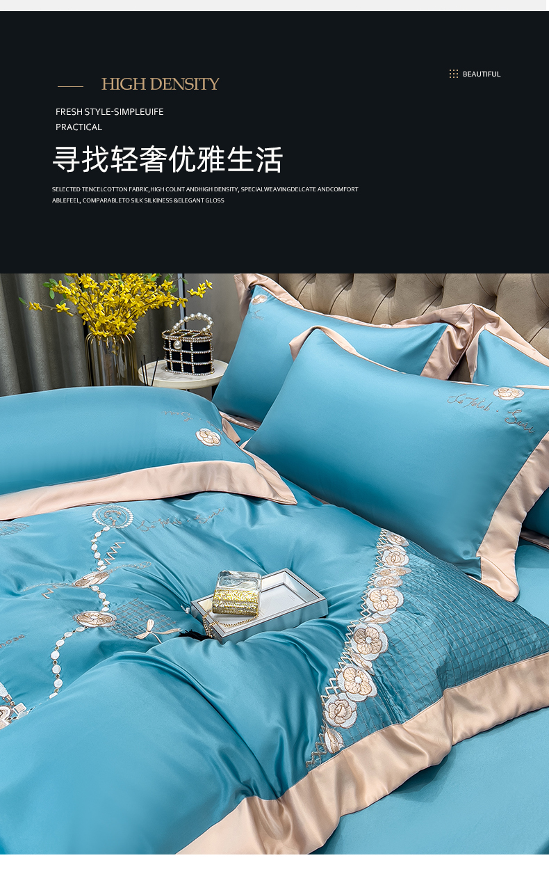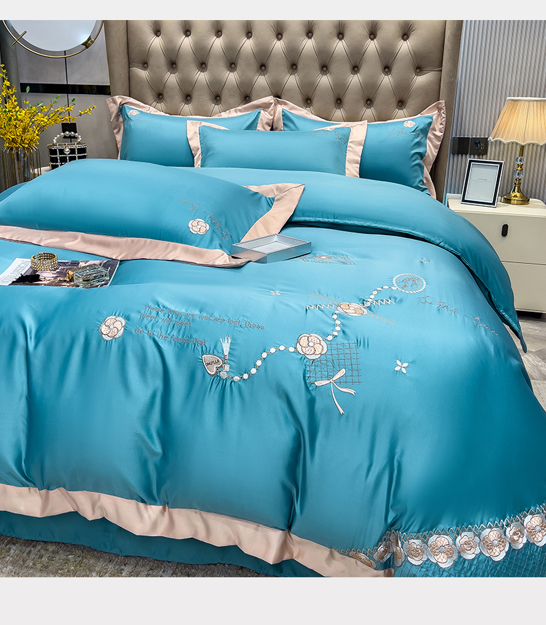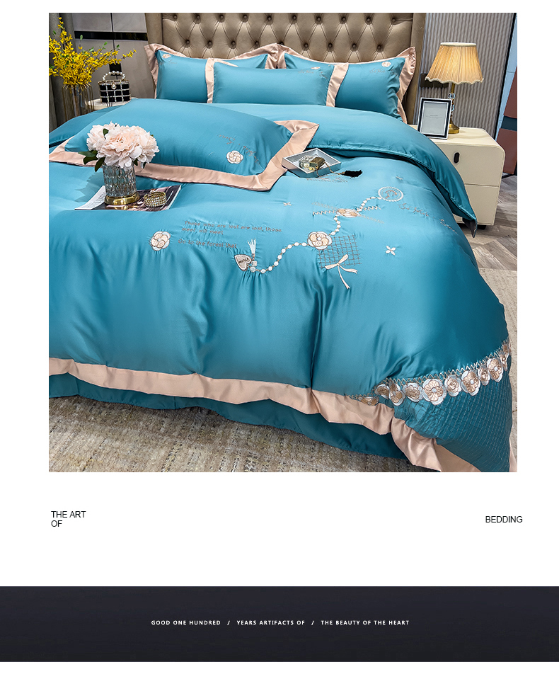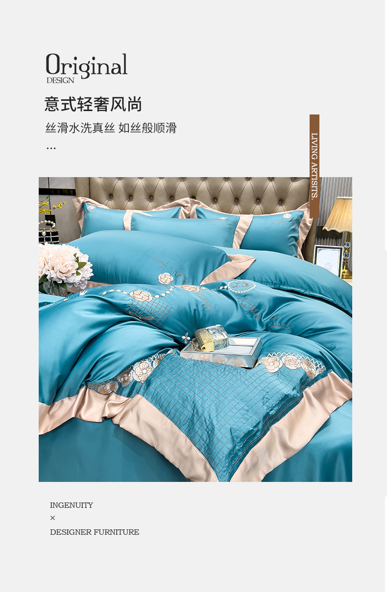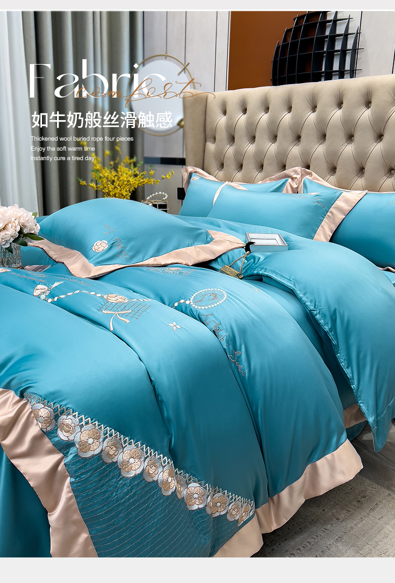 欧冠家纺 2024新款绣花水洗真丝四件套莱娅四件套 莱娅-孔雀蓝