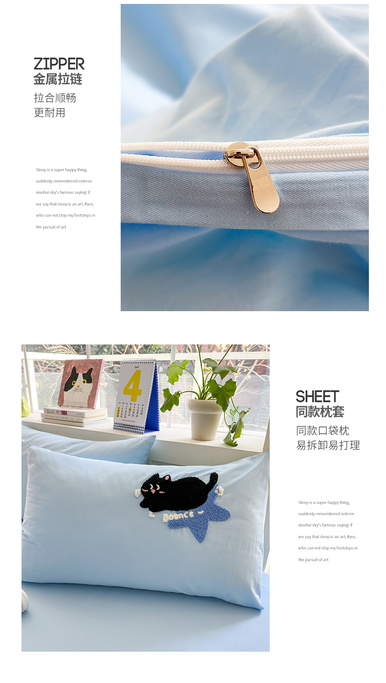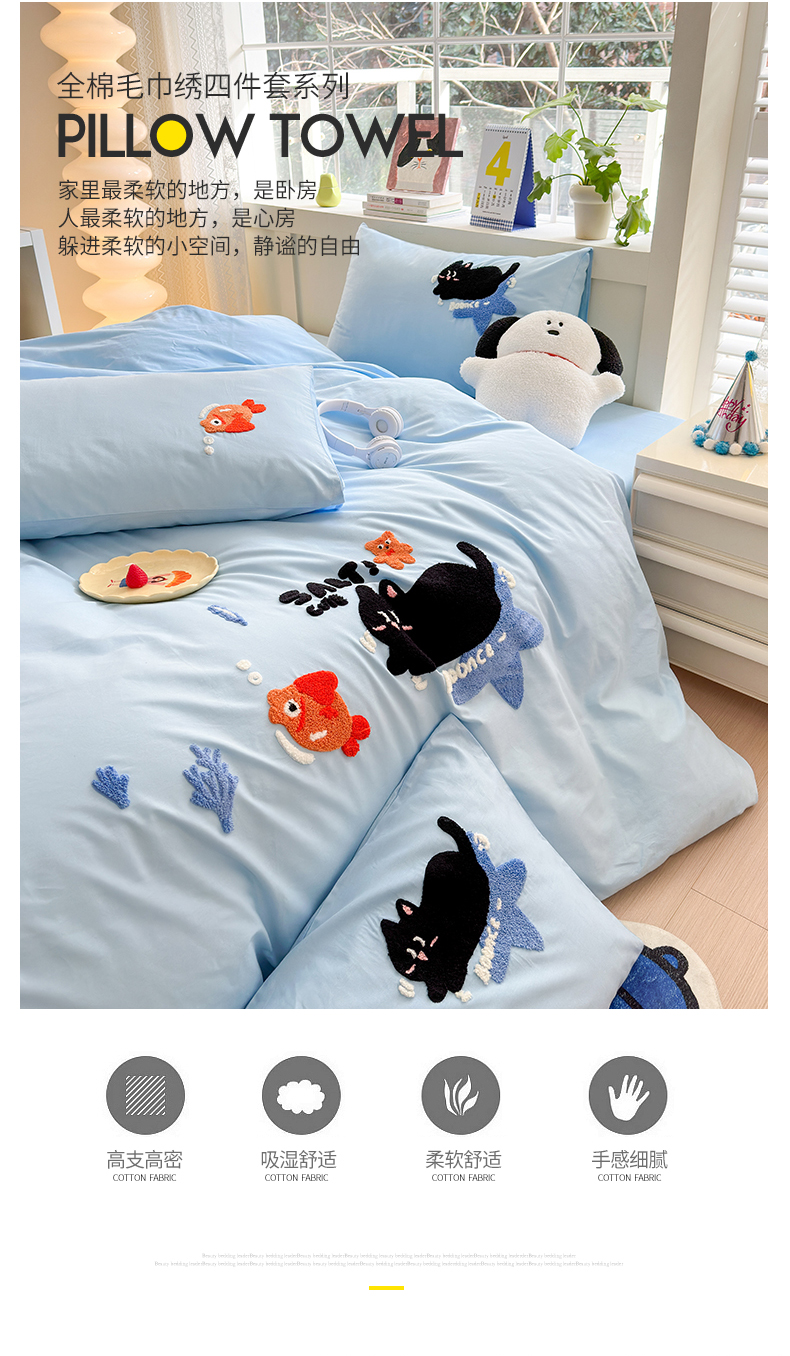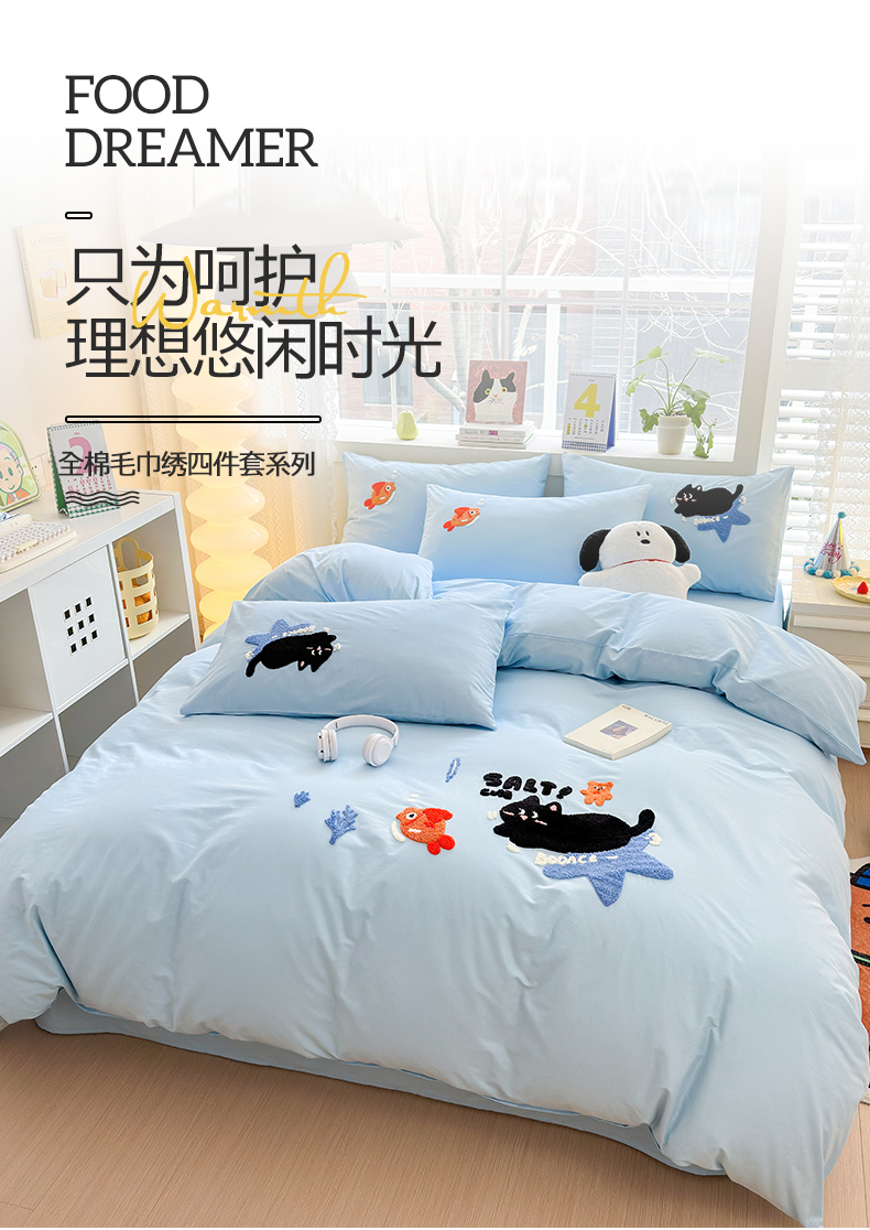 当前位置: 91家纺网 > 商品网购 > 床品套件 > 四件套 > 全棉普通四件套 > 锦觅 2024春夏新品韩式小清新全棉水洗棉毛巾绣40支重工刺绣纯棉四件套 猫咪(天蓝)