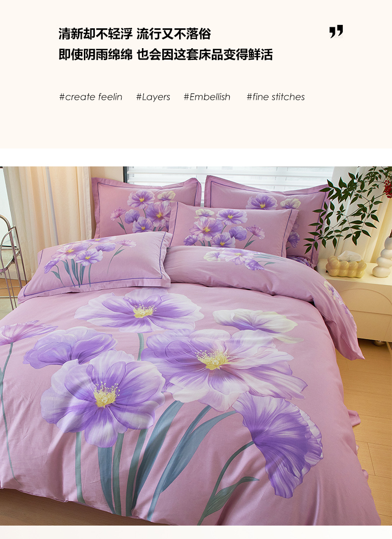 (总)启航家居 2025新款全棉铂金棉数码印花四件套,风香花倦,花的嫁纱,洛香忆梦绿,暮云春树灰,翩若惊鸿粉,普罗旺斯紫,新塞纳舞曲红,新塞纳舞曲紫