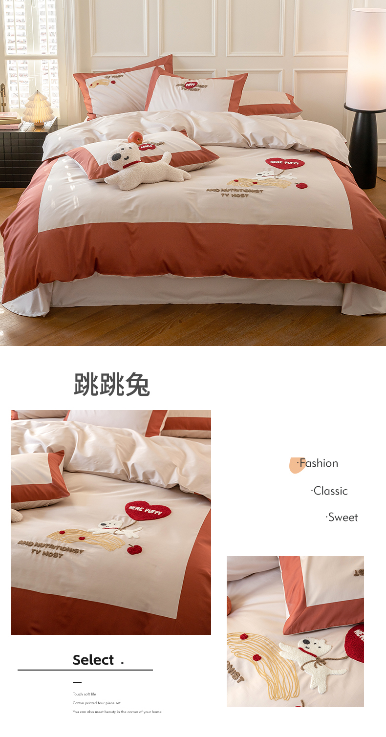 商品名称:泽西家纺 2024新款全棉水洗棉毛巾绣大拼角四件套 跳跳兔