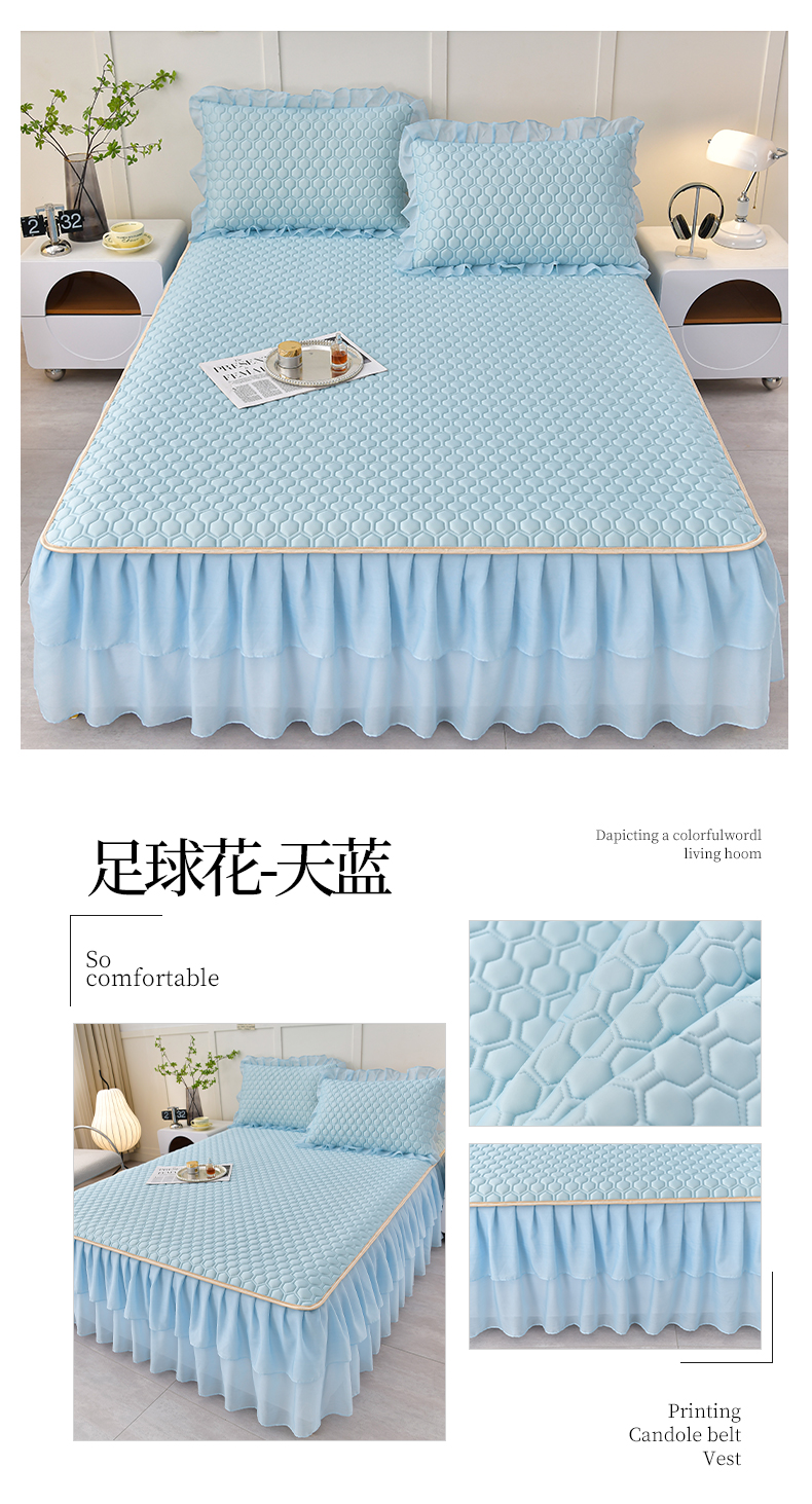 商品名称:民新 2025直播爆款韩版花边纯色小清新乳胶凉席床裙三件套 足球花-天蓝