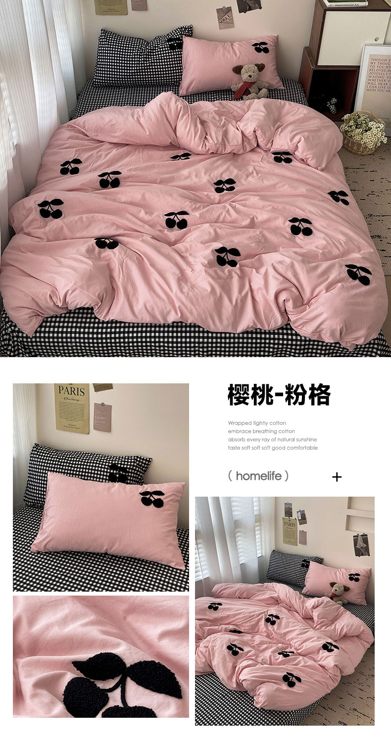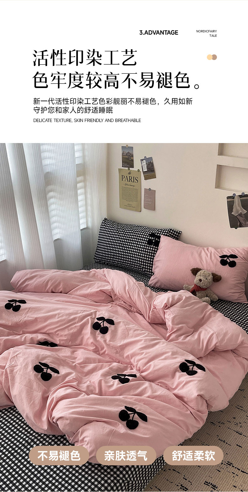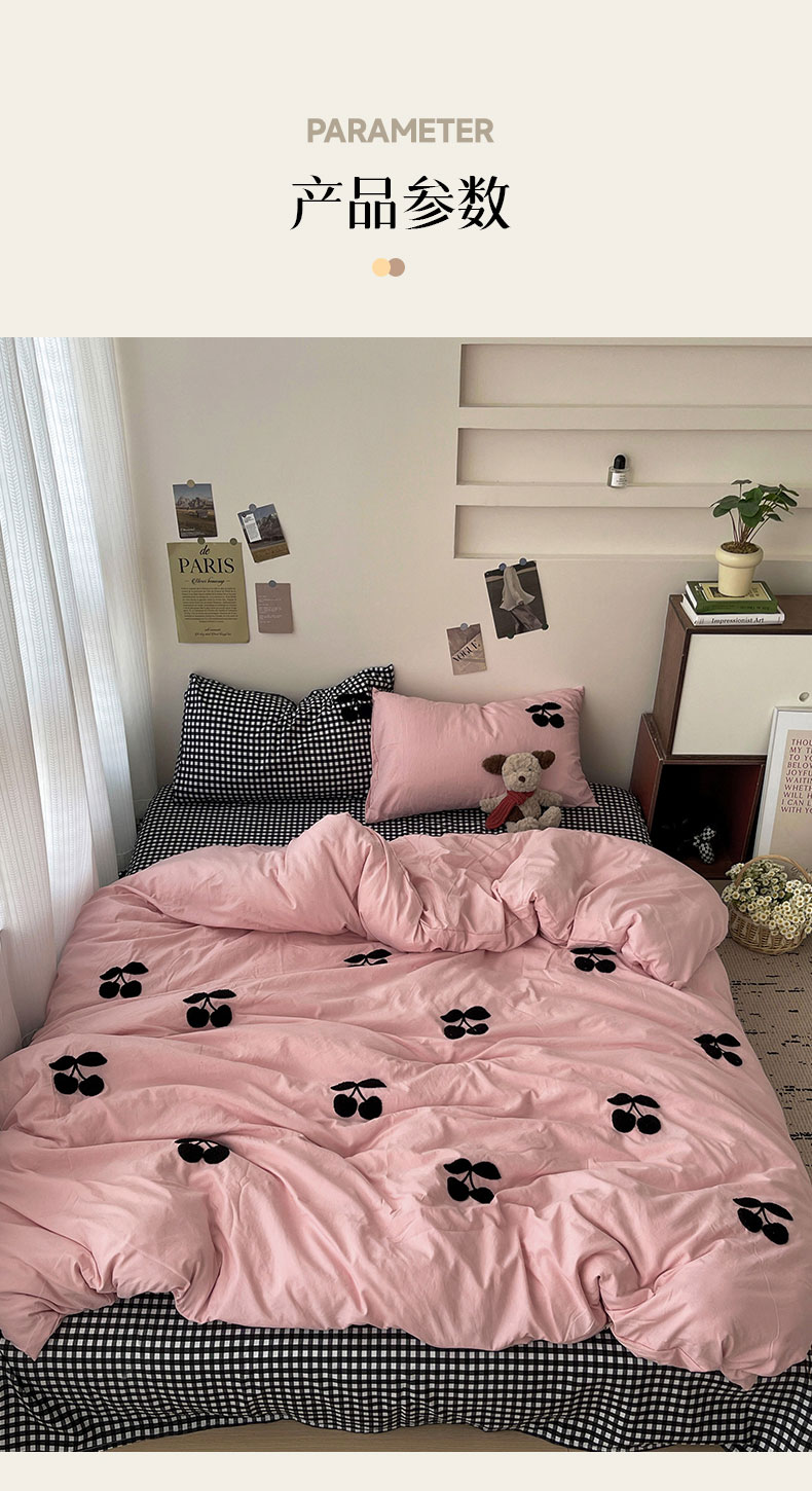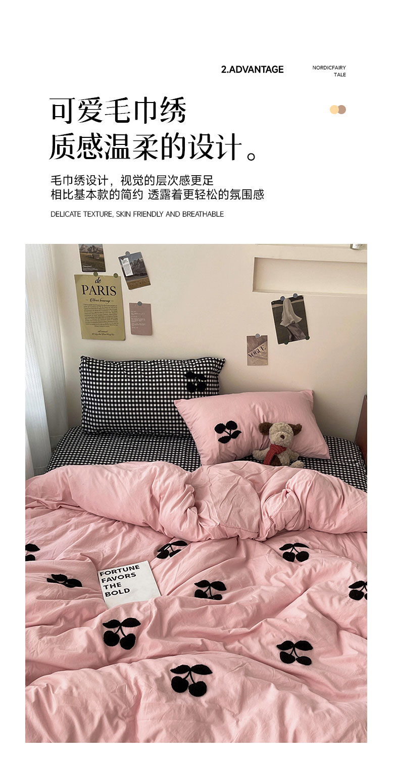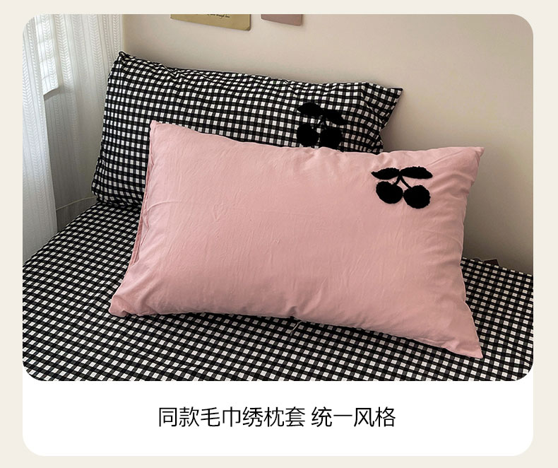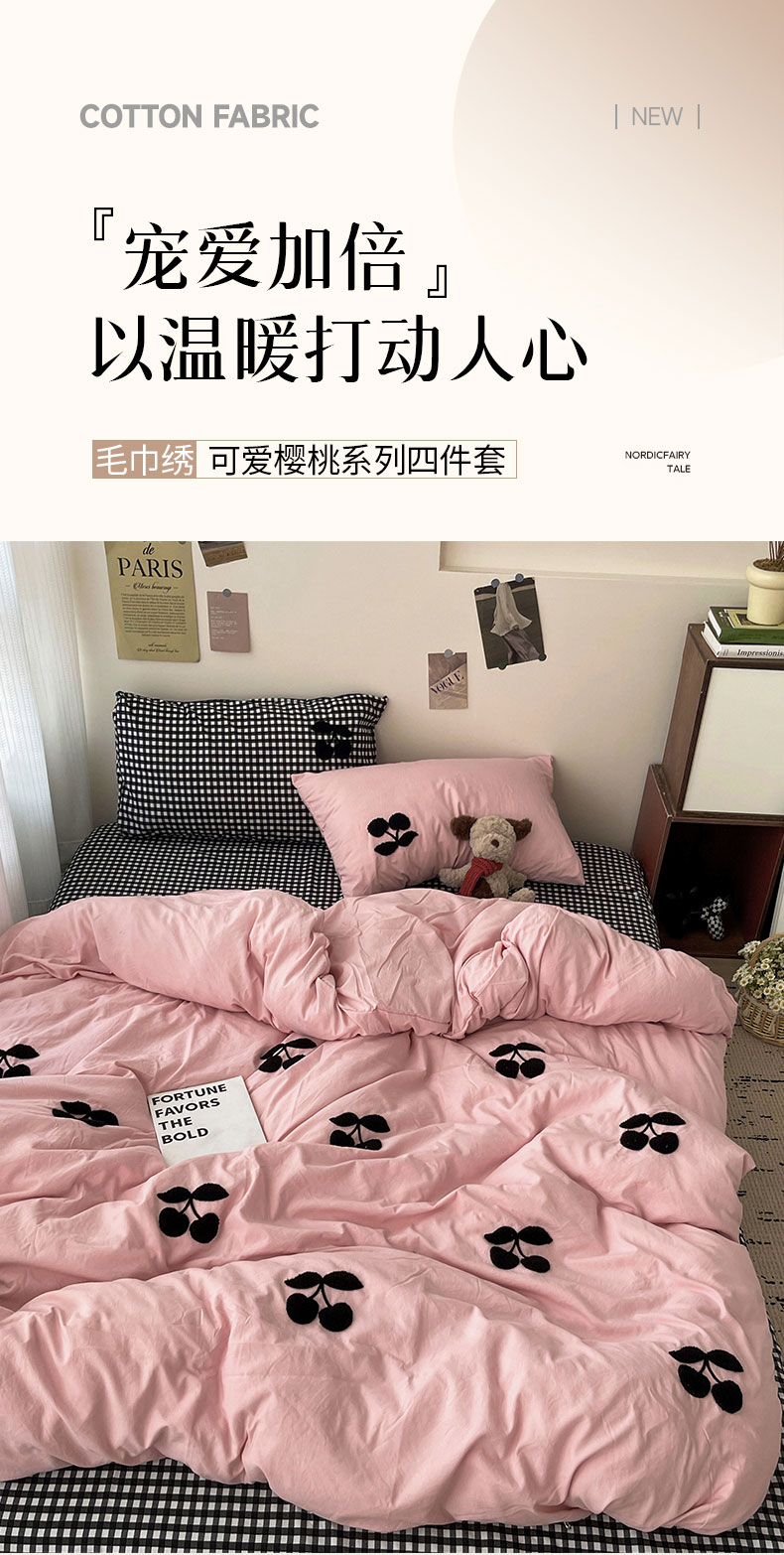 当前位置: 91家纺网 > 商品网购 > 床品套件 > 四件套 > 水洗棉四件套 > 尤米 2024新款可爱樱桃系列水洗棉毛巾绣四件套 樱桃-粉格