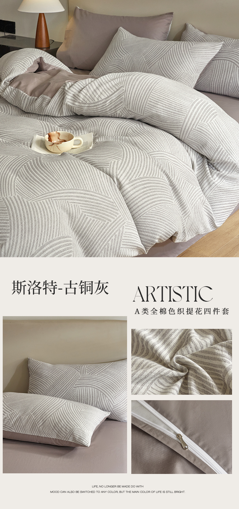 当前位置: 91家纺网 > 商品网购 > 床品套件 > 四件套 > 全棉普通四件套 > 慕色家纺 2024新款A类全棉色织提花四件套系列 斯洛特-古铜灰