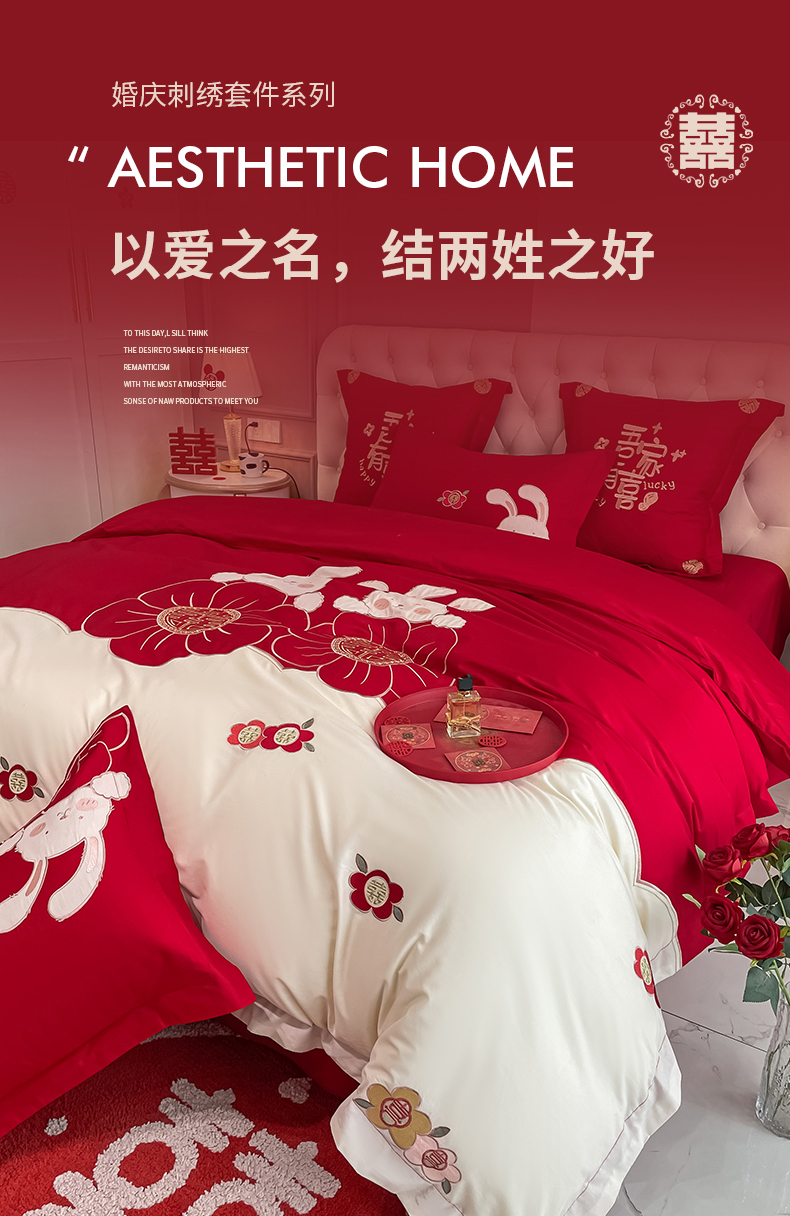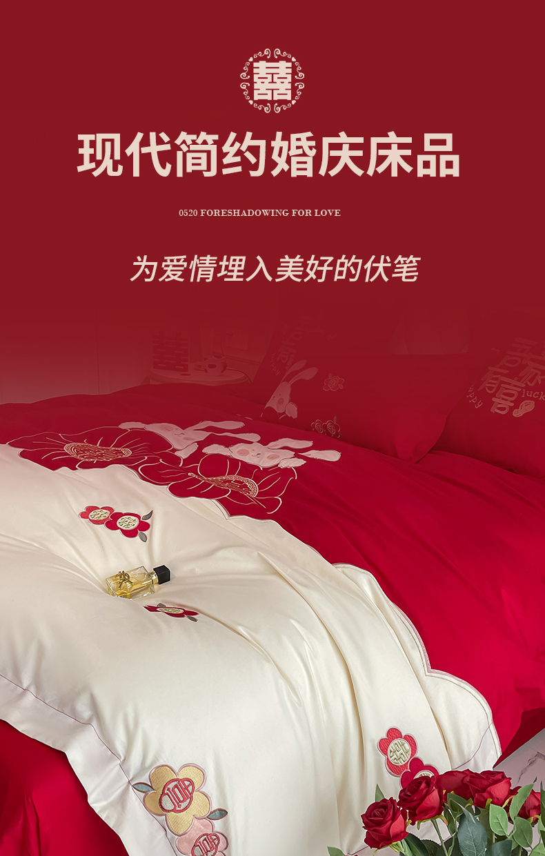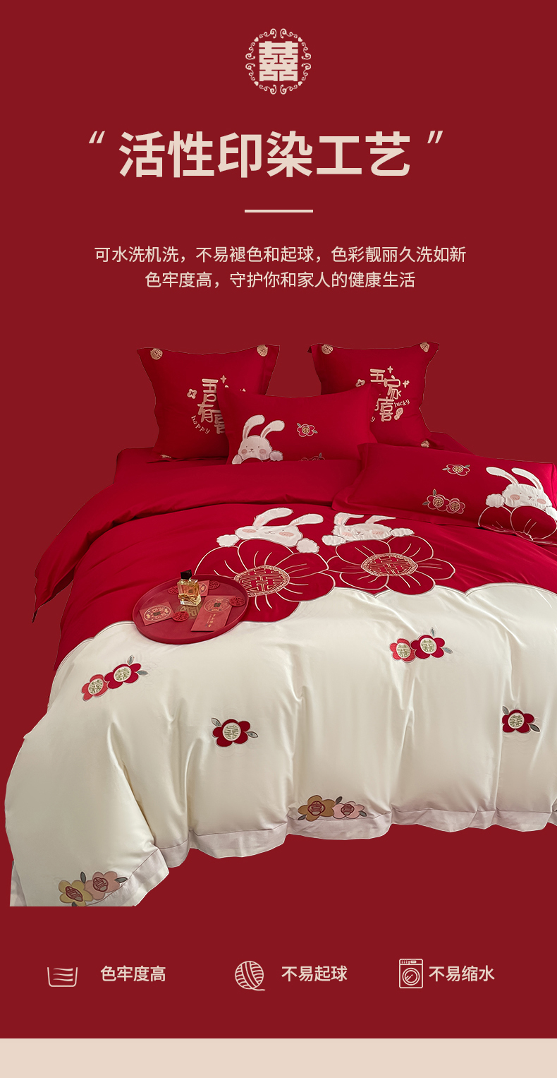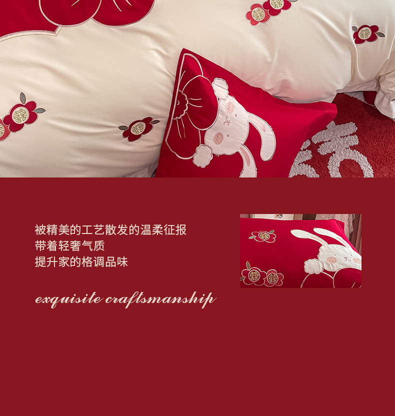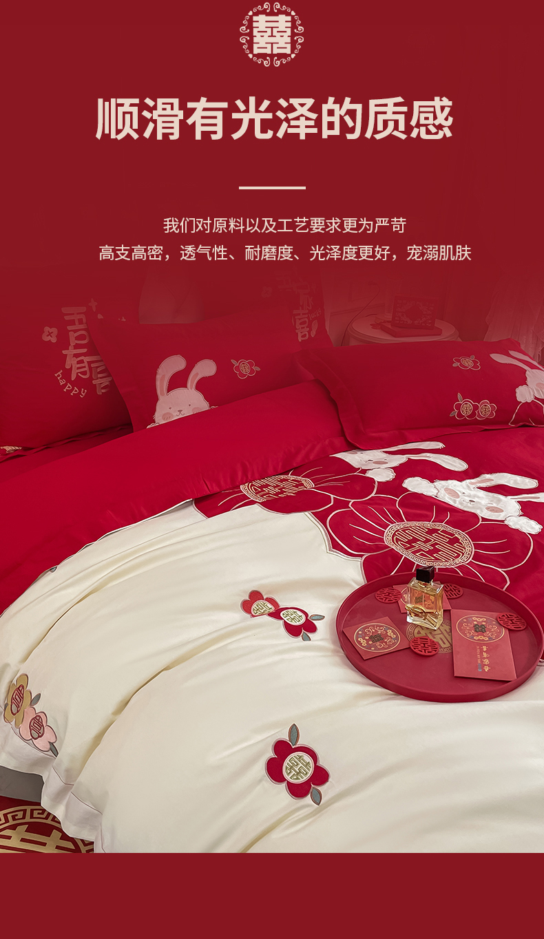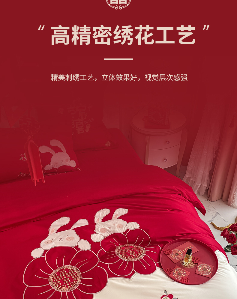 当前位置: 91家纺网 > 商品网购 > 床品套件 > 四件套 > 婚庆四件套 > 玉雅家纺 2025新款60支长绒棉时尚拼色浮雕刺绣婚庆四件套 兔吉祥