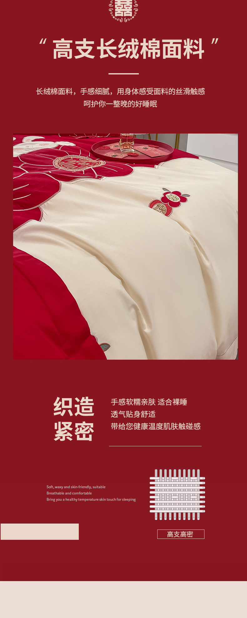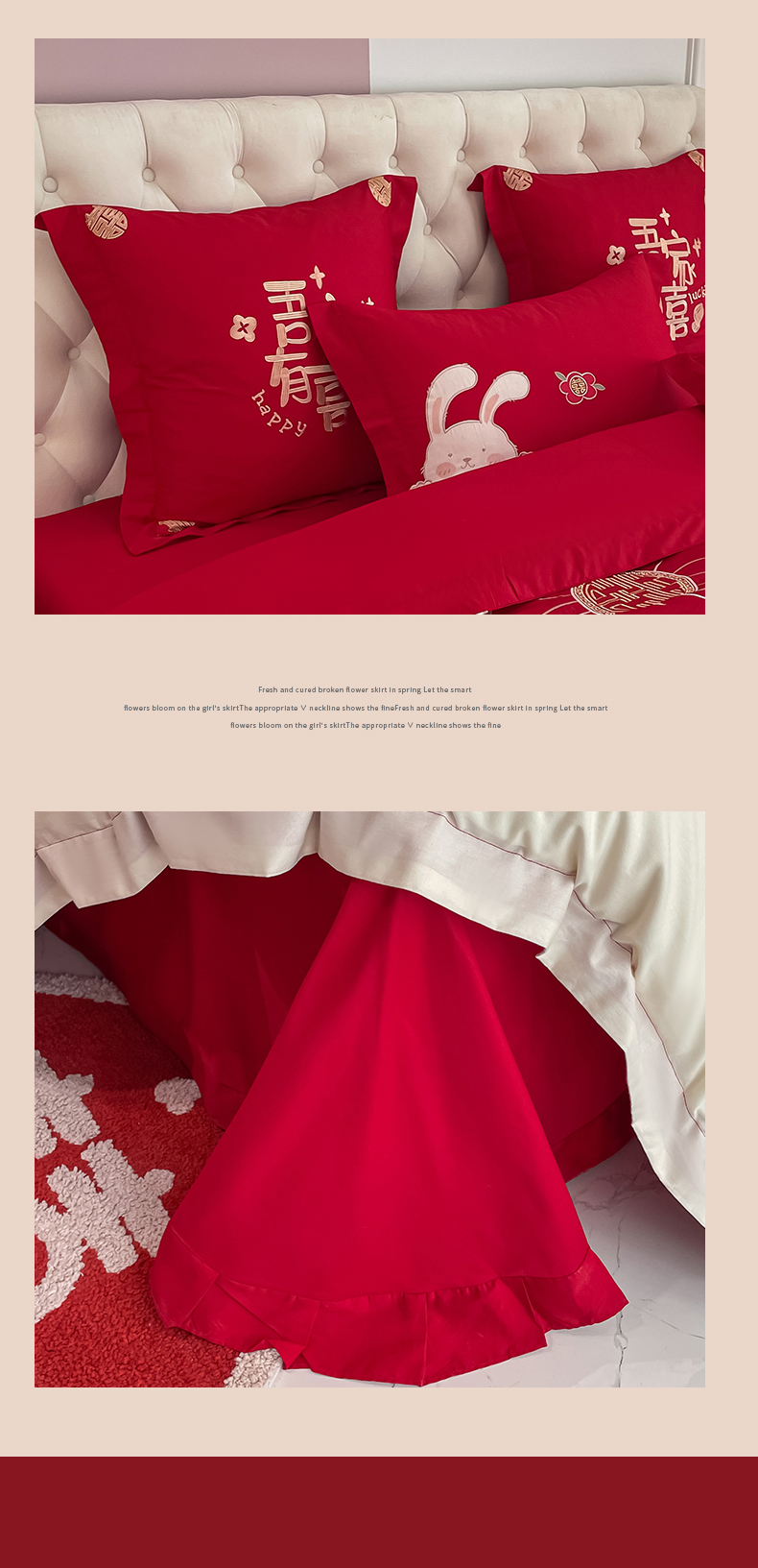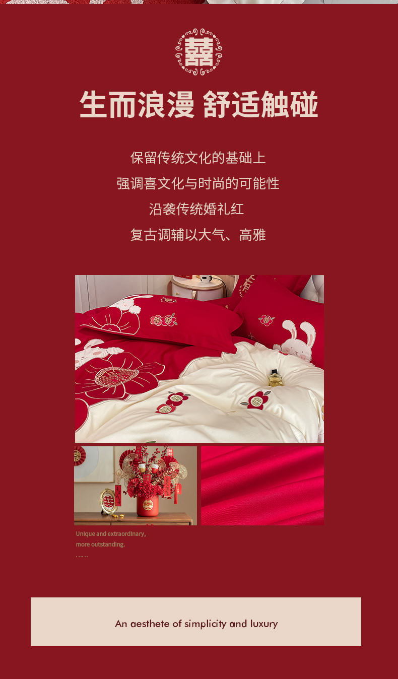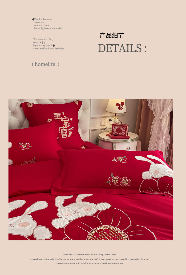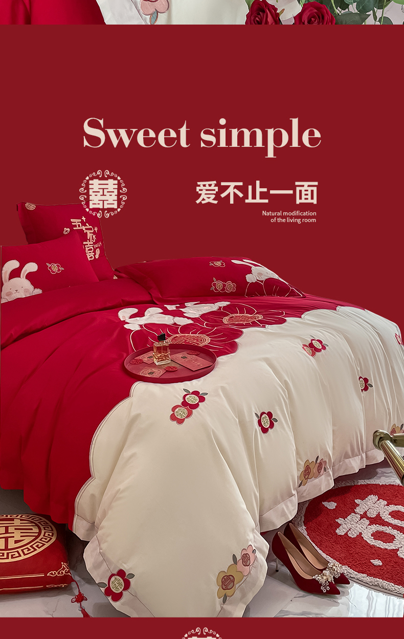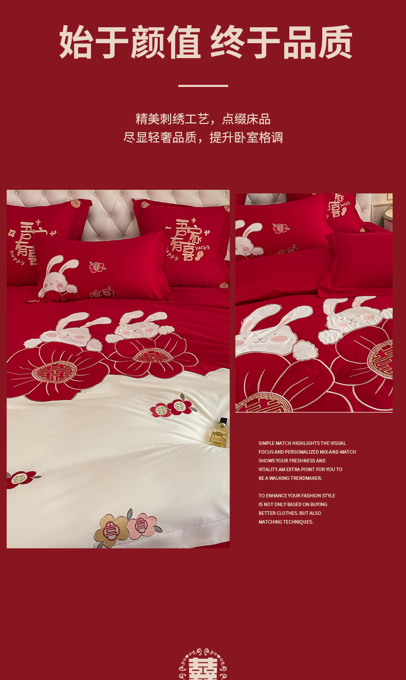 当前位置: 91家纺网 > 商品网购 > 床品套件 > 四件套 > 婚庆四件套 > 玉雅家纺 2025新款60支长绒棉时尚拼色浮雕刺绣婚庆四件套 兔吉祥