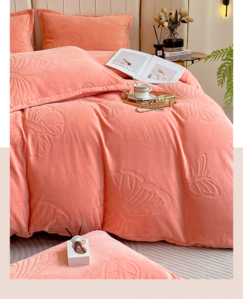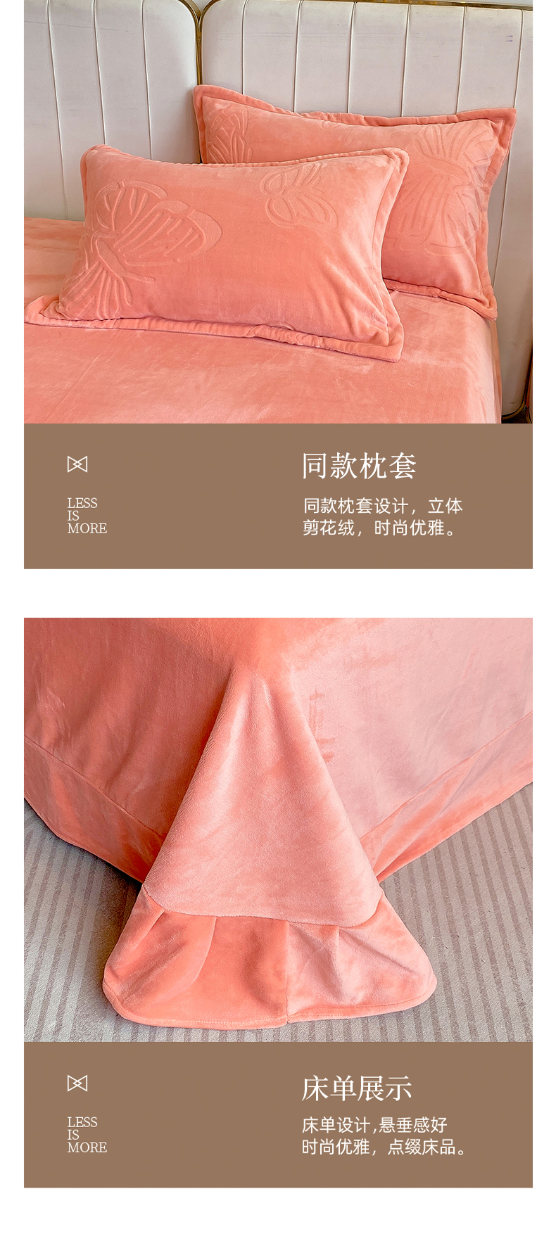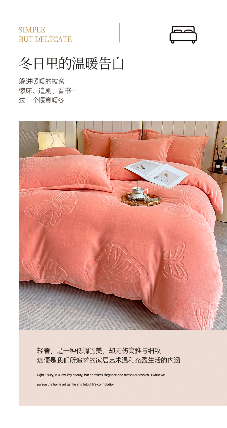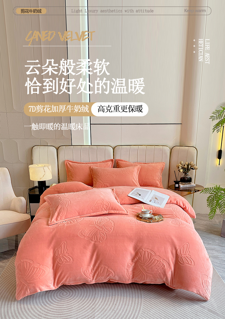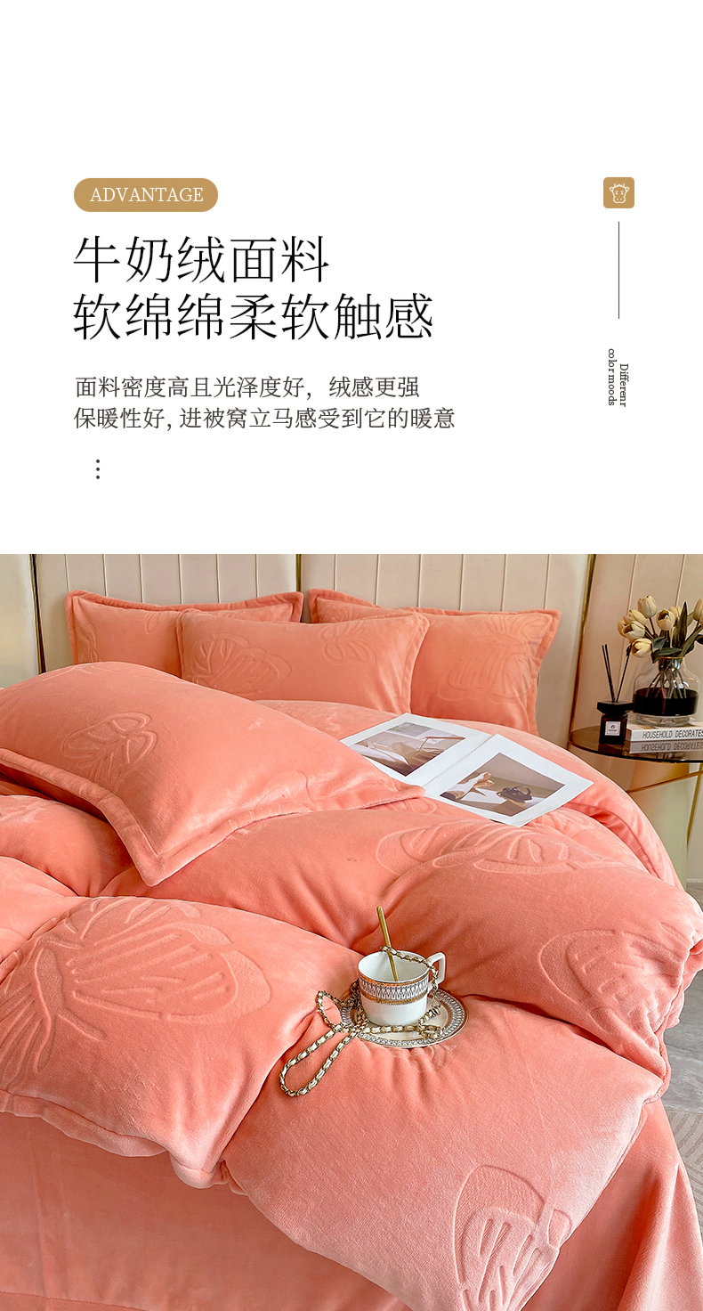 商品名称:一左一右 2024新款高克重加厚230克剪花雕花牛奶绒四件套7D立体蝴蝶纯色简约床笠 迷人粉