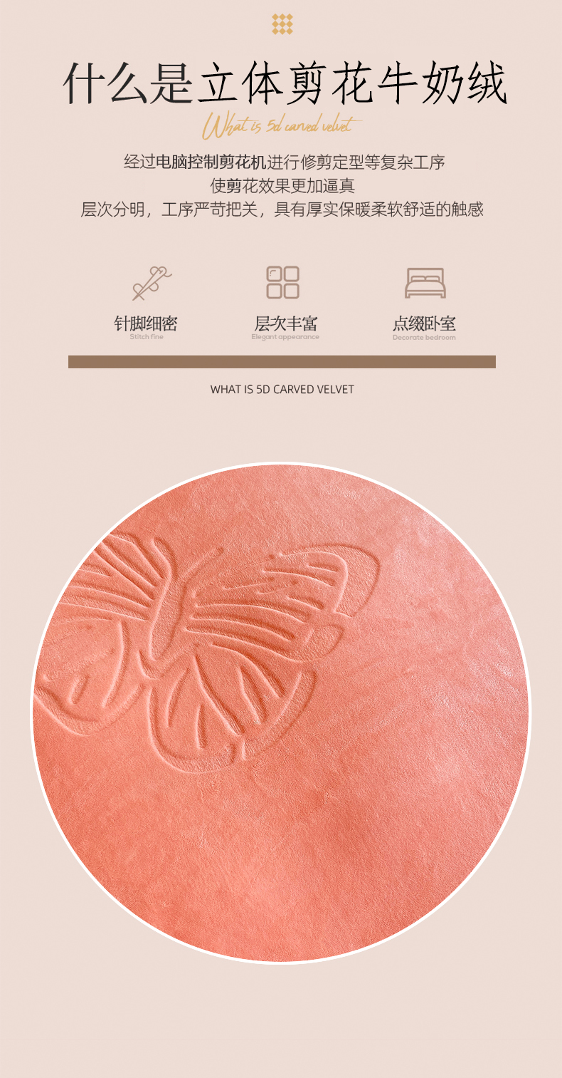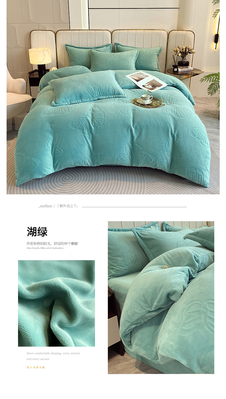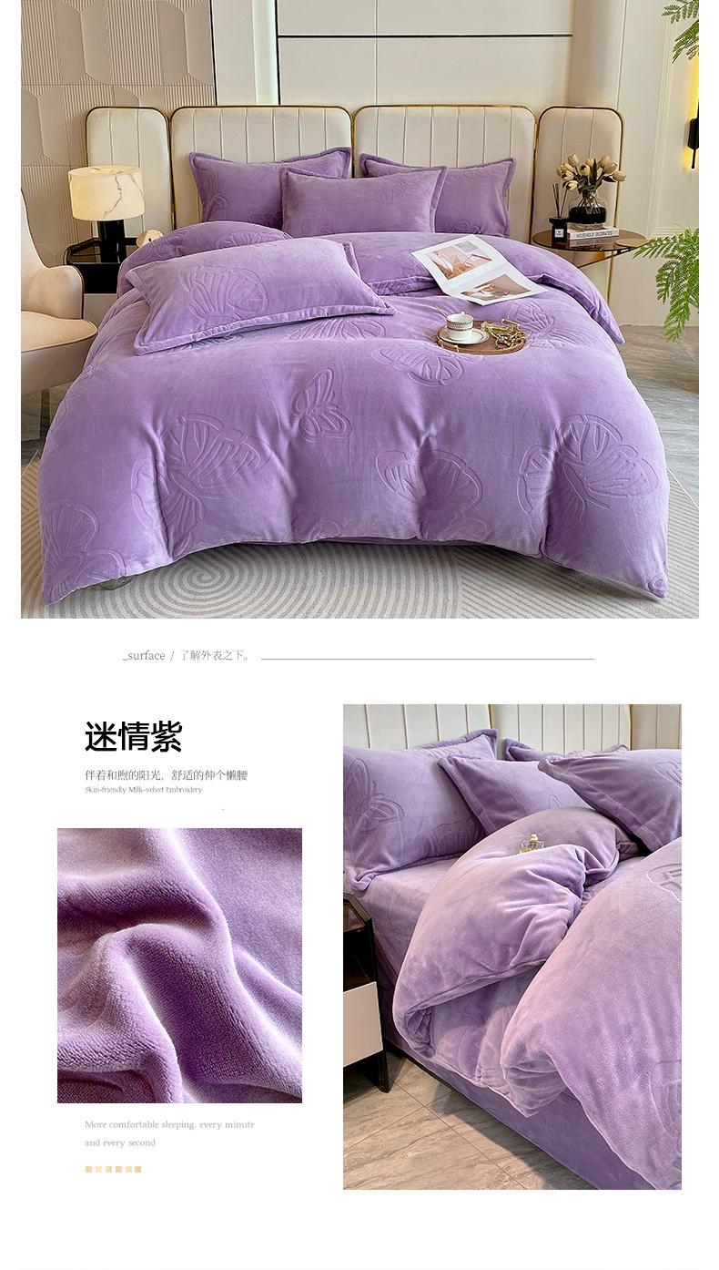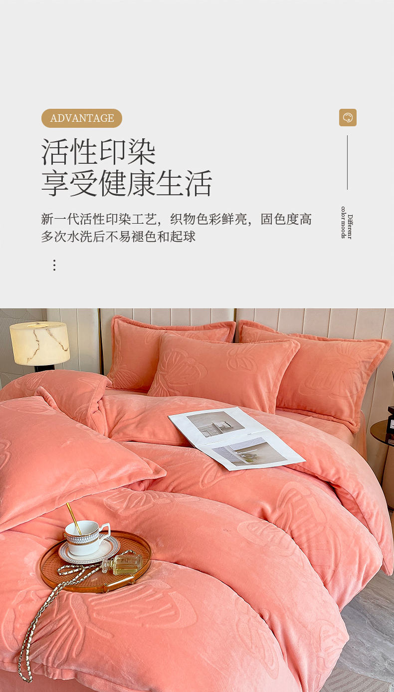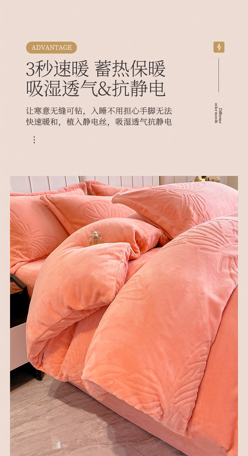 商品名称:一左一右 2024新款高克重加厚230克剪花雕花牛奶绒四件套7D立体蝴蝶纯色简约床笠 迷人粉
