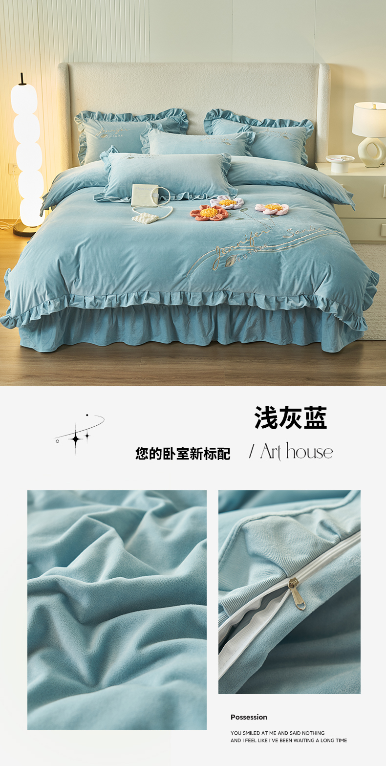 (总)恒爱 2022新款秋冬轻奢宝宝绒刺绣床裙款四件套,爱玛橙,宾利蓝,豆沙红,橄榄绿,高级灰,酒红,梦想粉,浅灰蓝,温馨粉,喜庆红,香妃粉,香芋紫