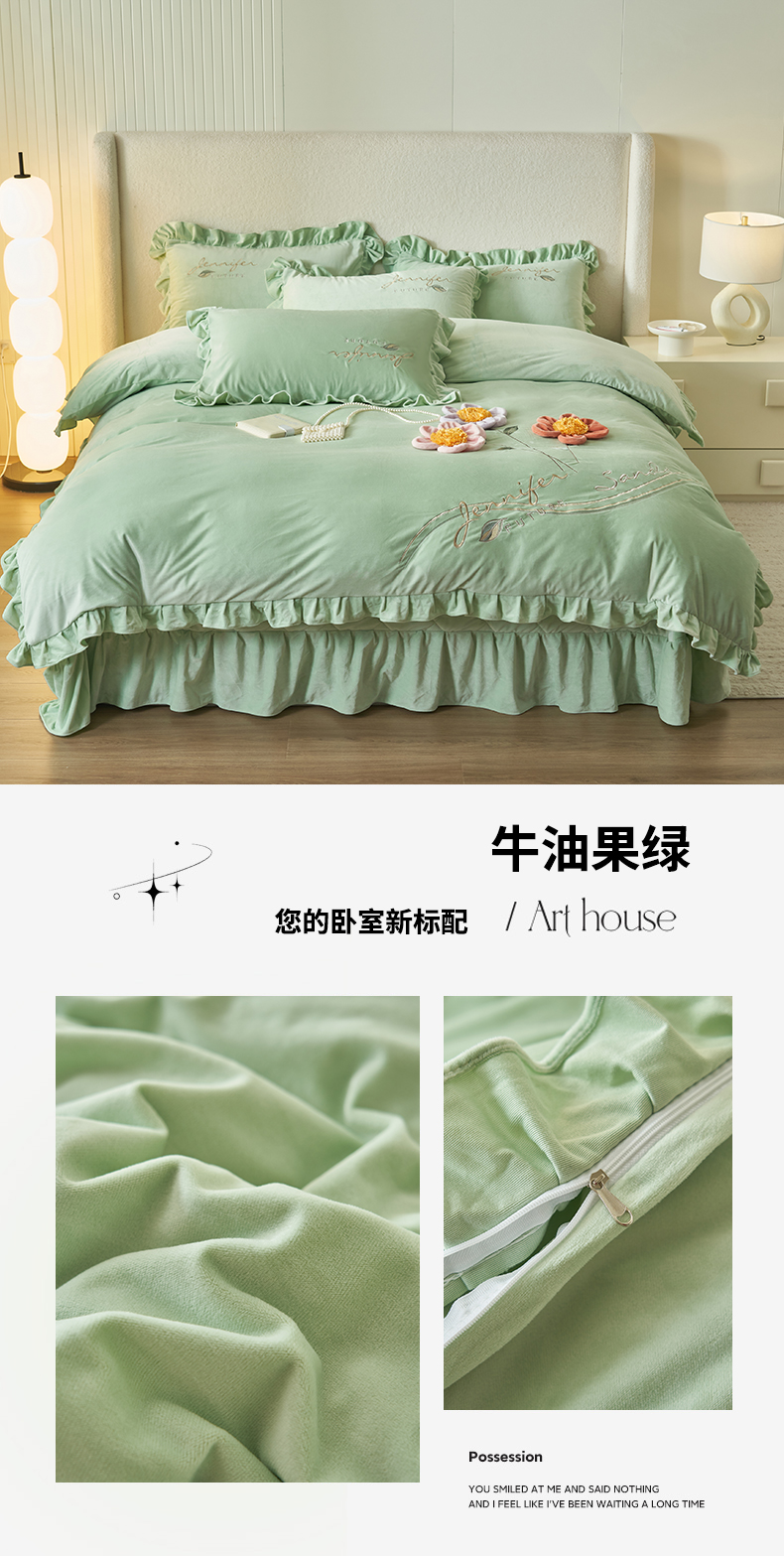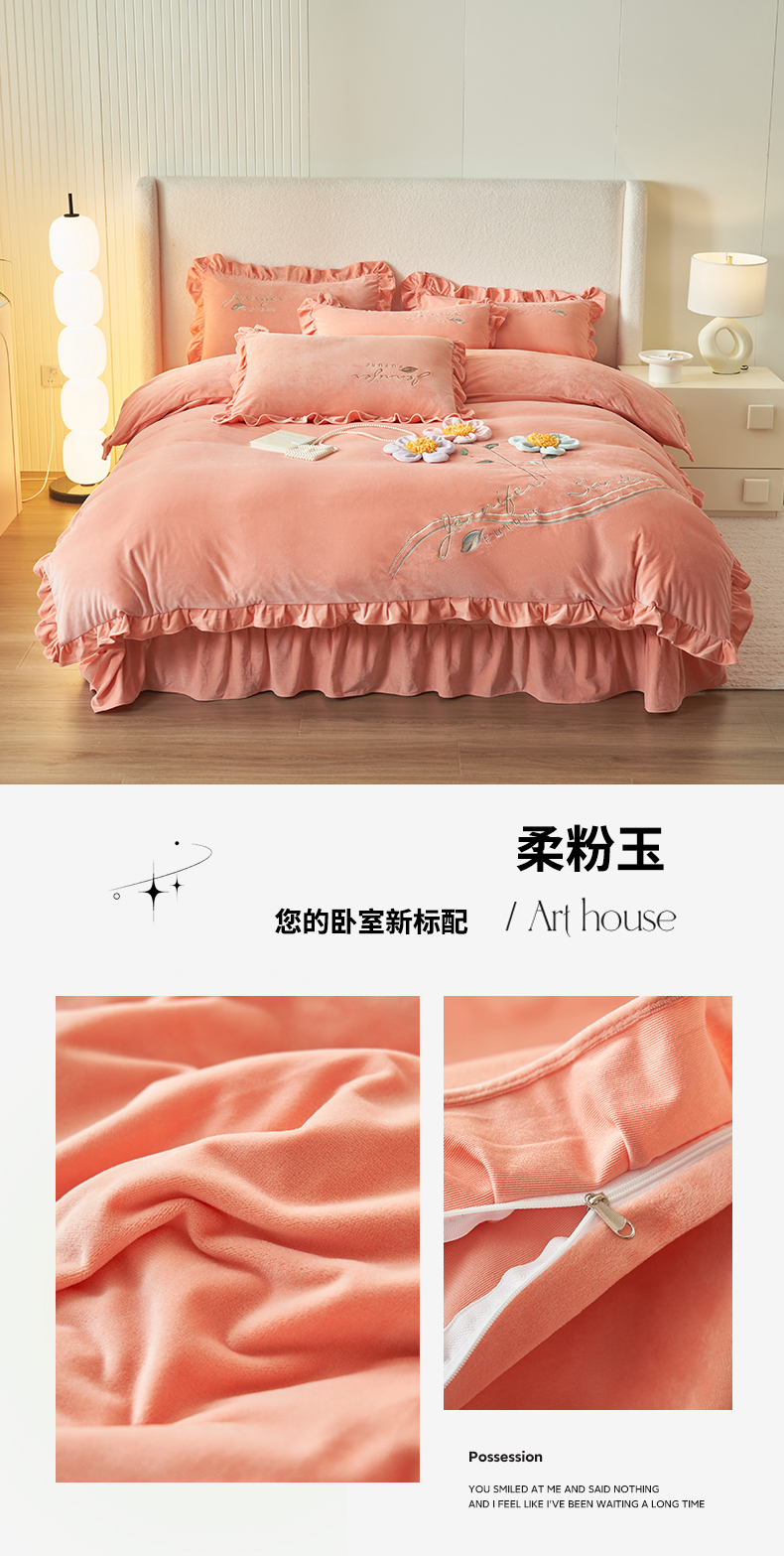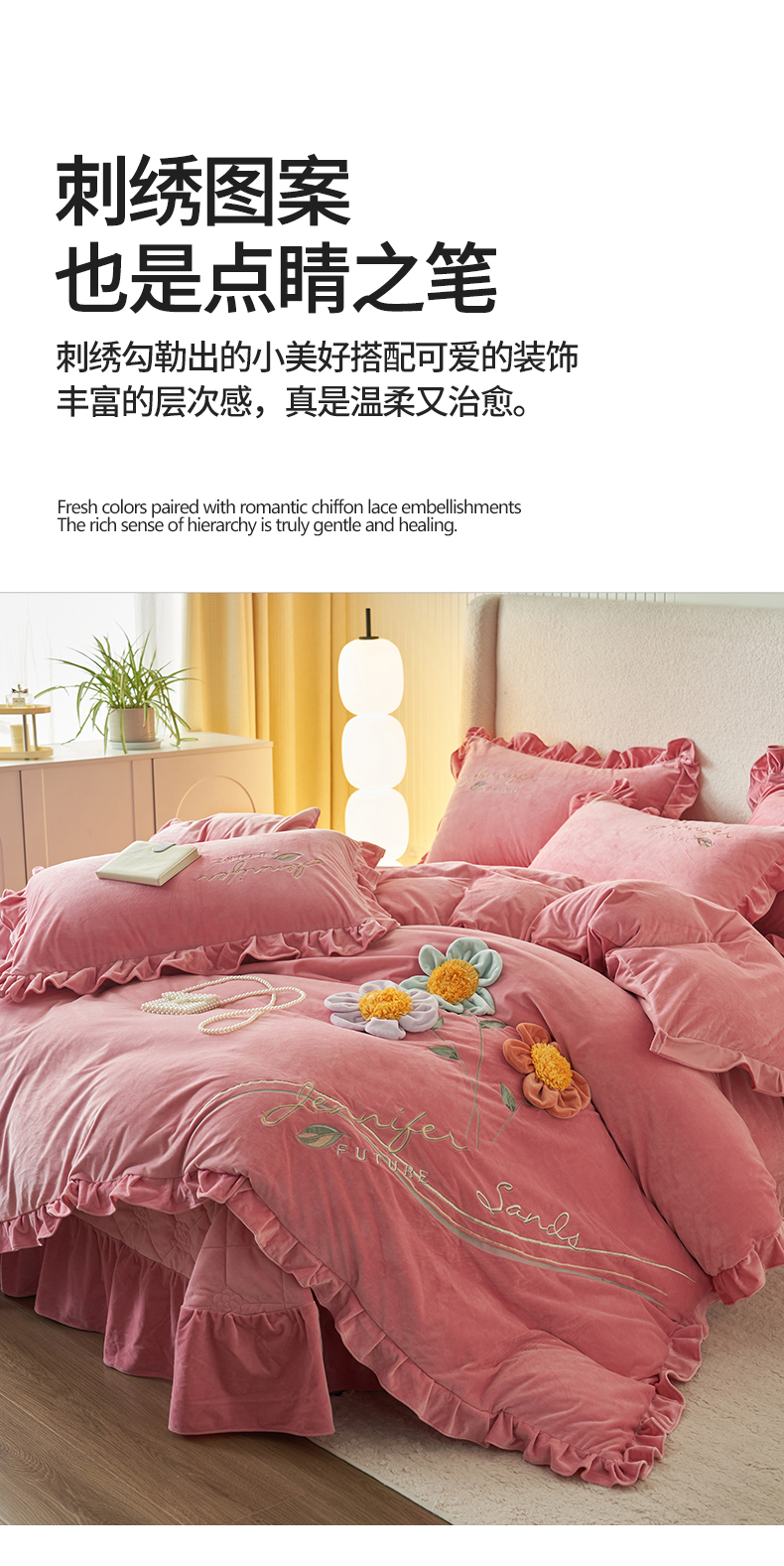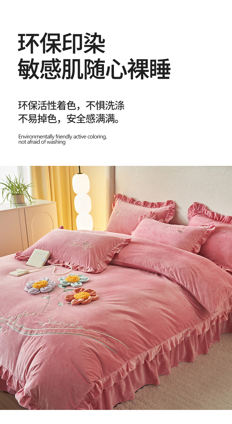 (总)恒爱 2022秋冬水晶绒翩翩花舞夹棉床裙四件套,大红色,豆沙红,橄榄绿,公主粉,桔色,咖啡色,孔雀绿,拉菲红,罗兰紫,玫红色,美人玉,米白色,米驼色,抹茶绿,浅灰色,紫色