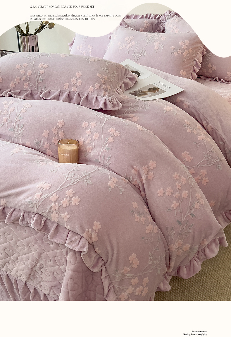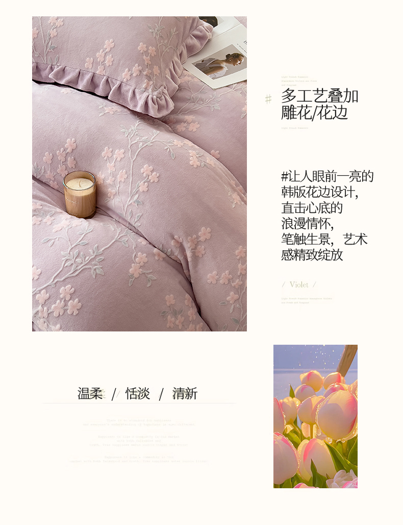 2024新品A类牛奶绒韩版雕花四件套 梨花海棠-紫