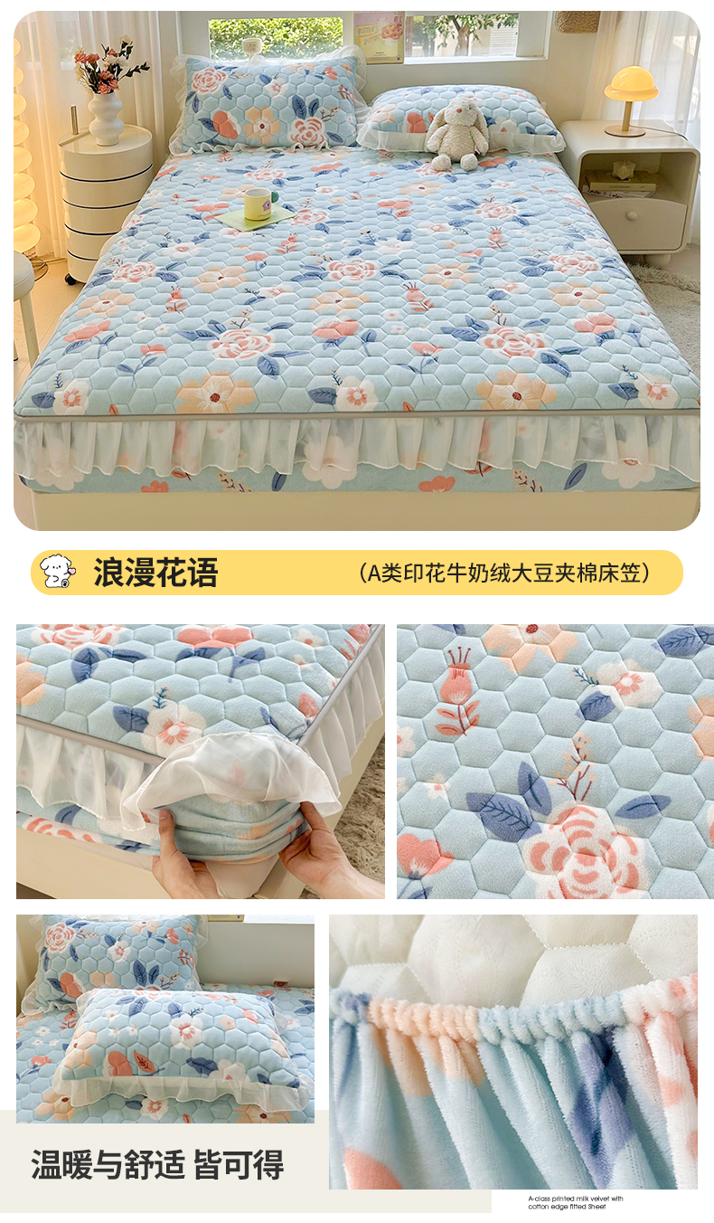 • 91家纺网 家纺一手货源 找家纺 伊人坊 2024冬季加厚牛奶绒花边夹棉床笠三件套纯色印花花边款床垫保护套 浪漫花语