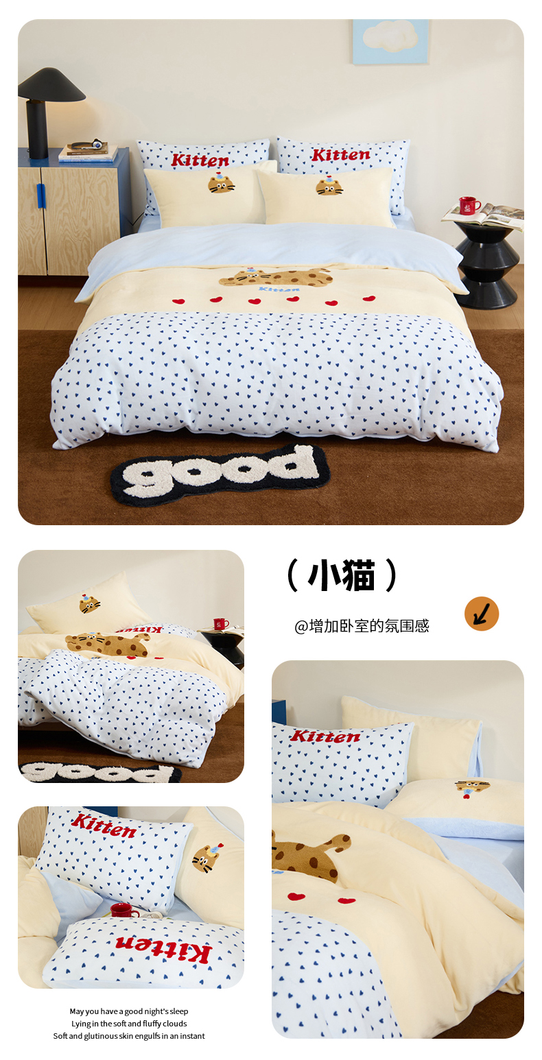 商品名称:呗旺鹿 2024新款高克重小清新拼接款毛巾绣牛奶绒四件套原创 小猫